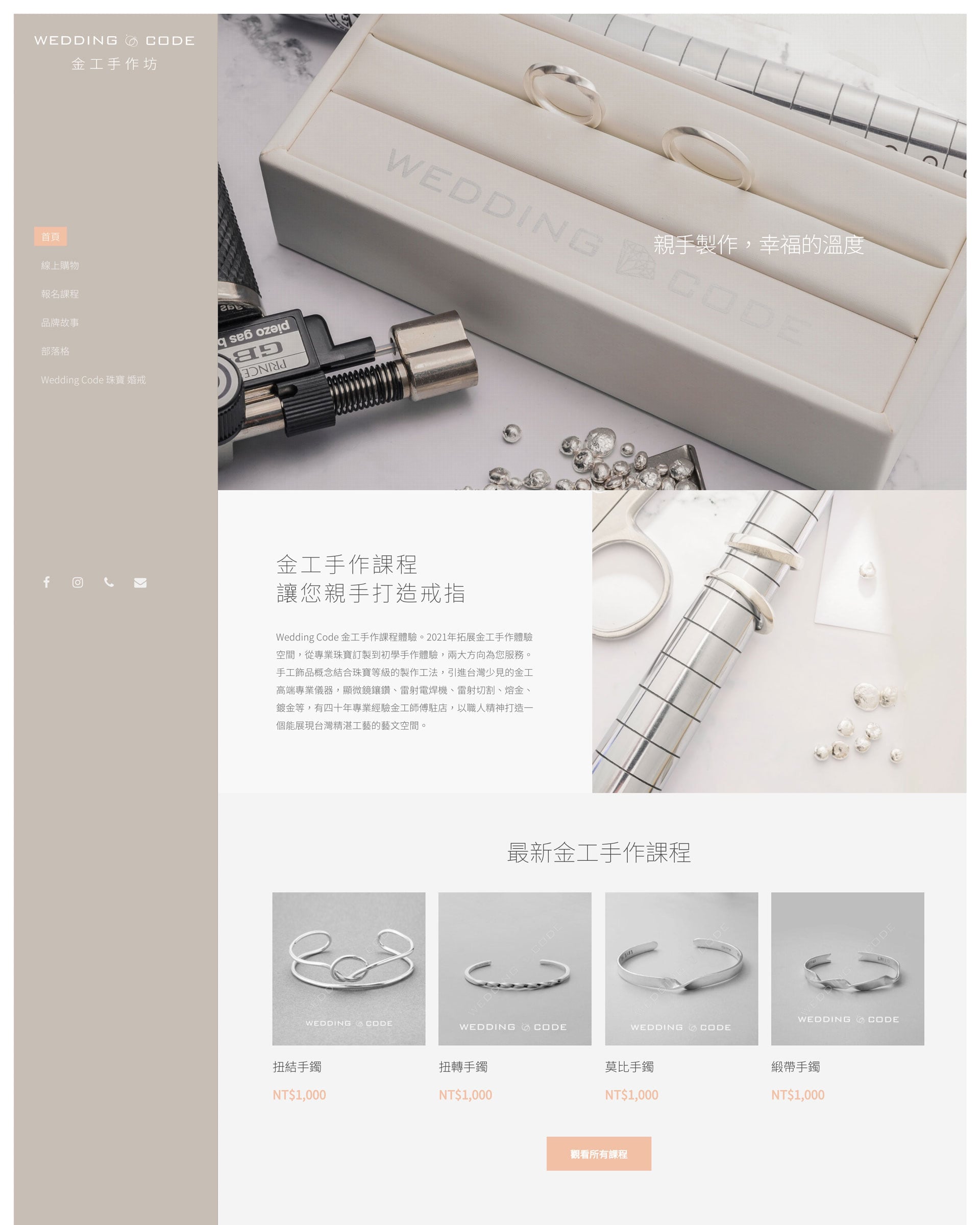 在版面設計上,由於 Wedding Code 是採取單一品牌進行分支,分為「Wedding Code 主站」與「Wedding Code 金工手作坊」這兩個網站,為了讓客人區別兩者的差異,因此在版面設計上,金工手作坊是刻意採用與主站明顯不同的設計,除了選用不同的配色邏輯之外,兩個網站在選單列與 Logo 的佈局也有所差異,但是整體簡約的調性則是維持一致。