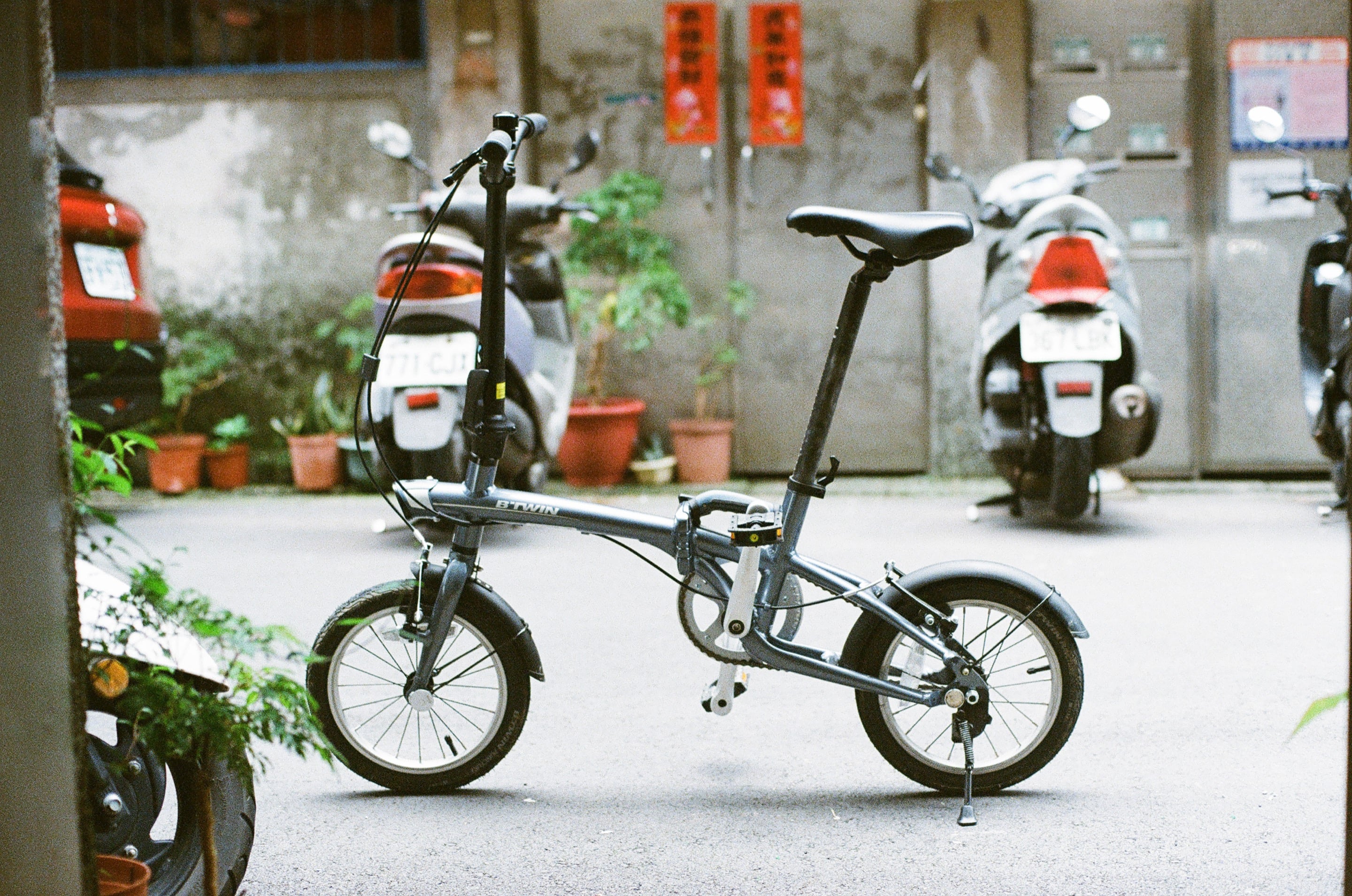 我目前的愛車,迪卡儂 Decathlon Tilt 500 XS,這台不知道為什麼沒什麼討論,但我覺得它非常適合作為陪小孩騎的車,因為 14 吋的輪子騎不快,但扭力強,上坡不需要變速,所以整車重量可以壓得很輕,8kg 而已,和一般的公路車差不多重,騎去便利商店買東西或取貨都非常方便(ISO 400、f2.8、1/1000s)