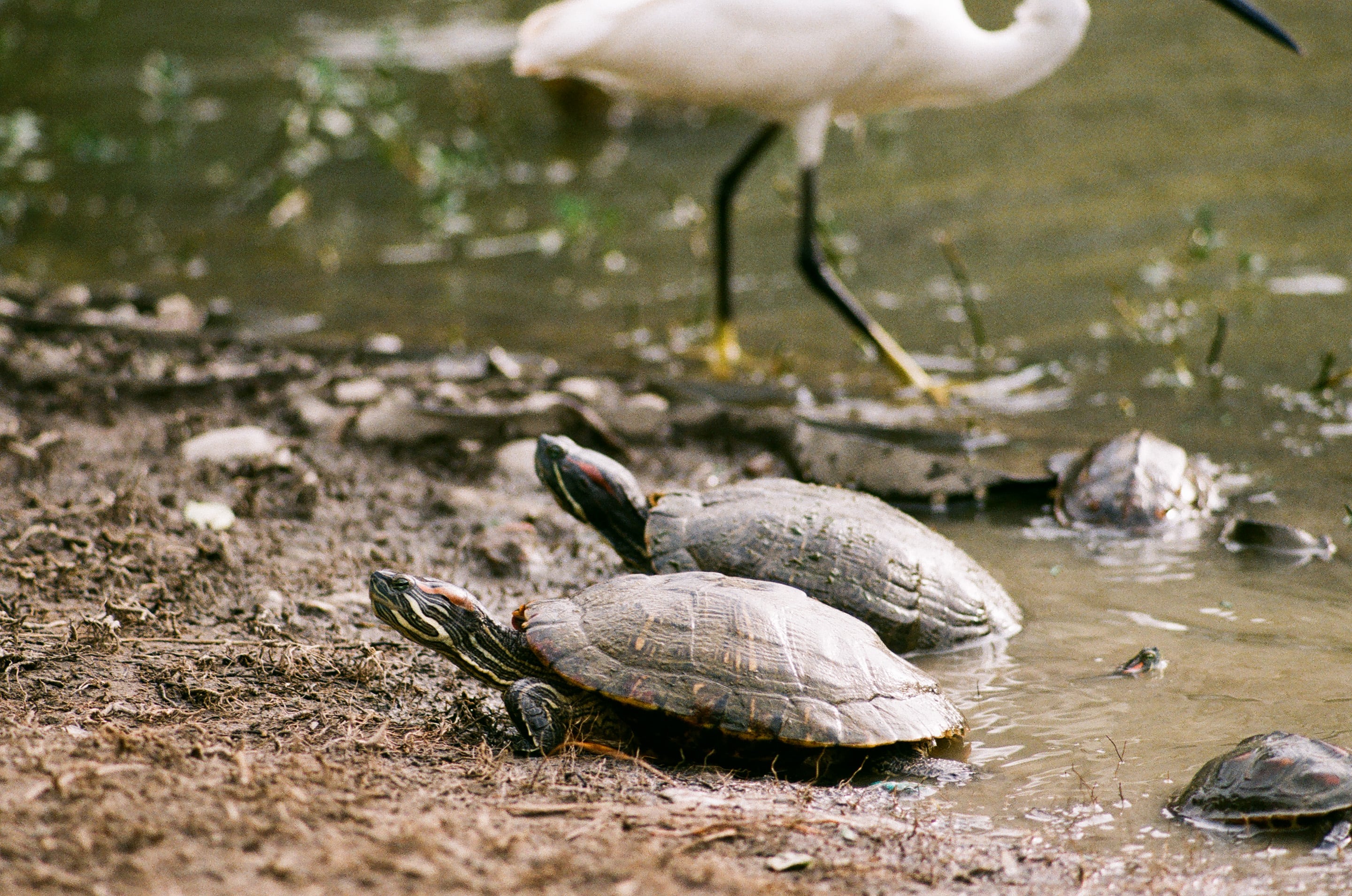家裡附近水池的澤龜們,正上岸吃我們餵的烏龜飼料,池內的魚兒也想吃,反而吸引小白鷺過來打獵。Olympus 200mm f5