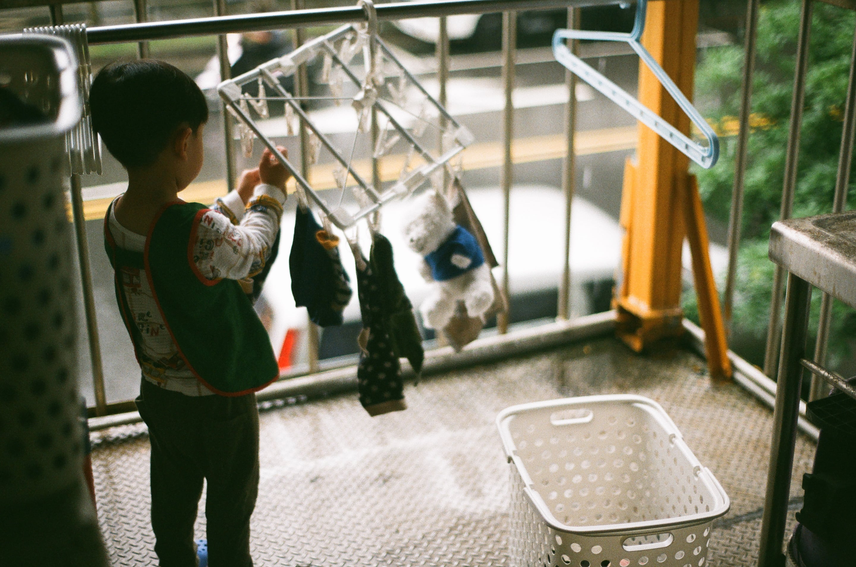 印象中兒子應該是兩歲多學會幫忙曬衣服的,當他要幫忙的時候,我會把曬衣桿降下來到他掛得到的高度(介面的重要)。Olympus 50mm f1.4(1/125s,f1.4)