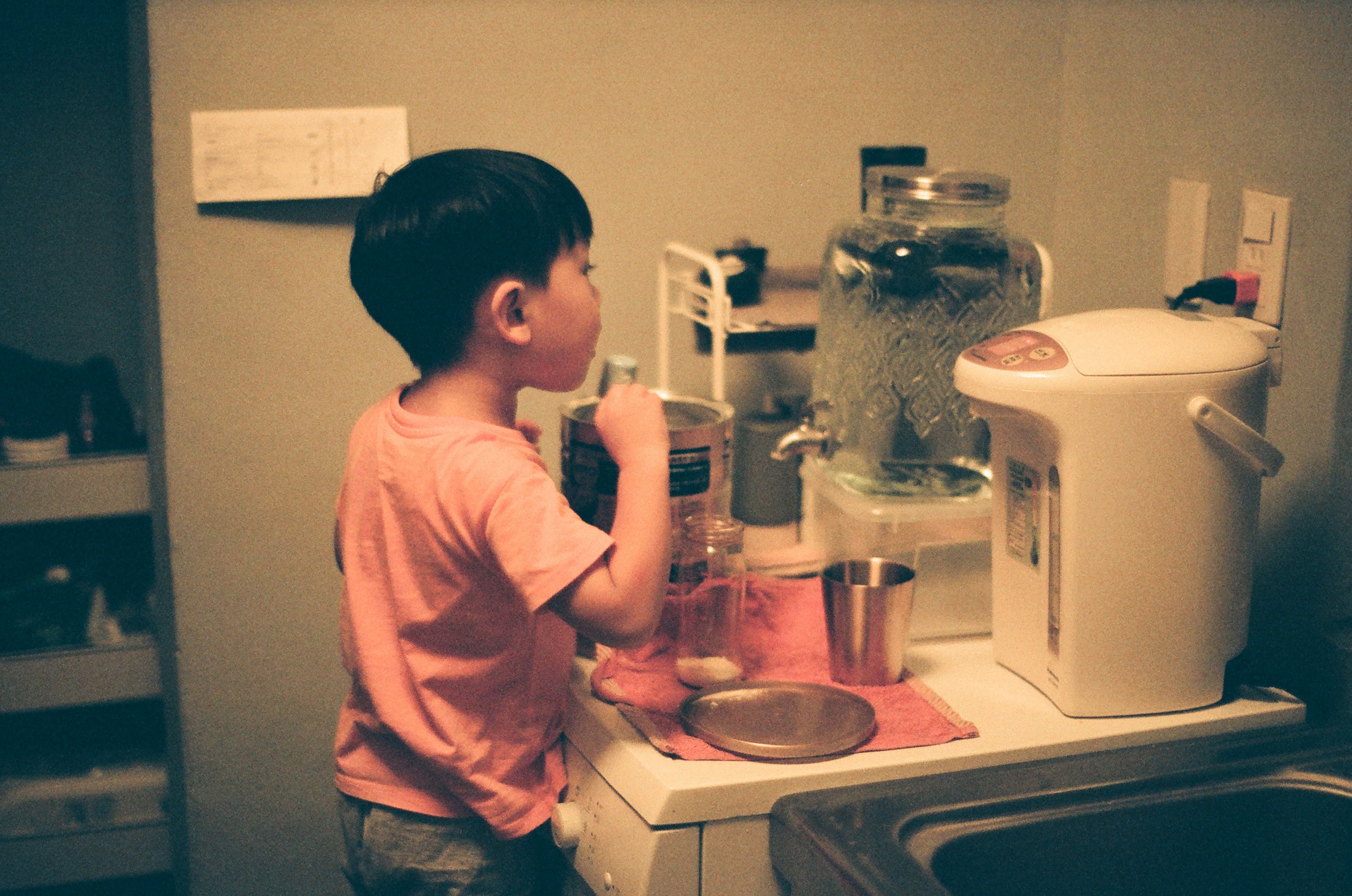 說要自己泡奶,卻會偷吃奶粉的三歲小孩。Olympus 50mm f1.4(1/60s,f1.4)