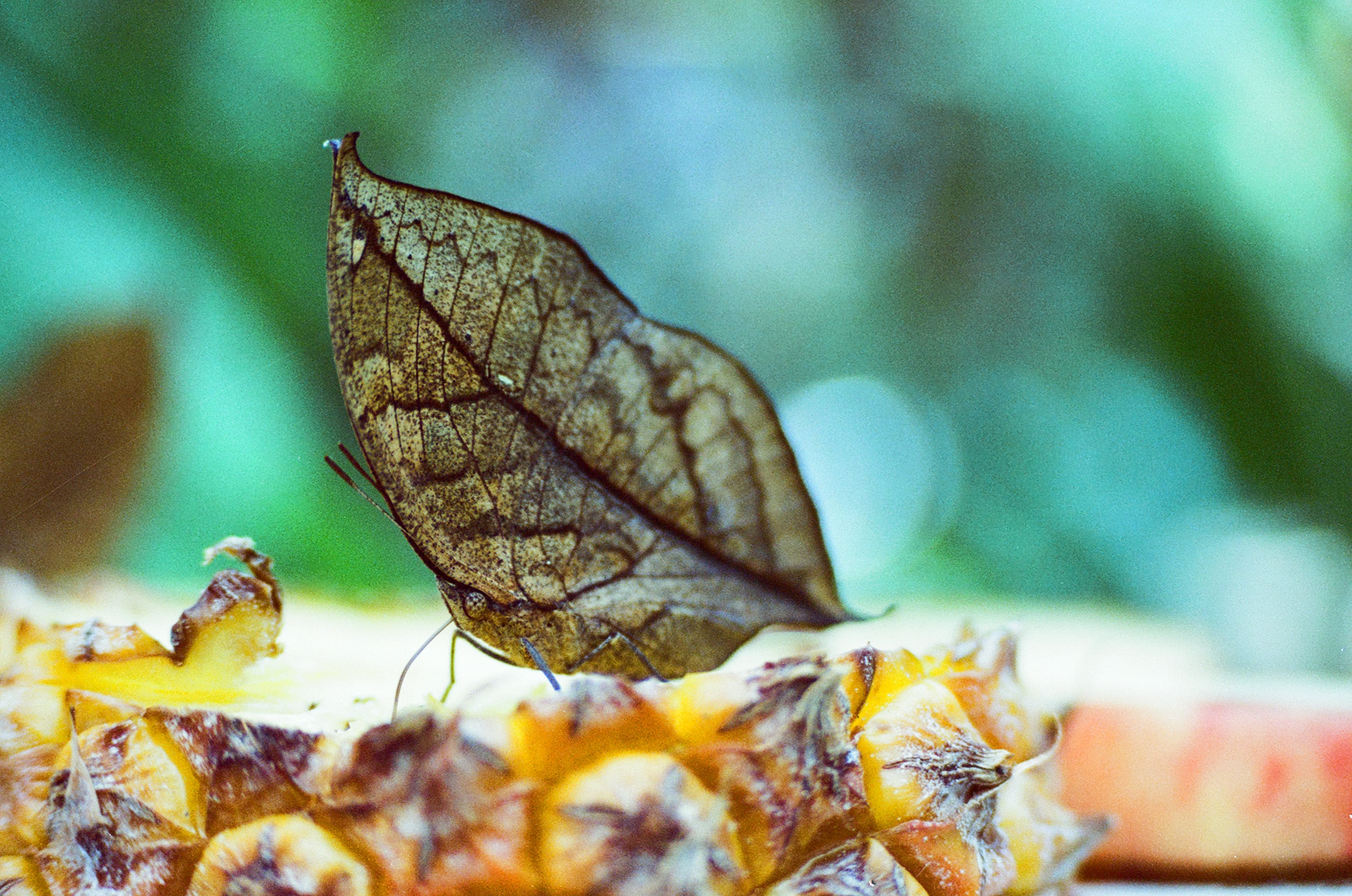 我小時候最愛的枯葉蝶,長大之後還是覺得他們很酷,怎麼有這麼神奇的身體偽裝。圖為他正在吸收動物園提供的鳳梨餐。Tamron 60-300mm f3.8-5.4 Macro 23A(@60mm)
