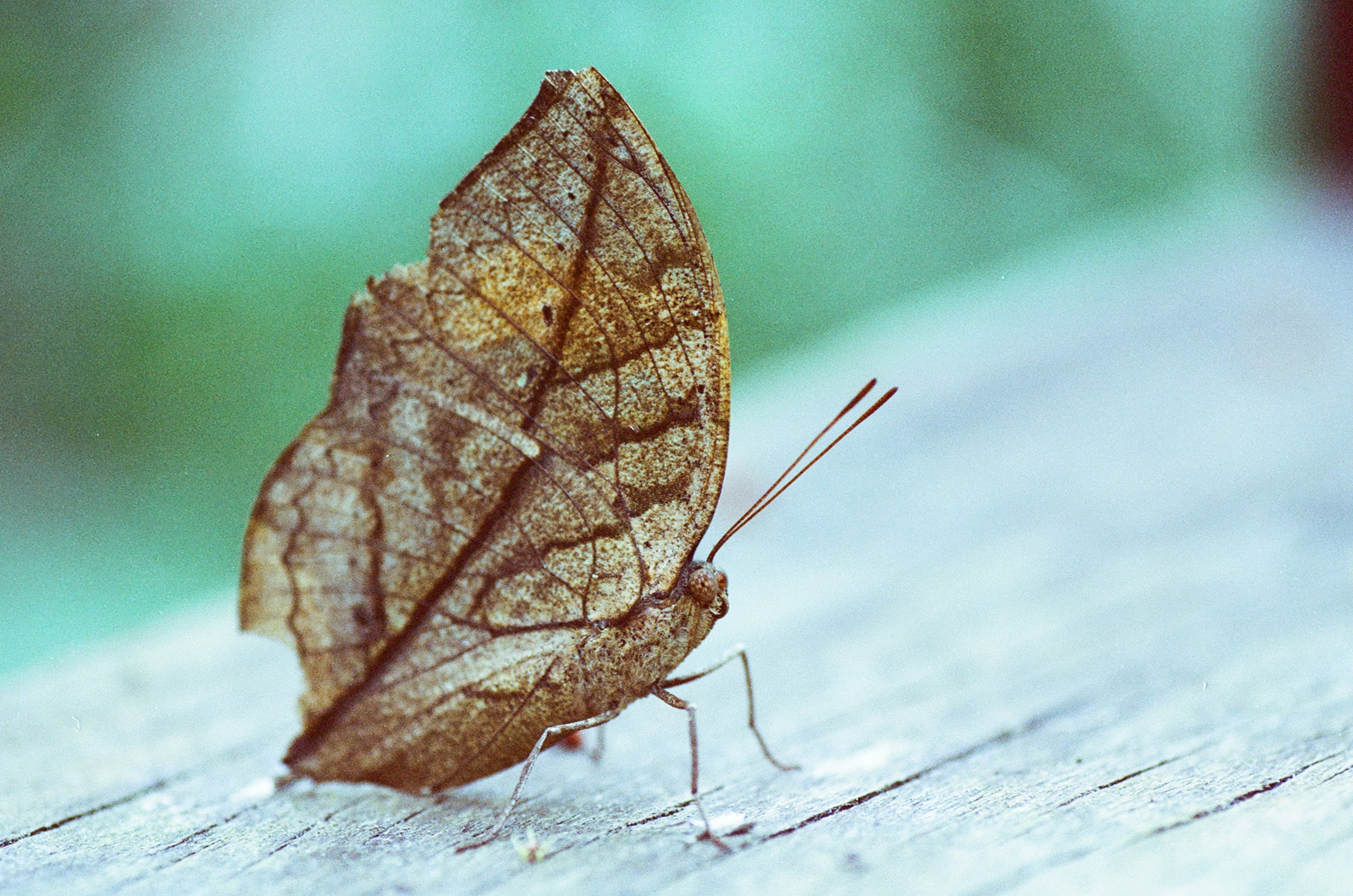 枯葉蝶本人因為個性關係,不愛亂飛,所以很好拍攝,是說下次拍昆蟲微距應該要搭配 ISO 400 或 800 的底片,這樣才可以放心縮光圈,不用擔心手震。Tamron 90mm f2.8 Macro 72B(1/125,f4)