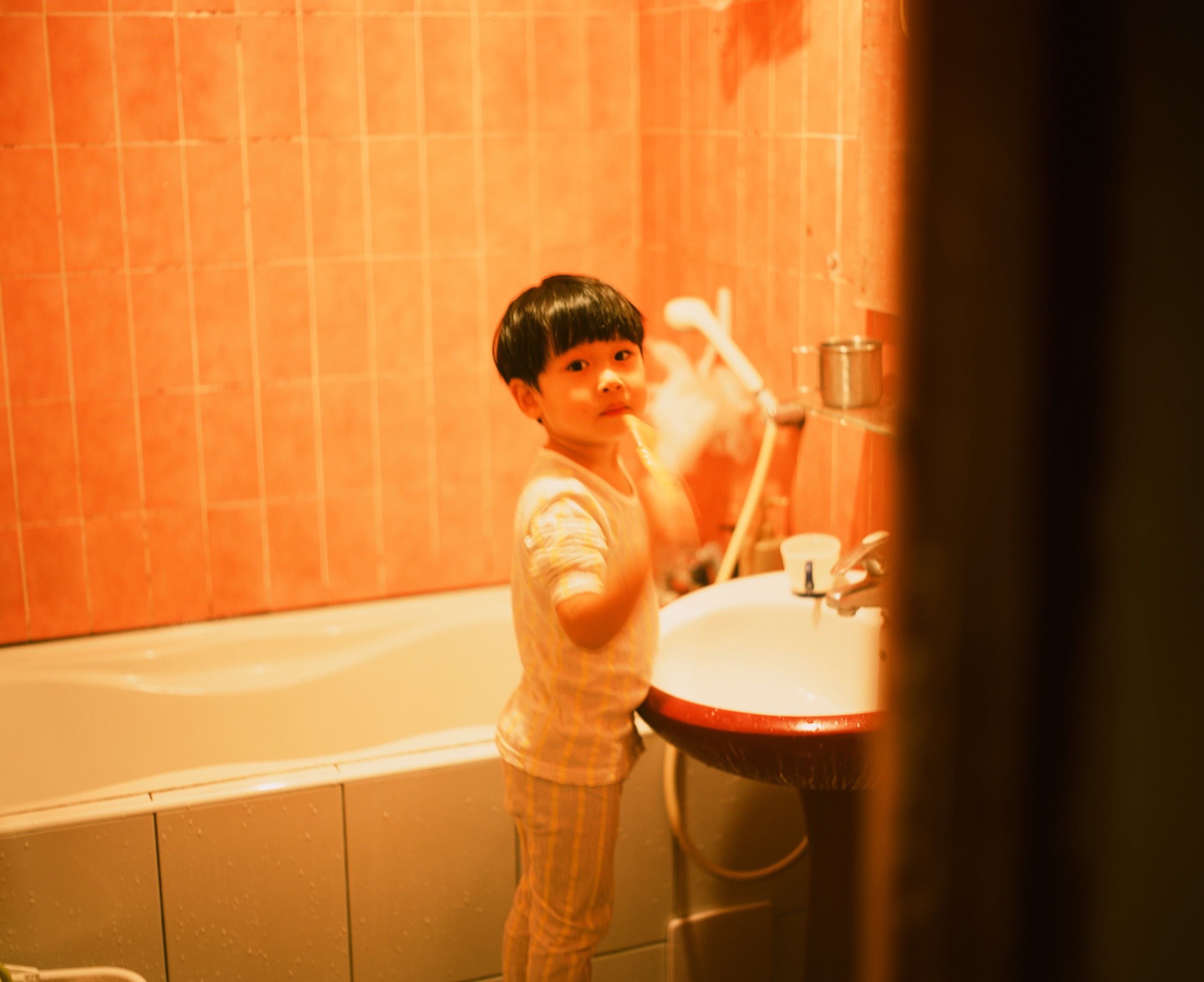 正在浴室刷牙的兒子,這三歲小孩明明就會自己刷牙,但都不太願意自己刷牙,平常都要三催四請。Takumar 6x7 90mm f2.8(1/4,f2.8)