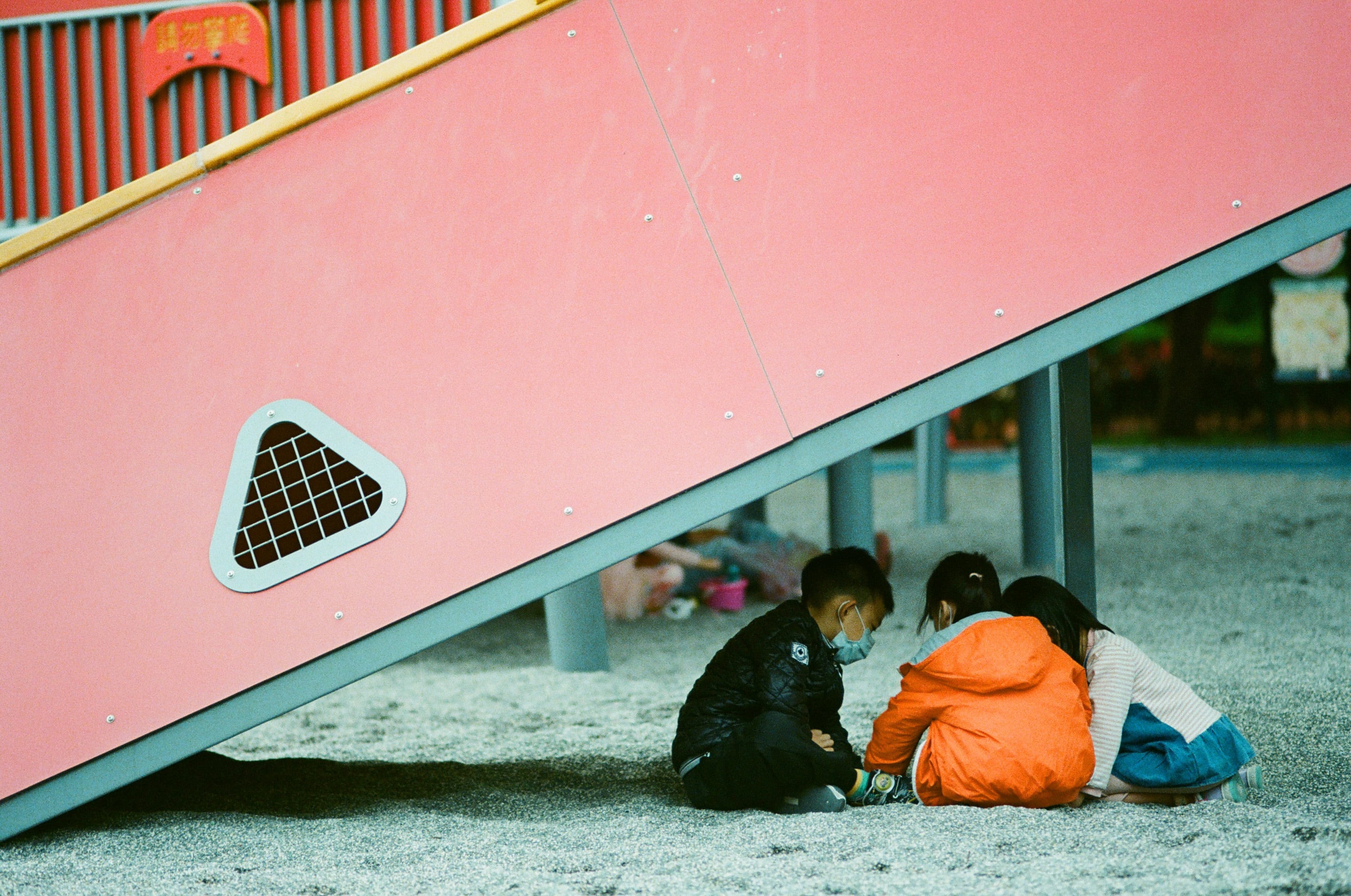 這些小孩子看起來正在玩某個有趣的遊戲,但其實他們只是在一起看手機。Olympus OM 90mm f2 Macro(1/15,f2)