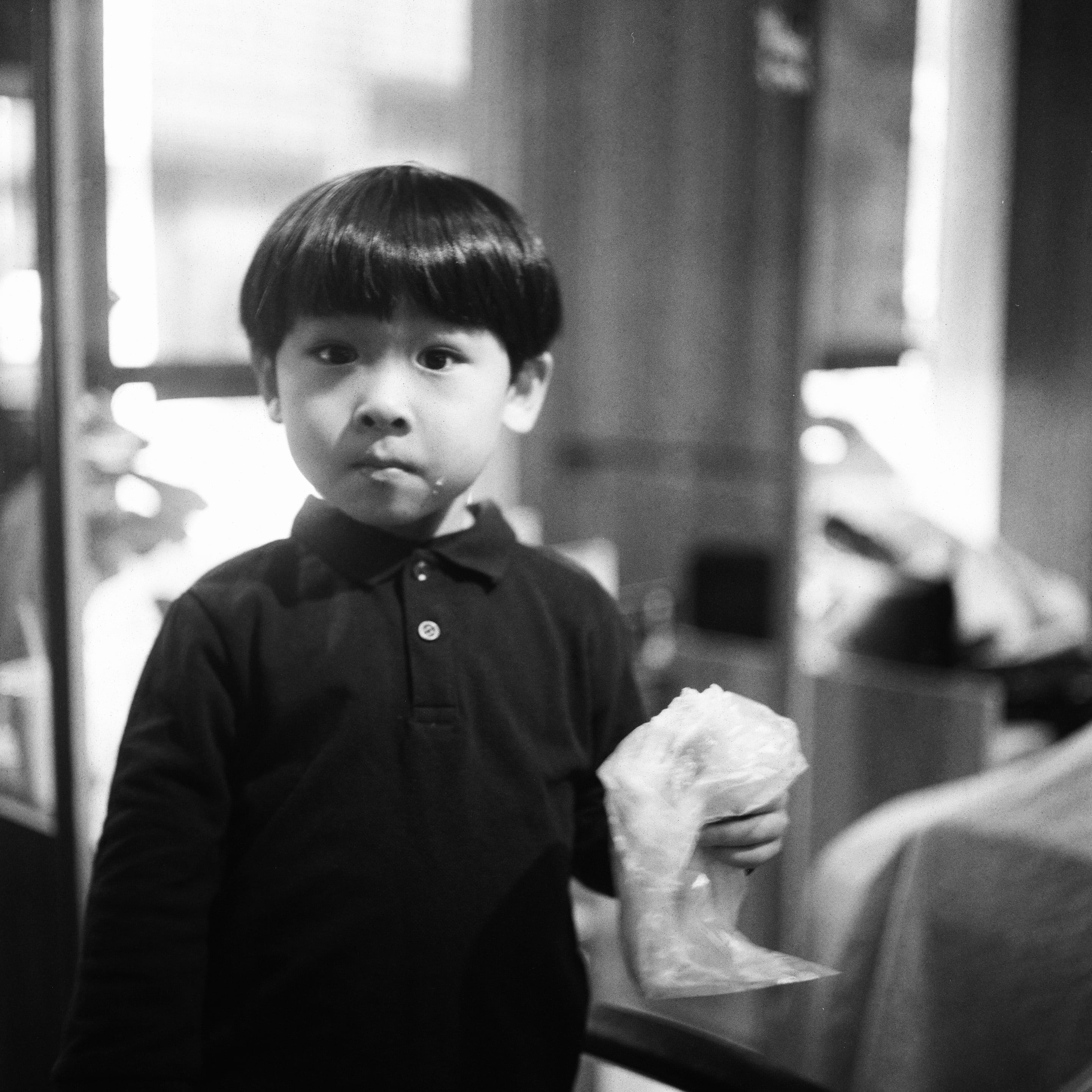 正在吃燒餅的兒子。Olympus D.Zuiko 75mm f2.8(1/25,f2.8)