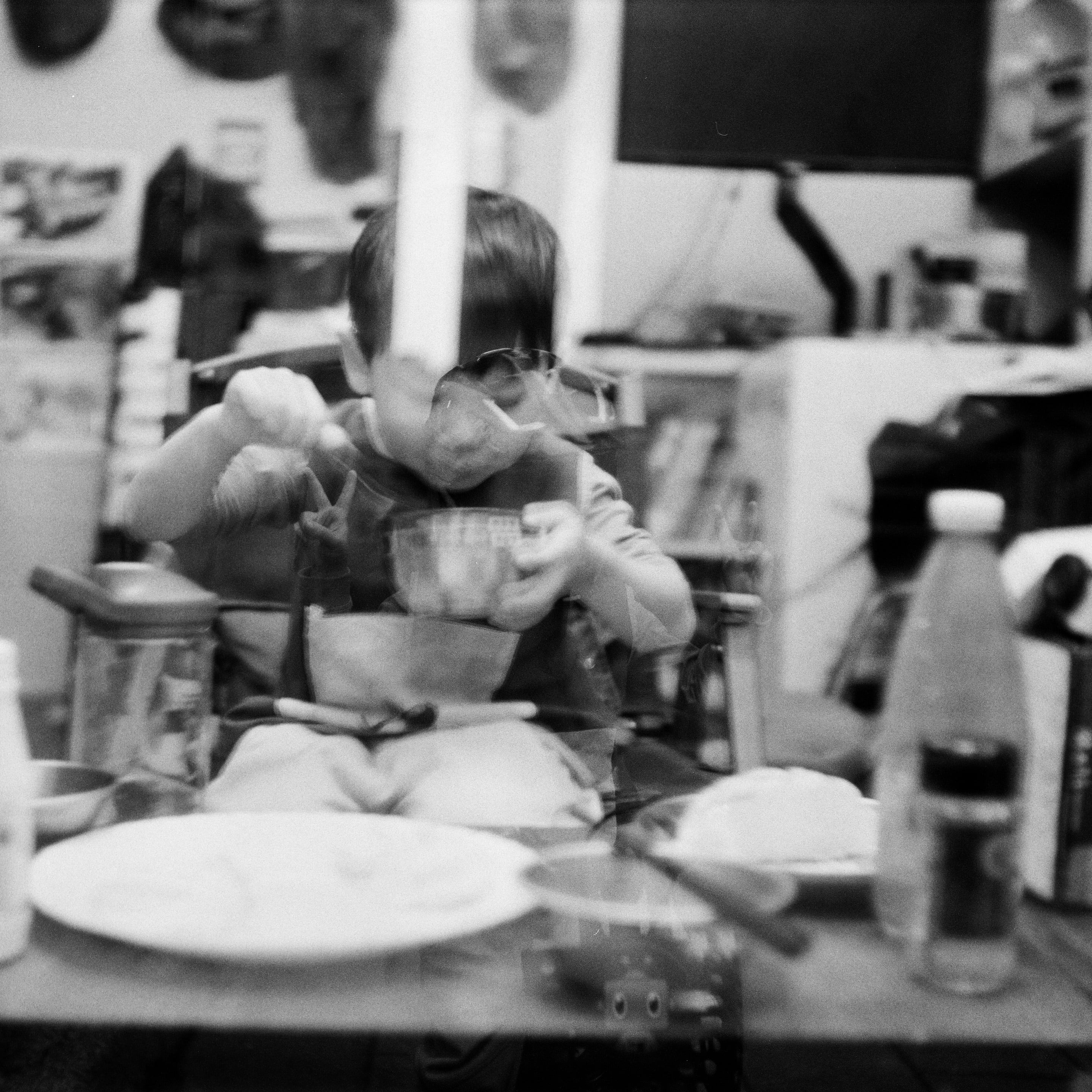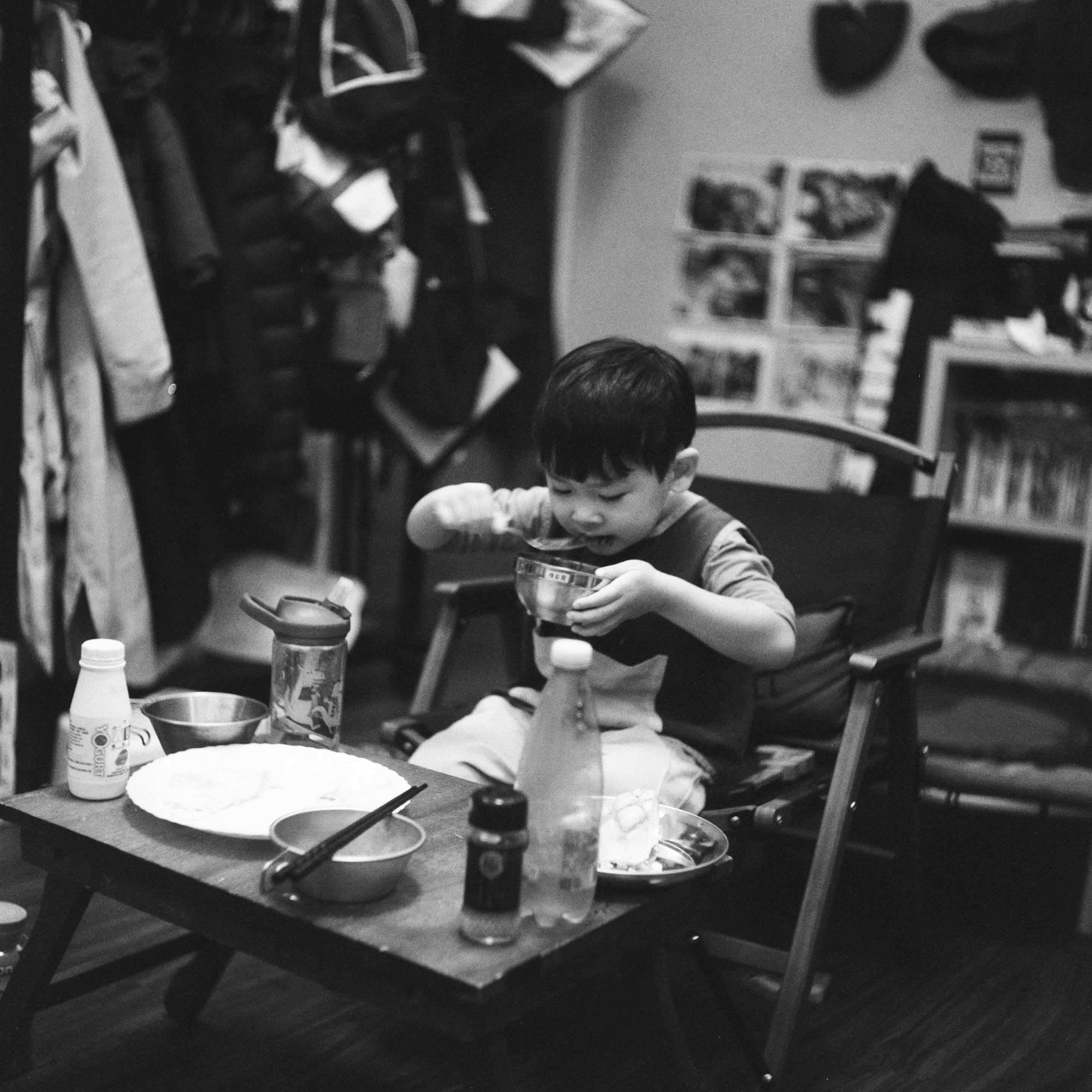 不小心重曝了,混合成一張接小孩放學與在家吃飯的照片。Olympus D.Zuiko 75mm f2.8(1/25,f2.8,重複曝光)
