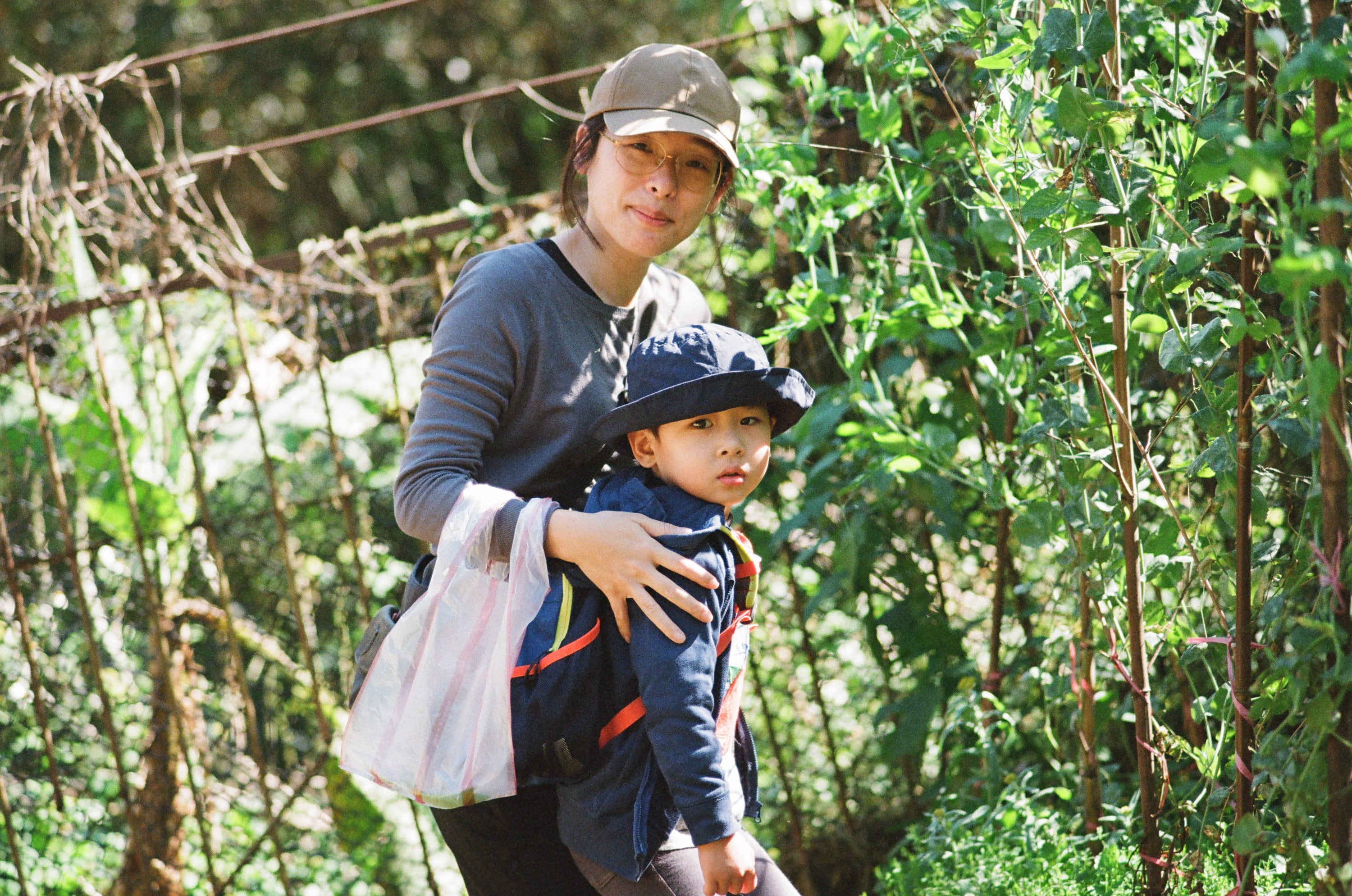 正在菜園摘豆子強者我太太和四歲兒子。
