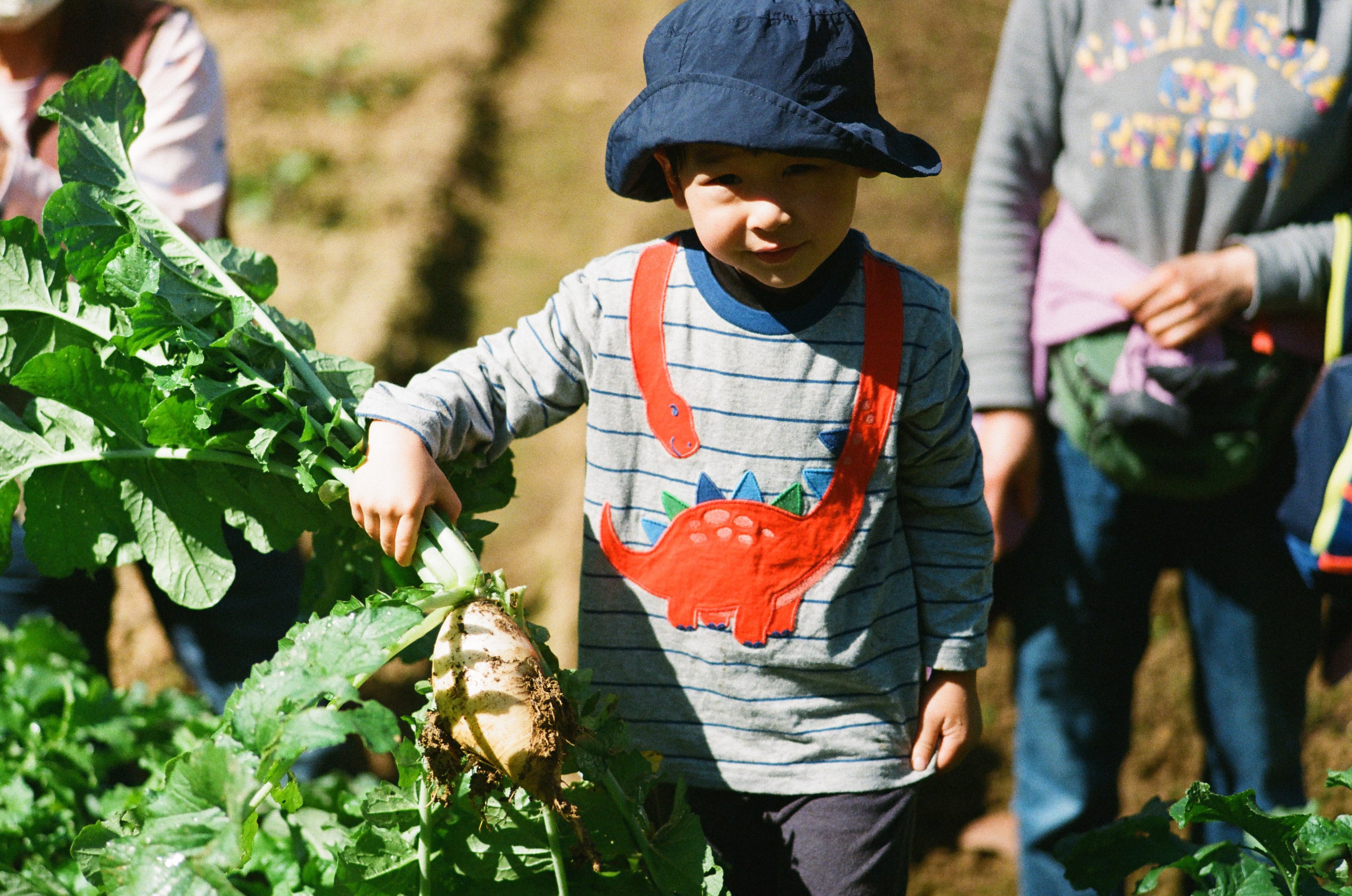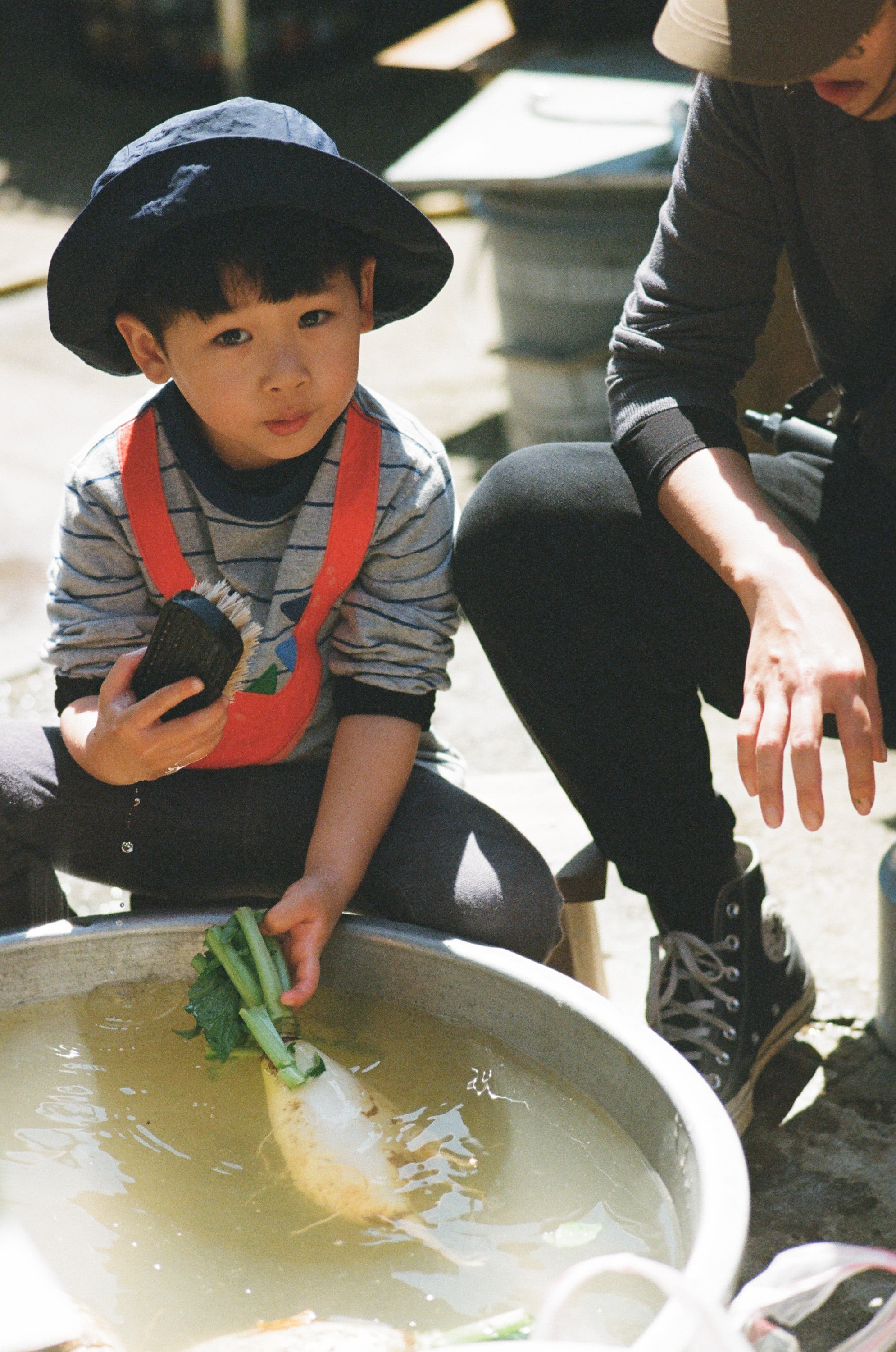正在洗蘿蔔的四歲小孩。蘿蔔從土裡拔出來之後,要經過山泉水的基本清洗,山泉水因為沒有加氯,因此不太容易對蔬菜造成老化。
