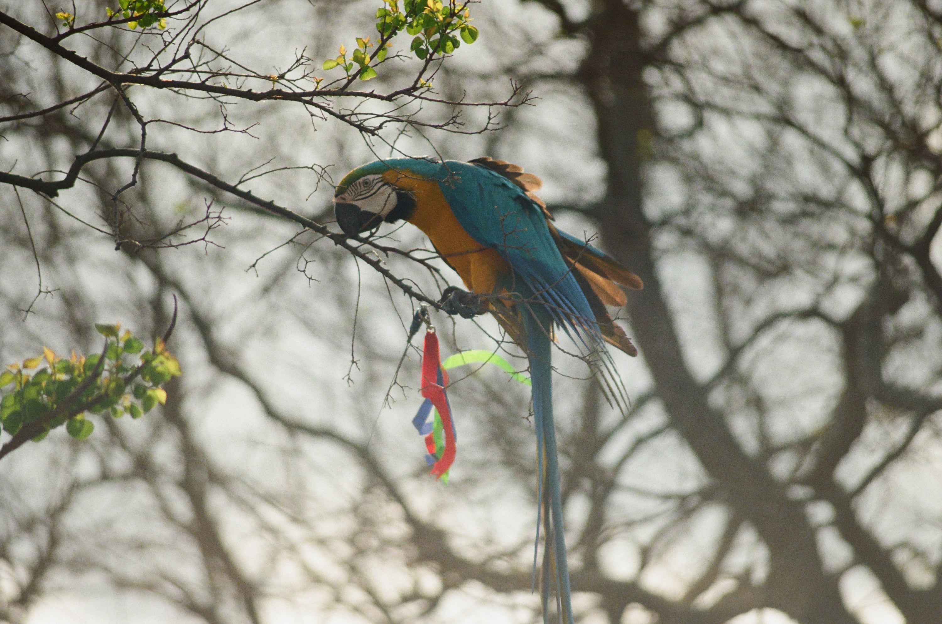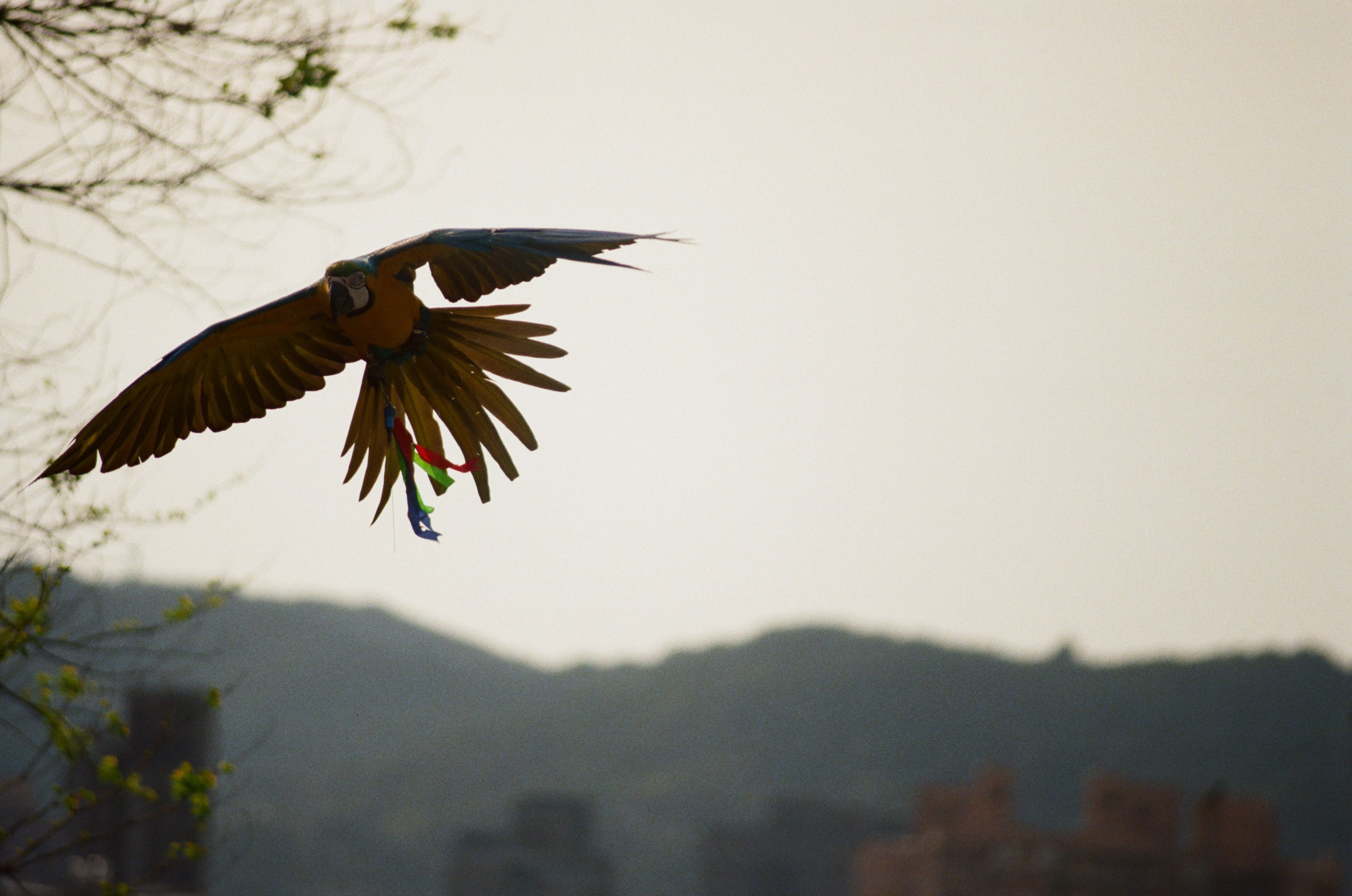 浮洲寵物公園常會見到飼養金剛鸚鵡的人在聚會,我曾經詢問能否拍照但卻被直接禁止,讓我頗為尷尬,似乎是有些特殊品種需要低調的關係。圖為正在接收繞圈飛行金剛鸚鵡,不是被禁止拍照的那隻。對於用底片拍鳥類追焦,我覺得有點像是用錢幣打水漂,不一定會成功,但每次丟出去都要錢。
