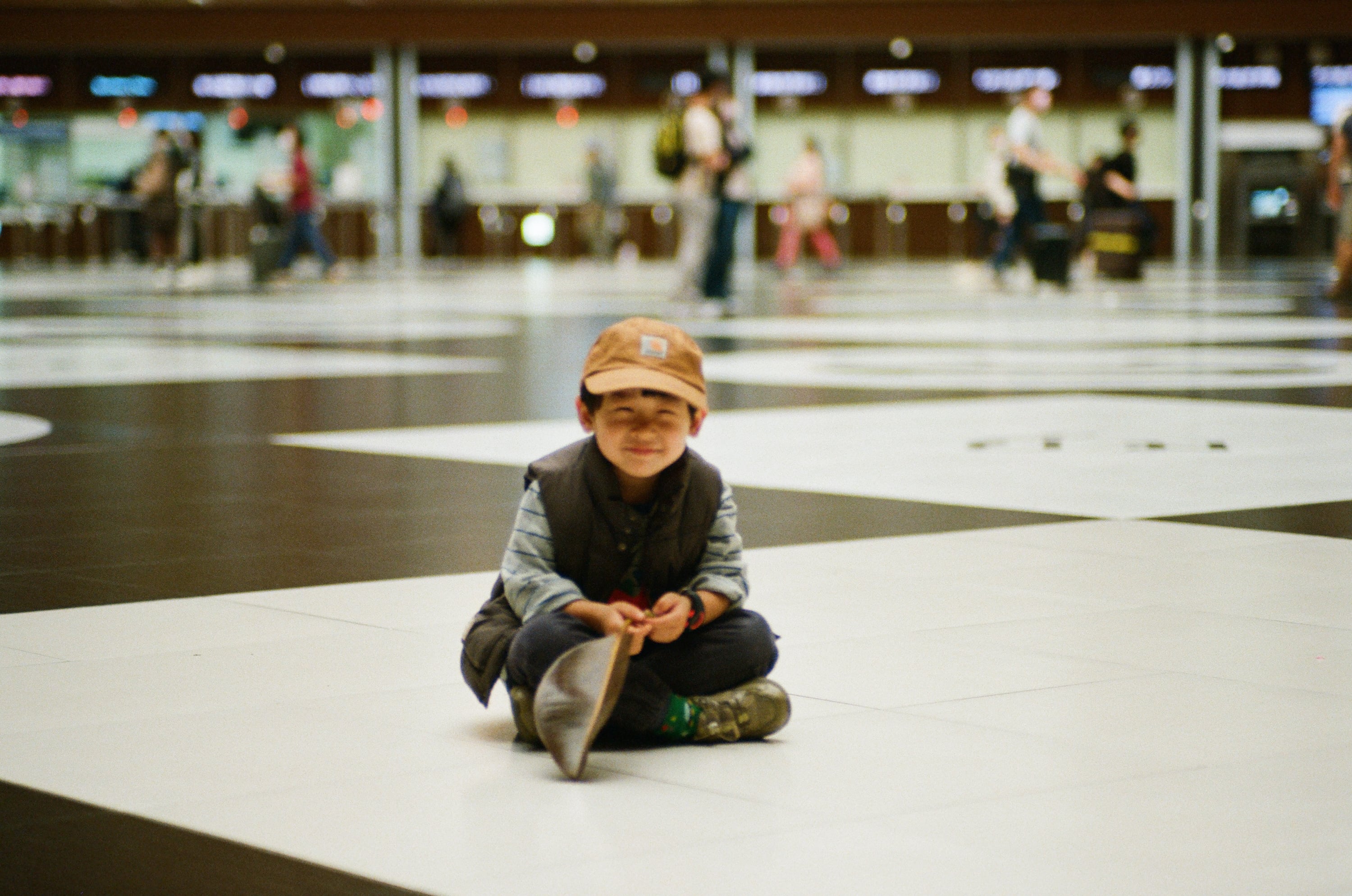 到了台北火車站大廳,很自然就席地而坐的兒子。