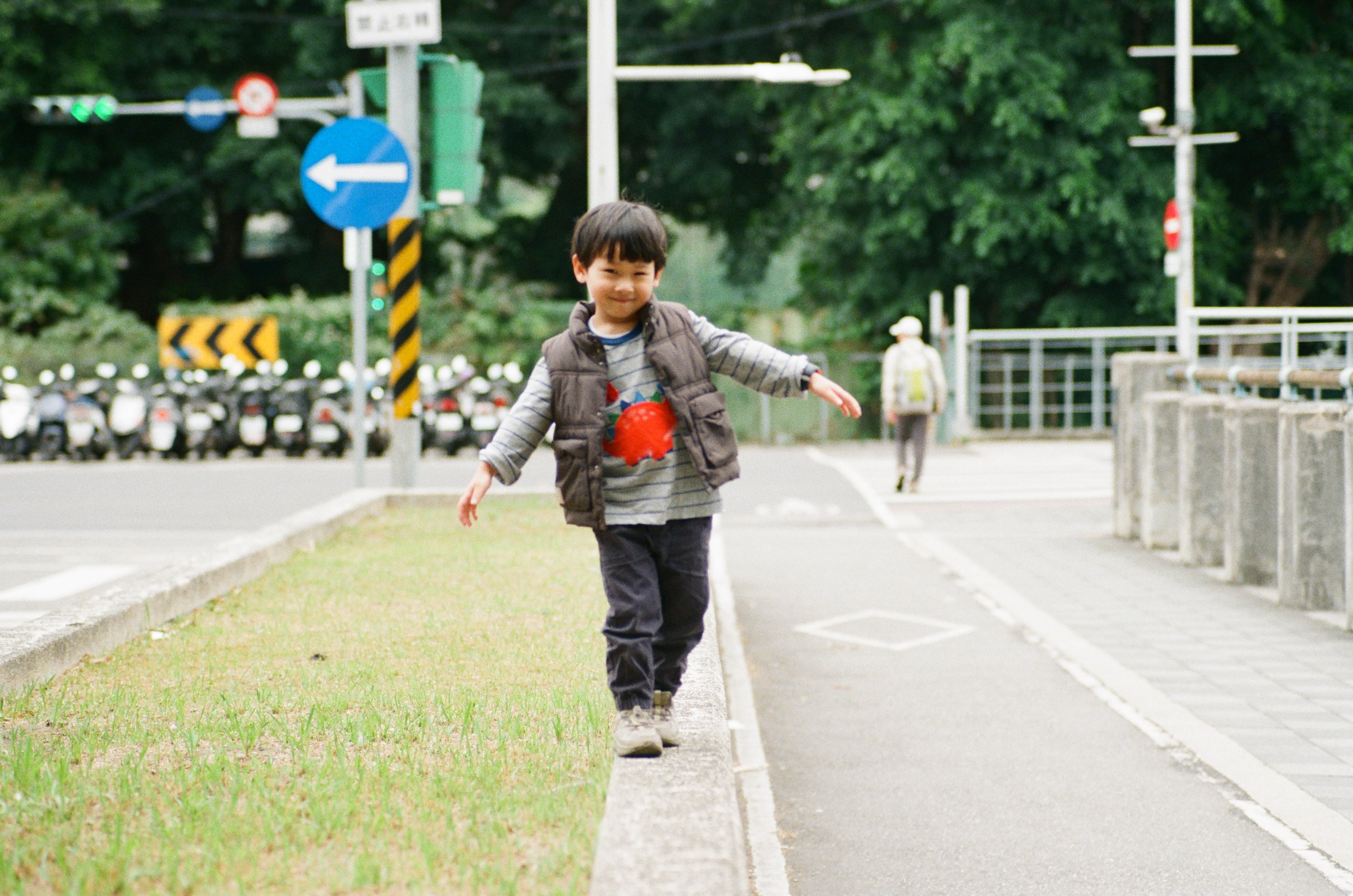 兒子雖然已經四歲了,但還是很常想要我揹或抱,我如果有力氣就會答應他,如果沒力氣就會想辦法和他玩走路遊戲,就是挑路上的一些地形玩這樣。圖為我們在走平衡木,一個終點、一個終點這樣滿滿往前推進。
