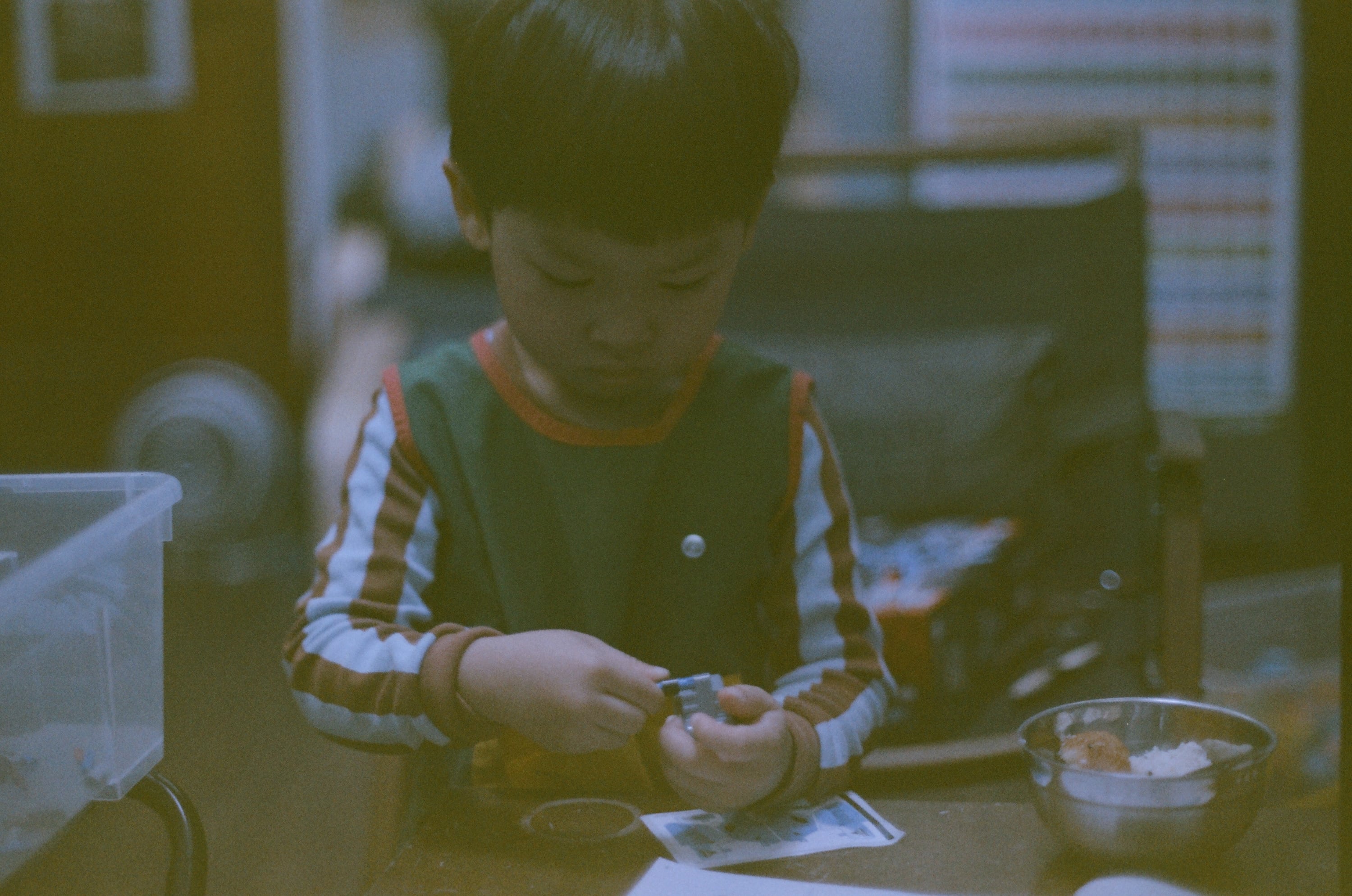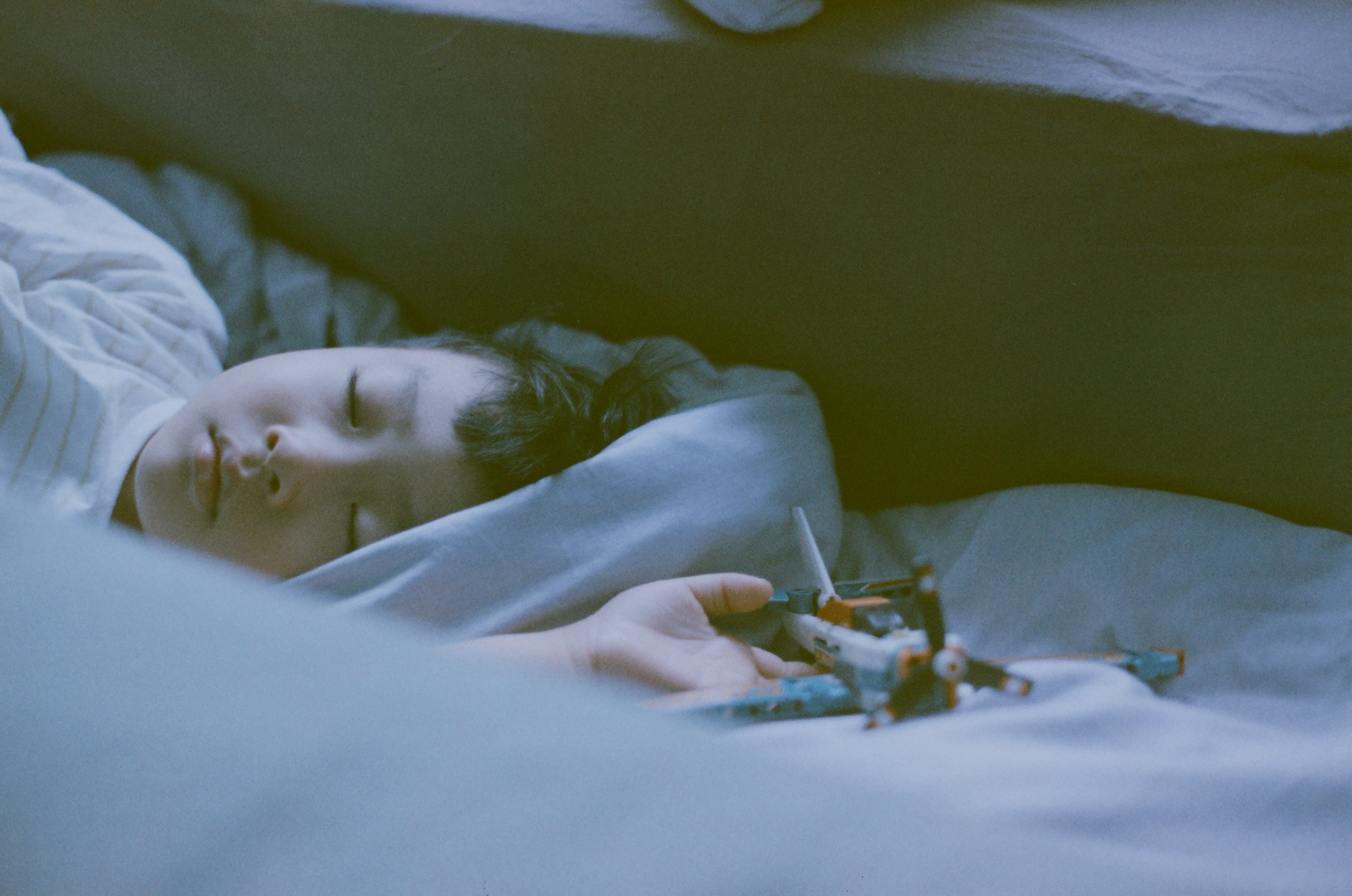 早上還在賴床的兒子,手上竟然還拿著昨晚的玩具。為了拍這張照片,我用上了小型腳架、快門線,還有 Olympus Varimagni Finder(垂直放大觀景器),以腰平方式取景。那時只拍了這一張,沒想到竟然很成功,因為當時我看兒子上學快遲到了,於是就趕緊把他叫醒,準備洗臉刷牙出門去。