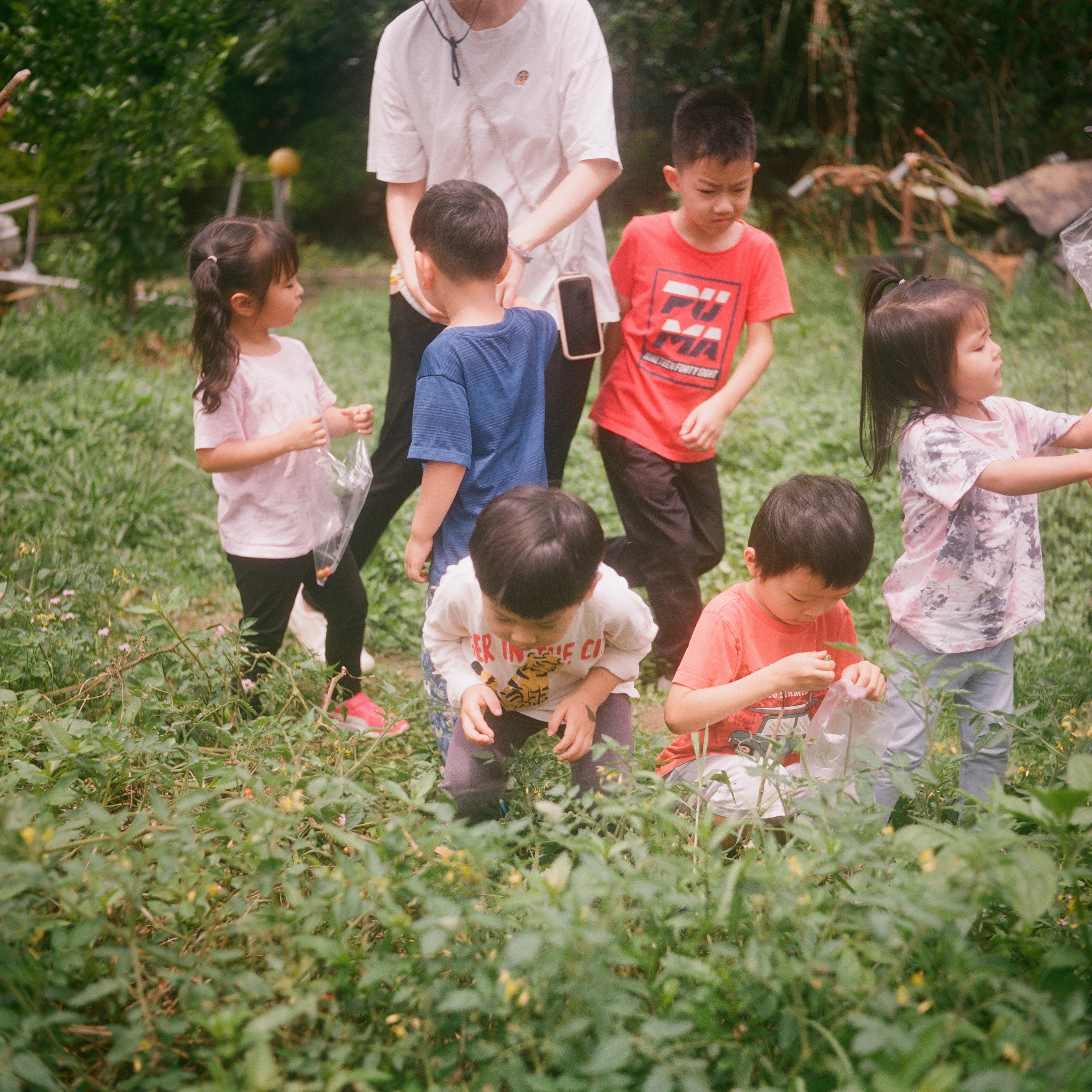 農場除了餵雞之外,還有拔菜活動,今天拔的是小番茄,兒子正在找。從這張圖片可以看出,我們家是「物理性防蚊」的虔誠信徒,大家都穿短袖,只有我們家穿長袖。