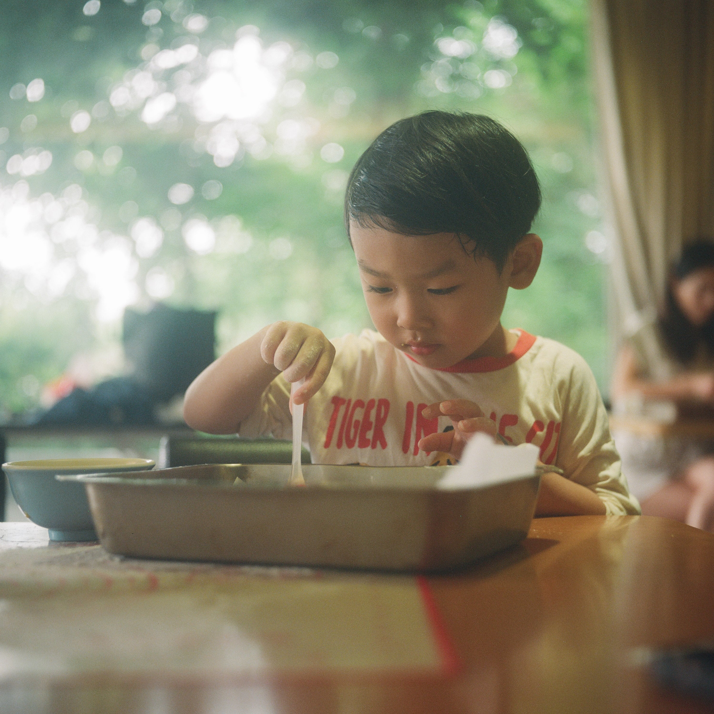 農場還有一個活動是自己做麵包,兒子正在幫捏好的麵包表面刷上蛋液,農場主人說這樣子麵包的表面才會有酥脆的口感。這張照片可以看一下中片幅 f3.5 的散景效果,以 6x6 片幅來說,這台相機的 75mm f3.5 鏡頭相當於 135 的 41mm 視角與 f1.9 景深,因為是腰平取景,可以很輕易地使用低角度的方式來取景。