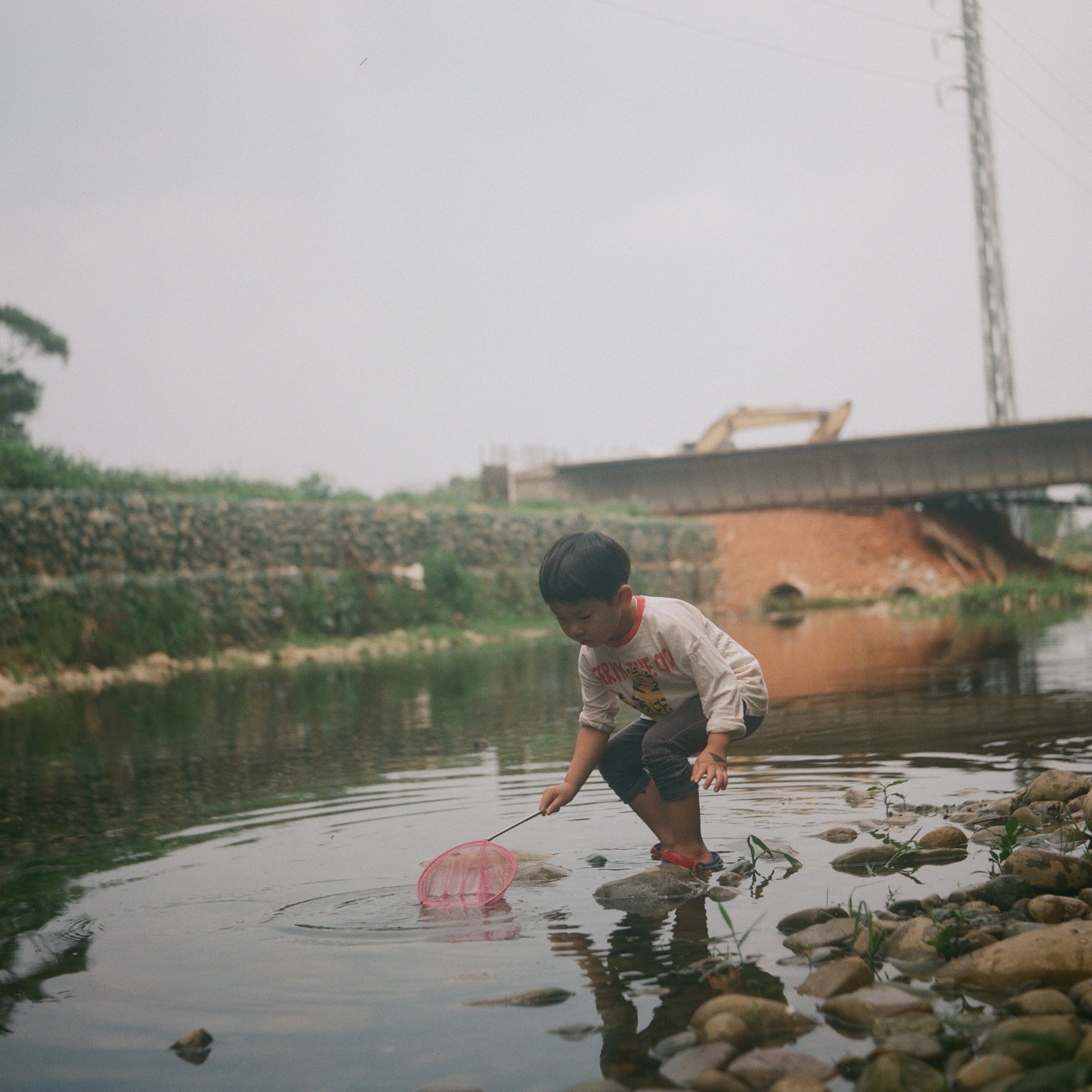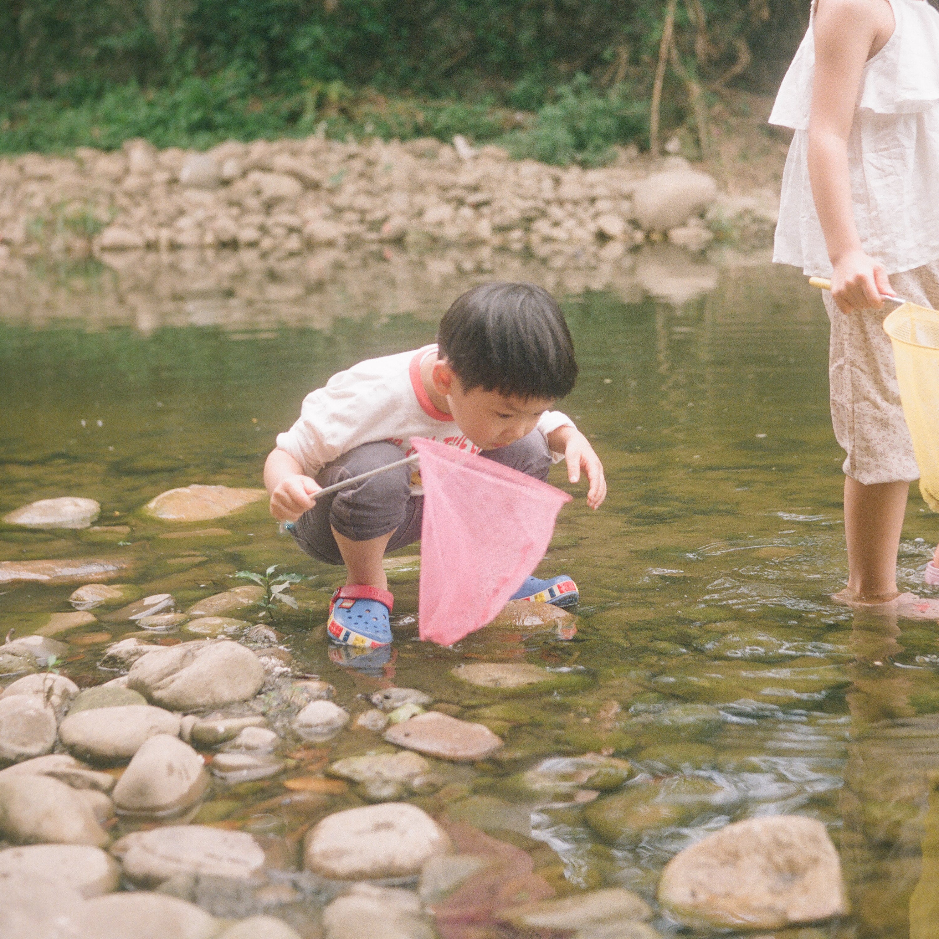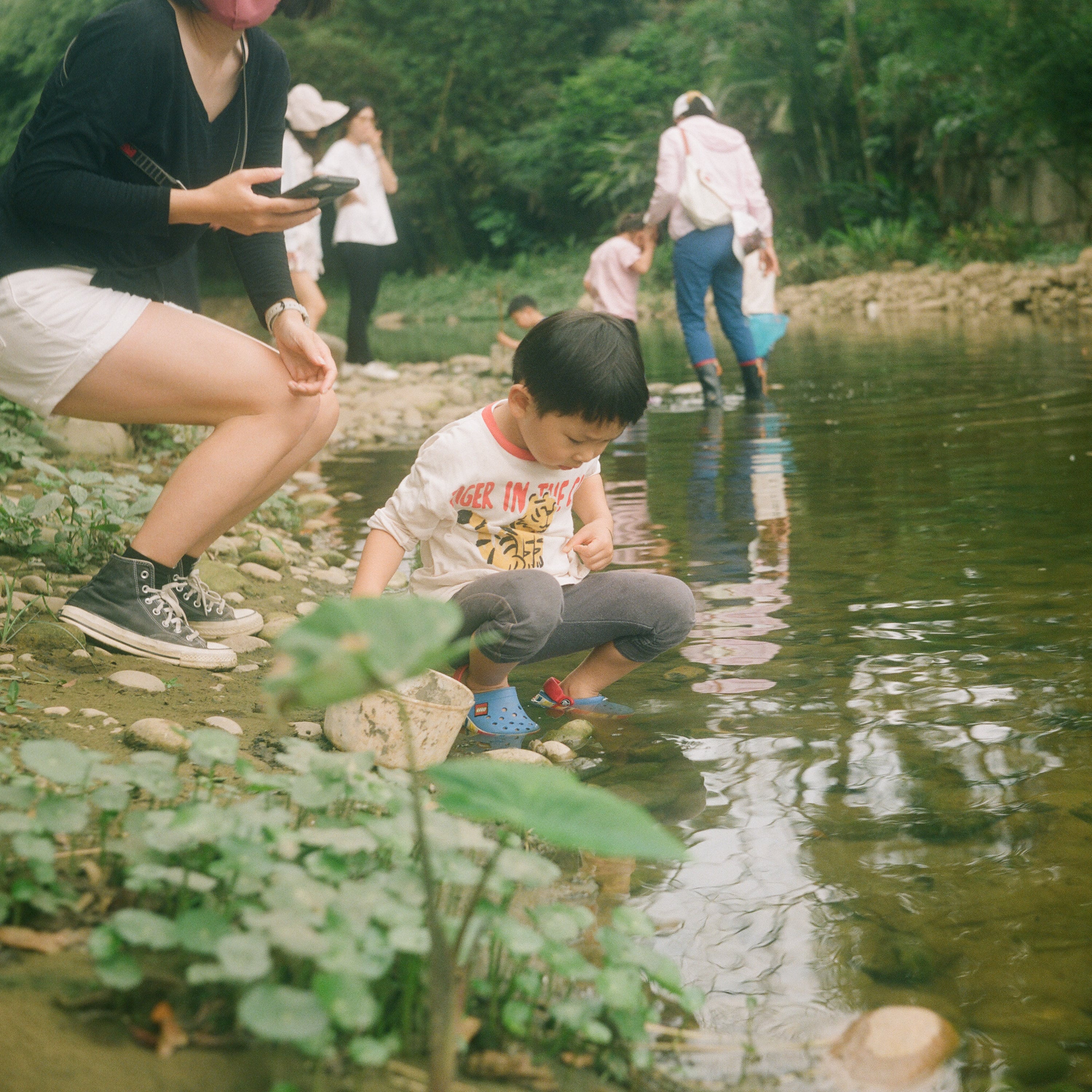 農場還有另一個活動,是去旁邊小溪邊撈福壽螺,要拿去餵鴨子吃。農場主人說鴨子好喜歡吃福壽螺,我第一次知道。這張照片是兒子超久沒碰溪水了,有些生疏害怕。
