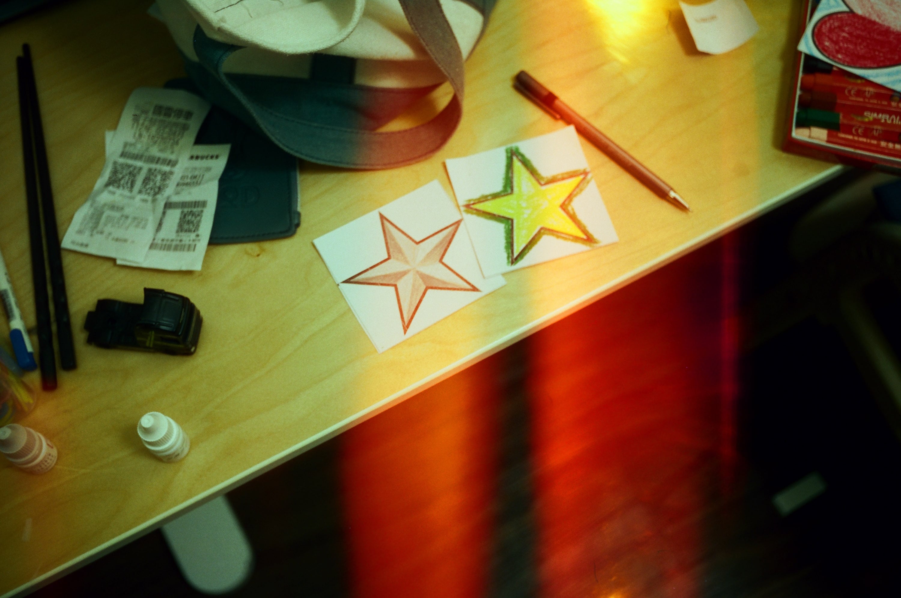 正在和兒子玩著色遊戲,右邊是兒子用黃色蠟筆畫的星星,左邊是我用鉛筆畫的立體版星星,想不到我小時候學的素描技能現在還堪用。