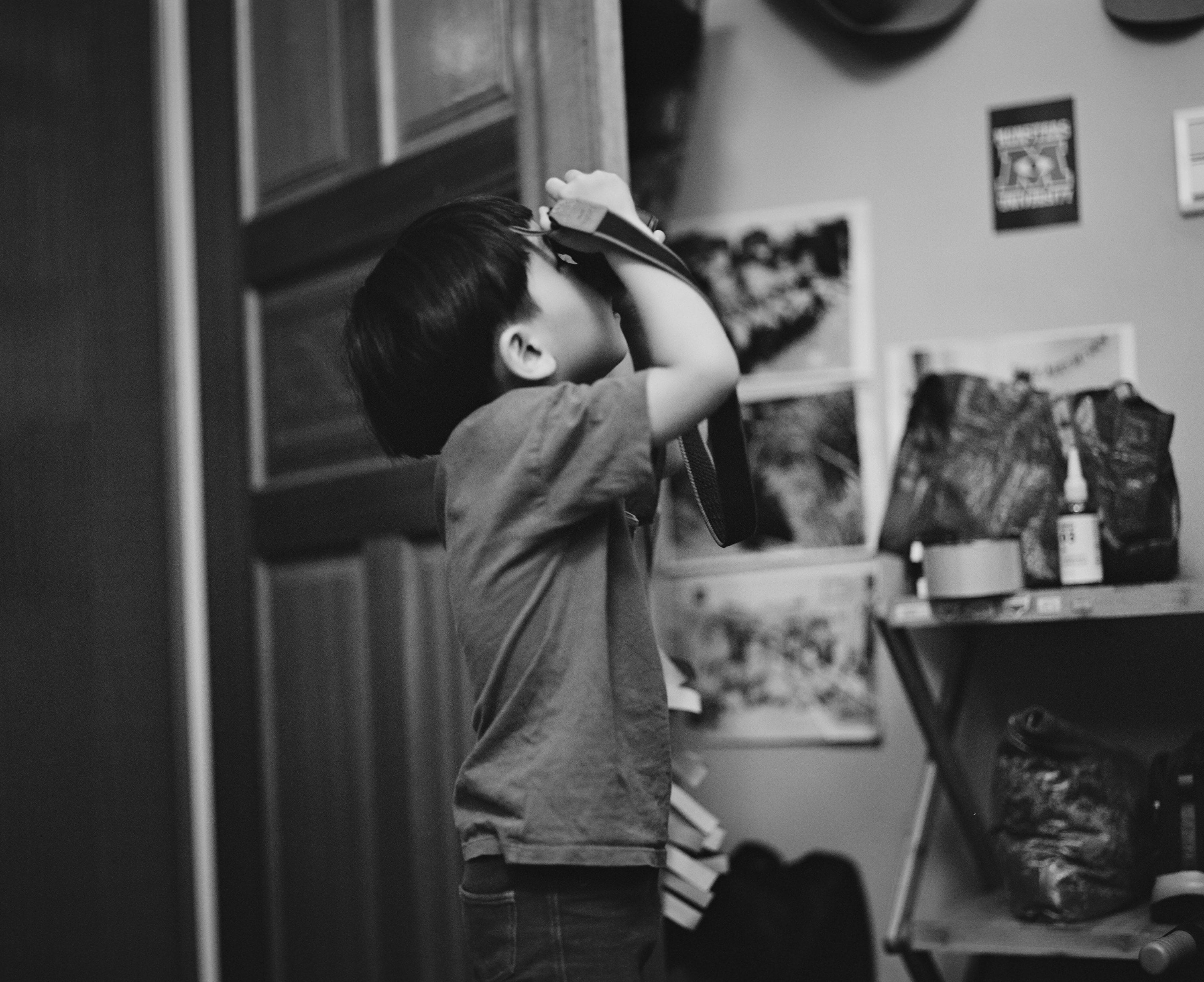 正在浪費底片的兒子,拿著 Konica 現場監督 28HG 亂拍天花板中。我也正以浪費底片的心情在記錄這件浪費底片的事。
