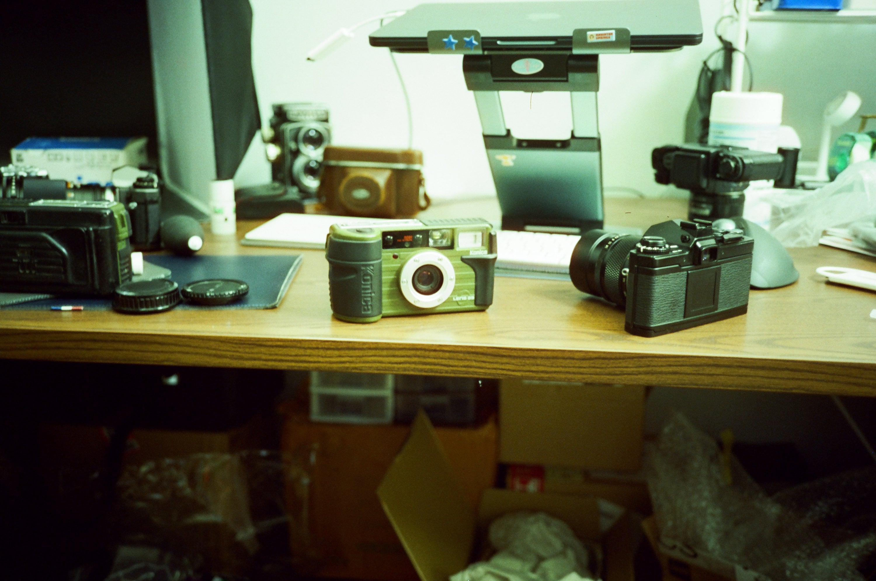 同場加映另外兩台 35mm 的傻瓜相機:Konica 現場監督 Lens 35,兩台都是非常少見的軍綠色,但是一台被我弄壞了,一台買來就是壞的,還在想該如何處理。