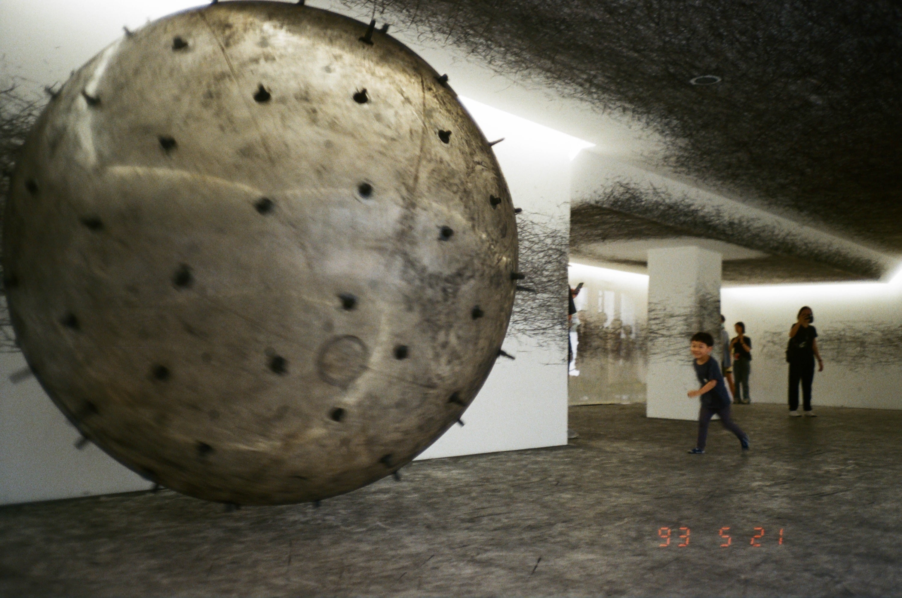 我們正在新北市美術館裡頭一個小型展區體驗一個很像 COVID-19 的藝術裝置,那個大球的表面都是炭筆,內部填充氦氣,會懸浮在半空中,藉由推力,可以讓球旋轉,進而在上下左右的牆面上留下痕跡,兒子玩得不亦樂乎。