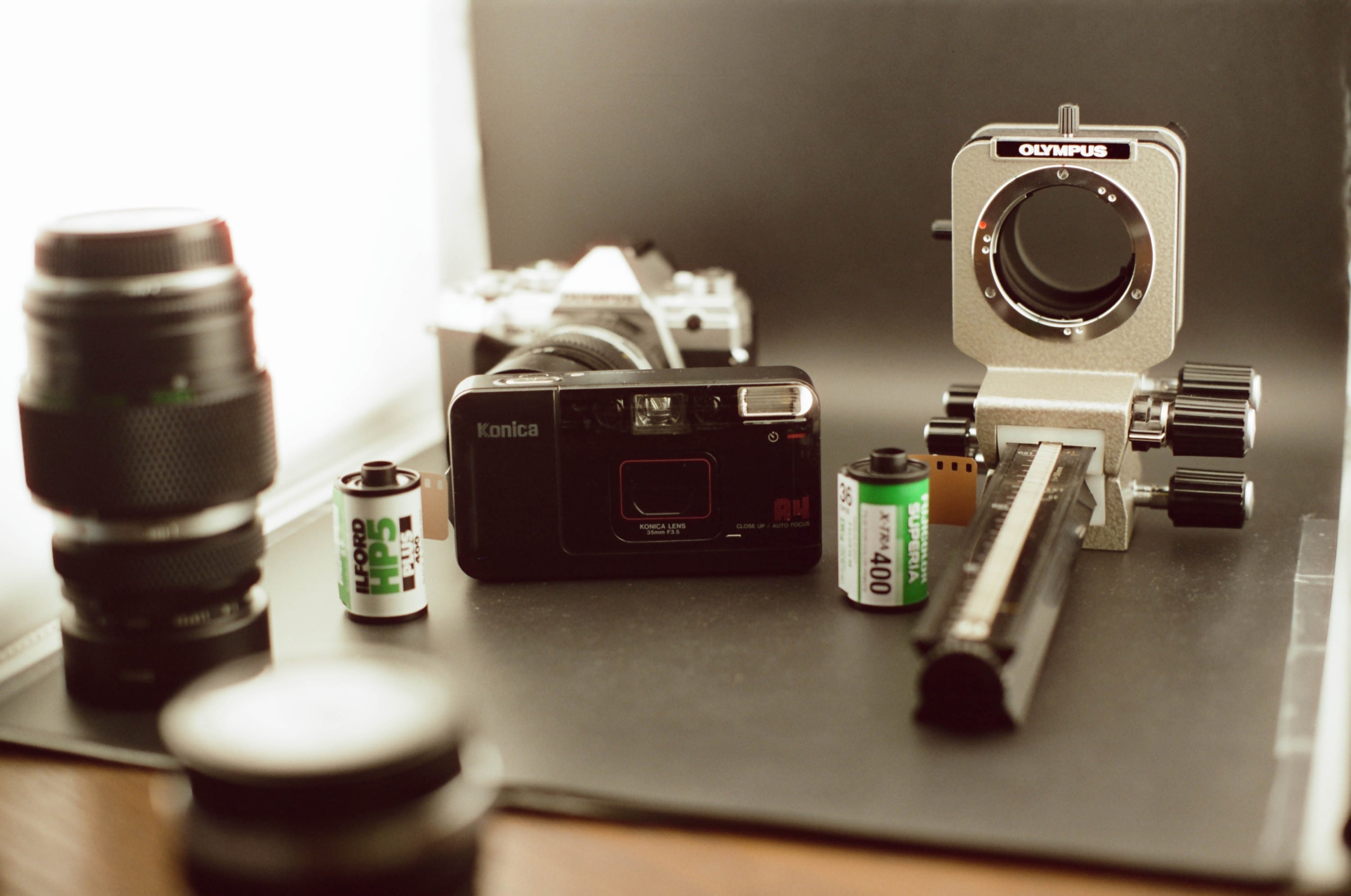 拍攝這張照片時,在過幾天就要出發去日本名古屋了,我那時很難抉擇要帶什麼相機,還有什麼底片。圖為相機人選之一的 Konica Big mini A4,之後帶著它裝了 Fujifilm Superia X-tra 400 底片去日本,然後再另外帶一台 Minolta P's 寬景相機裝 Ilford HP5 Plus 400 黑白底片。