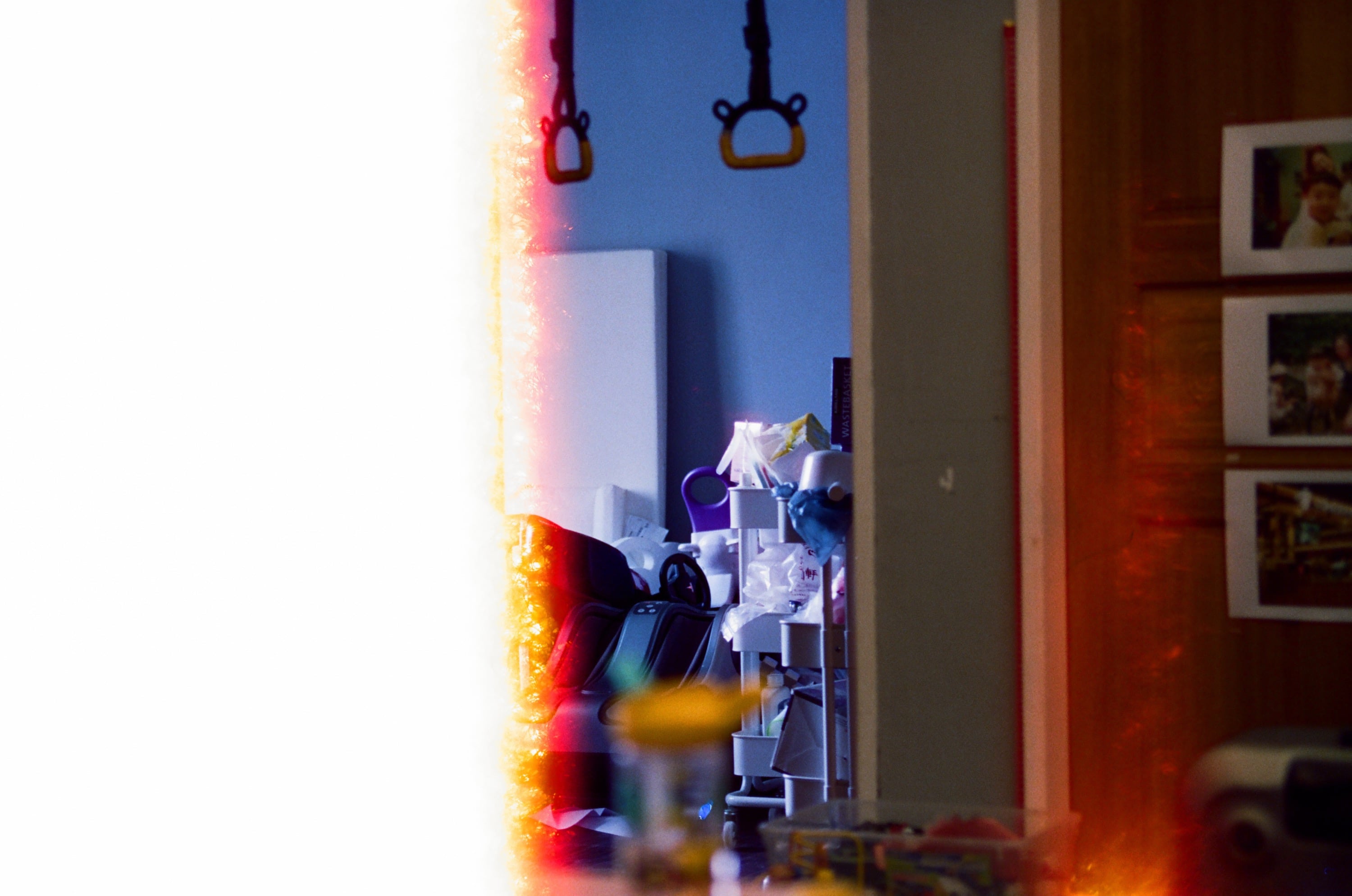 每次裝新的底片,要如何消耗片頭的這半張照片,我都會有些煩惱,常常因為不知道要拍什麼而按不下去第一張,於是常有裝了新底片一個禮拜之後都還沒拍下第一張照片。這張片頭的照片,是家裡的儲藏室,是某天我在檢查相機時不小心按下的快門。