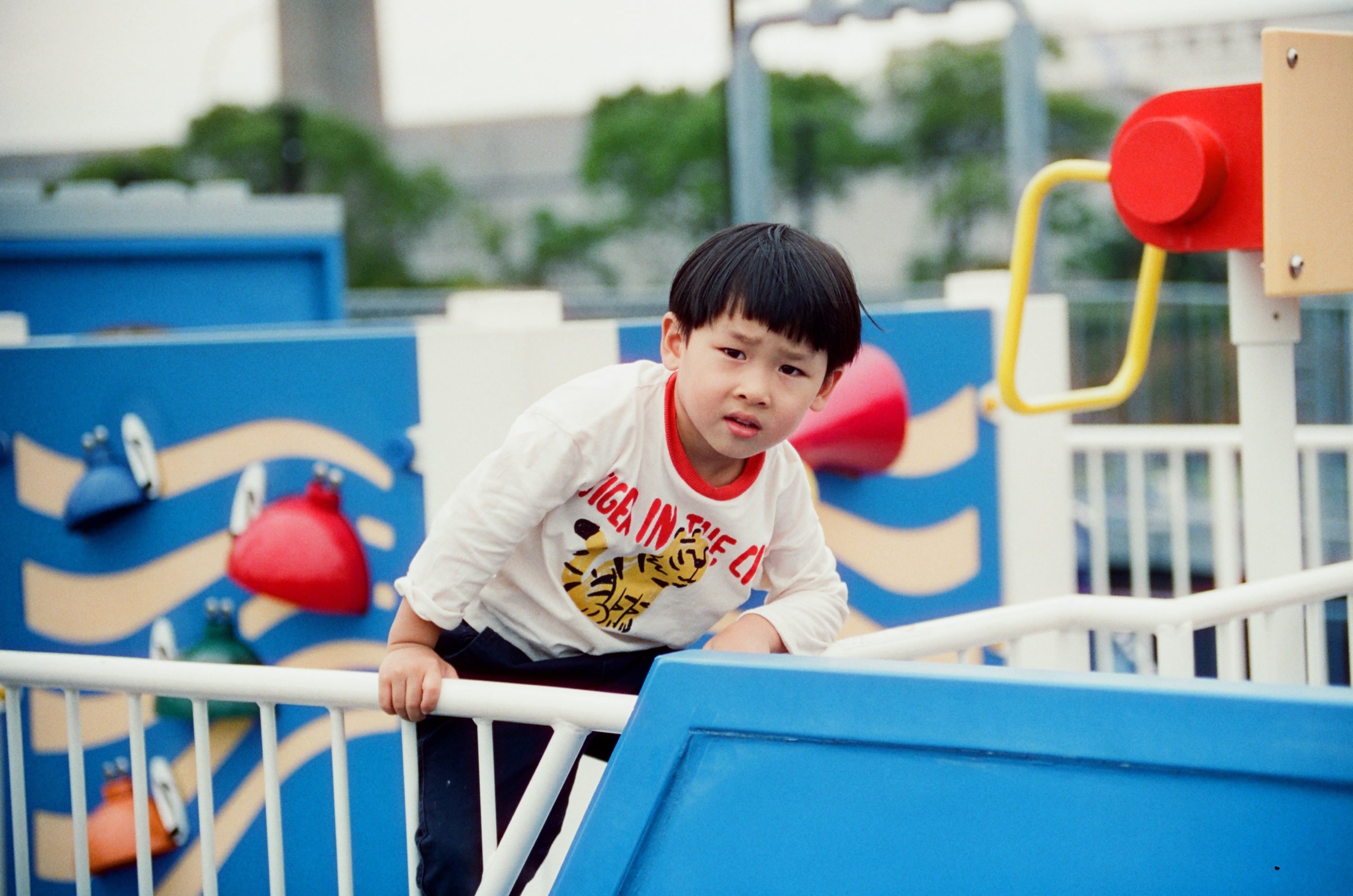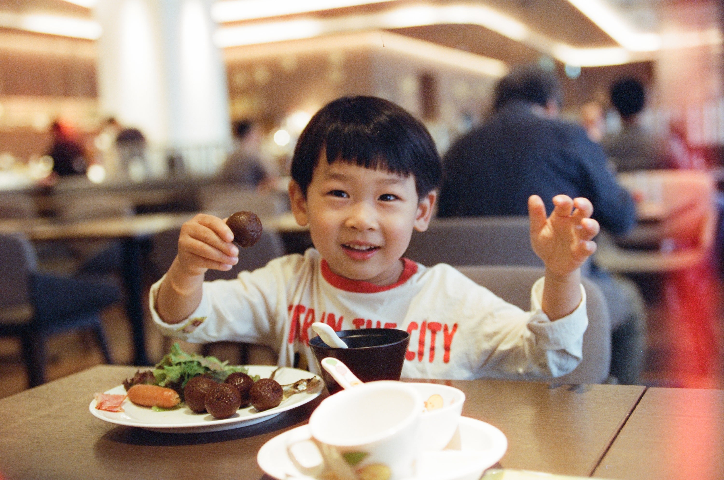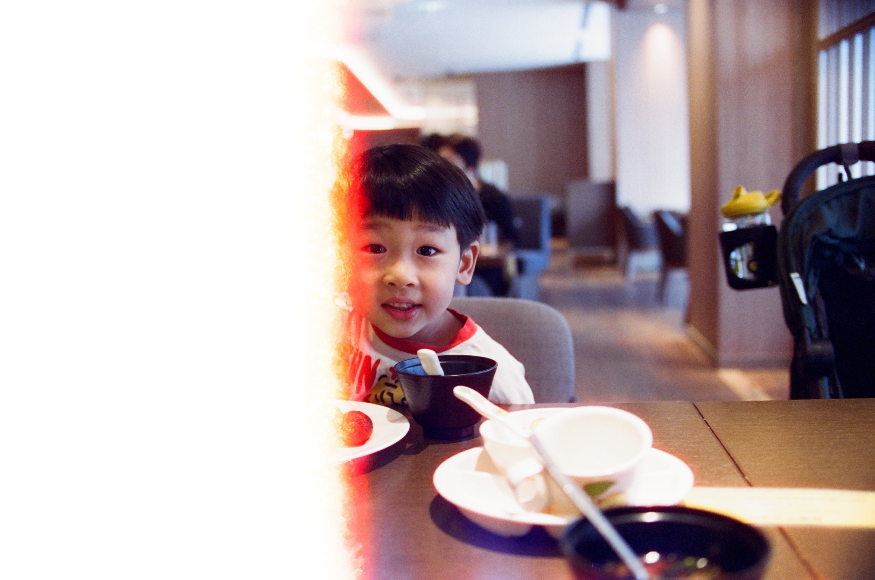 今天是名古屋的第二天,昨天剛下飛機,今天就要直接衝樂高樂園。我在早上裝好新的一卷底片後,就直接下樓吃飯店的早餐。由於是新裝的底片,因此有一半的片頭可以拍,就借兒子拍一下了。我對於 Olympus OM 35-80mm f2.8 的 35mm 焦段搭配 f2.8 光圈可以拍出這麼好看的散景,感到嘖嘖稱奇。