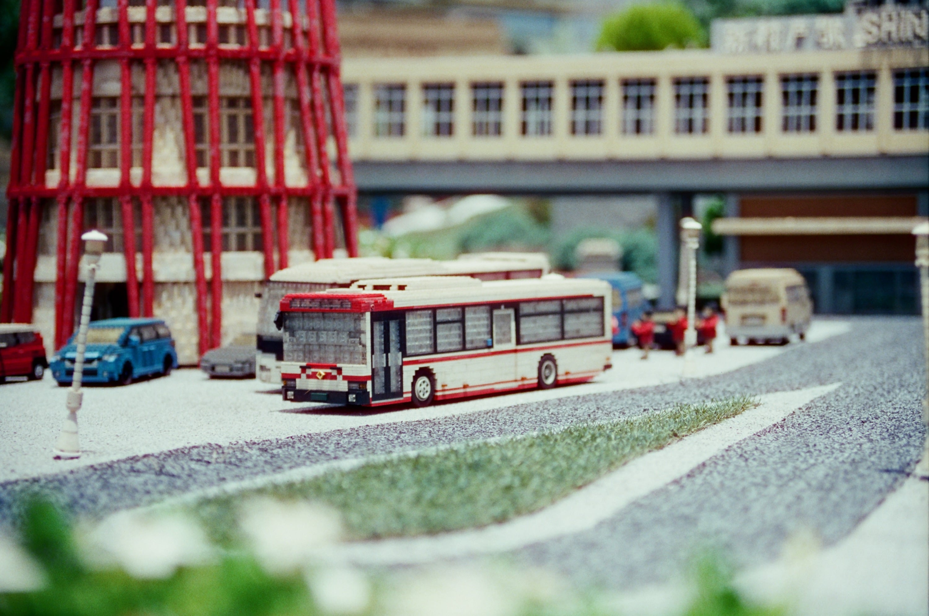 樂高樂園有一區是像小人國那樣的展品,圖為樂高做的日本公車,很大一台,只是用中長焦大光圈拍起來看起來體積很小。