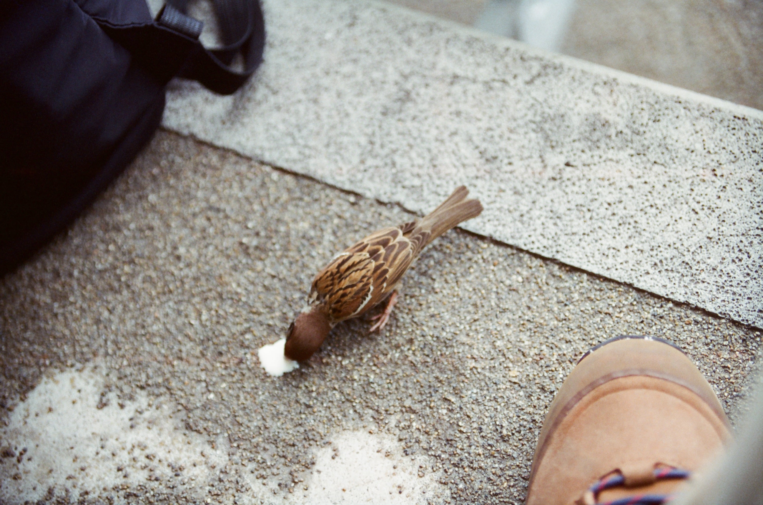 看完企鵝表演後,我們又馬上前往表演場,等待待會兒即將開始的海豚表演,雖然是待會兒,但印象中好像也等了將近半小時那麼久,因為我們想要做一個好位子,於是就提前抵達選位子。這是我們等待表演開始前,飛來觀眾席中找食物吃的小麻雀。
