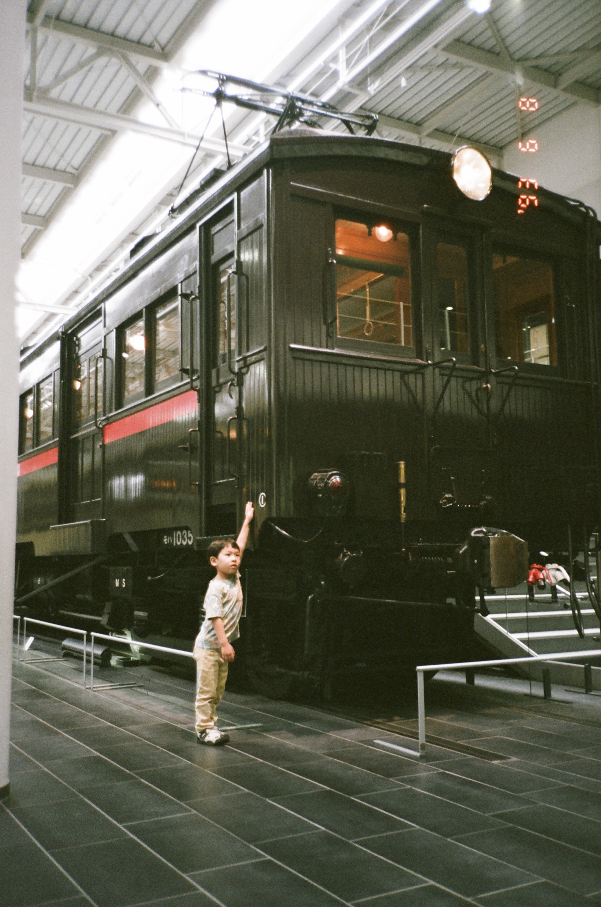 正在磁浮鐵道館,要求要幫他跟每一款車廂拍照的兒子。
