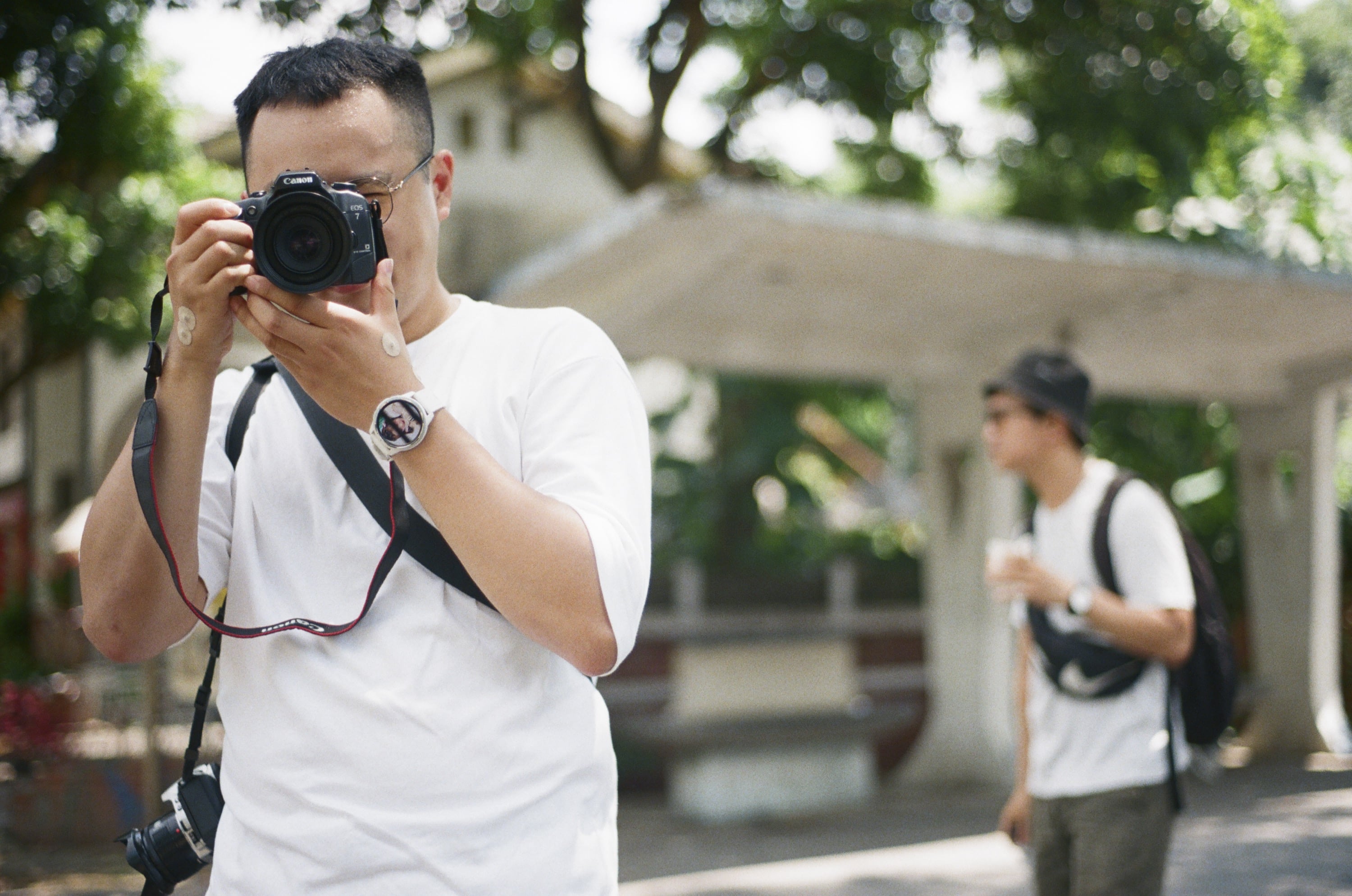 善用自動對焦底片單眼相機的同學,他手上拿著的相機是 Canon EOS 7。對我來說,自動對焦的底片單眼相機,就像魔術一樣,怎麼這麽神奇!而且他的 Canon EOS 7 還具有眼控對焦,就是一個可以根據你的眼球注視方向,決定對焦點的一項功能,不必按十字鍵花老半天調整。我有借來把玩,還真的可以用,超神奇!原來底片時代就有做到這些技術。