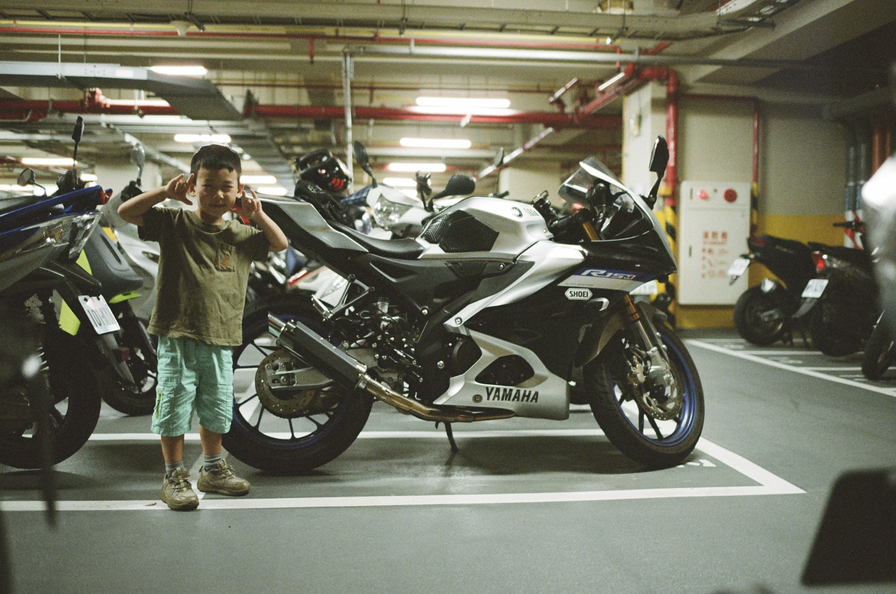 這是上完課之後幾天拍的,有天帶兒子去圖書館借書,我們在停車場遇到我的夢想車 Yamaha YZF-R15M 銀色,兒子很懂我!
