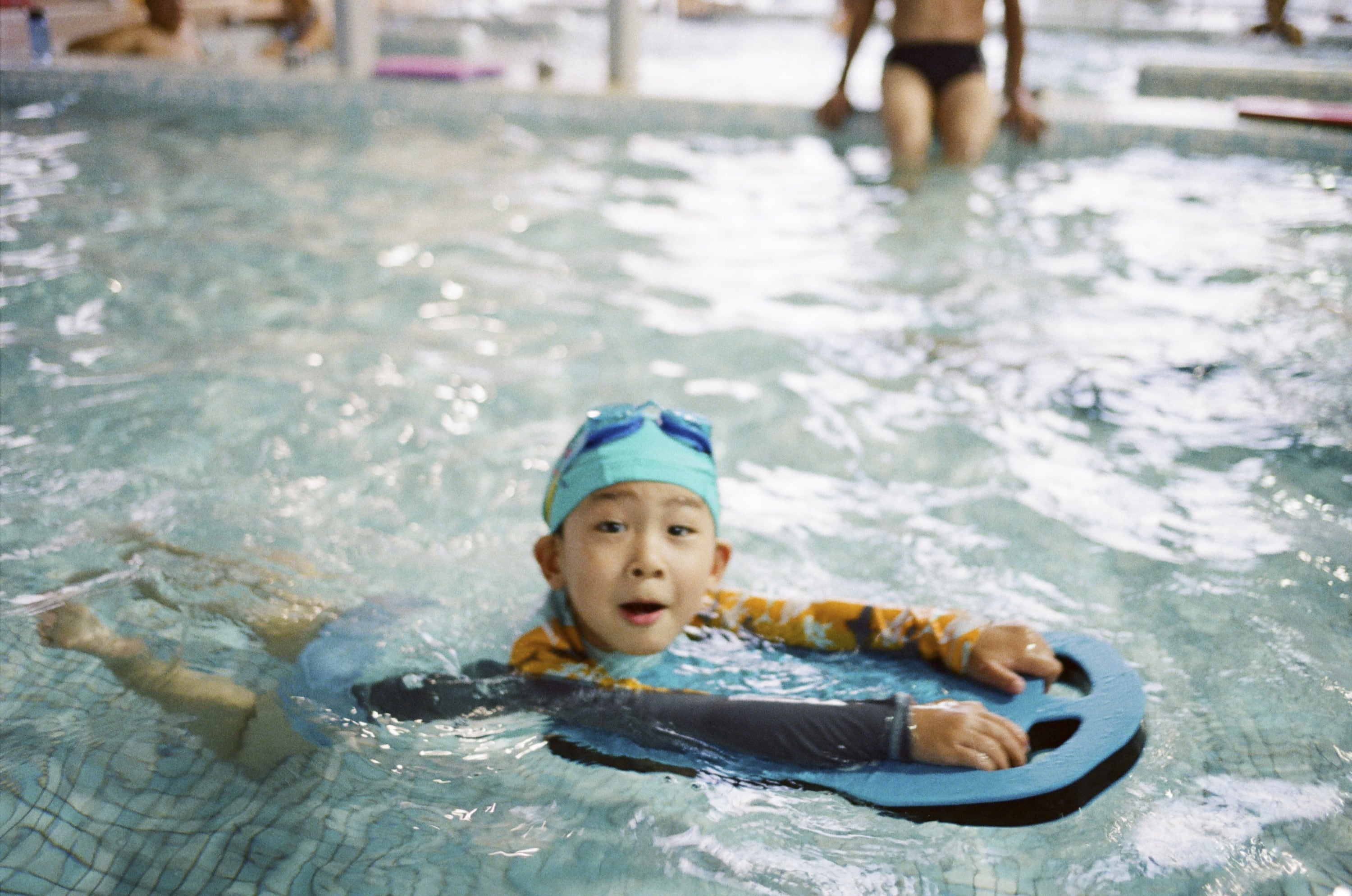 某天帶兒子去游泳池,兒子學會使用浮板踢水前進了。