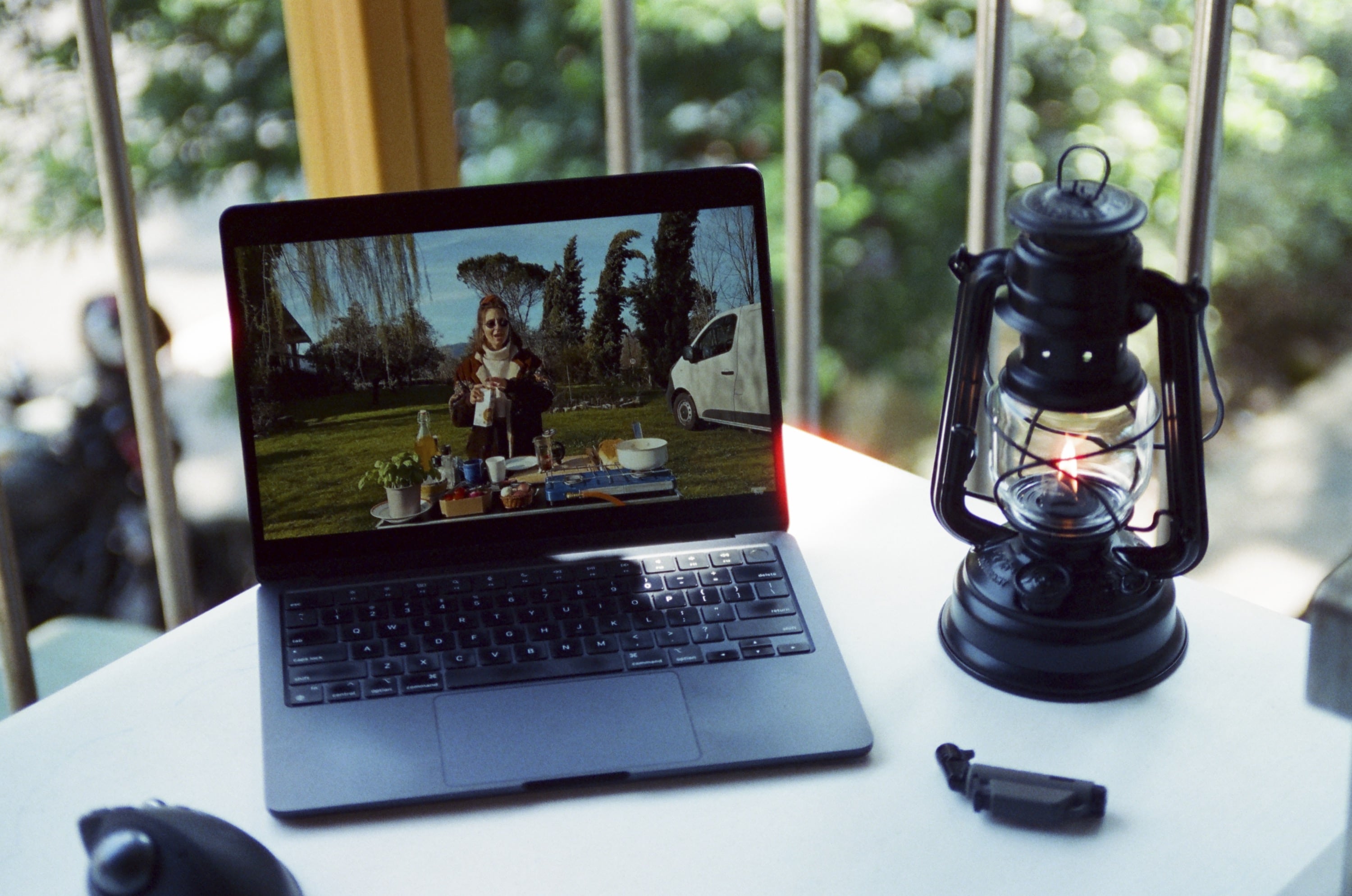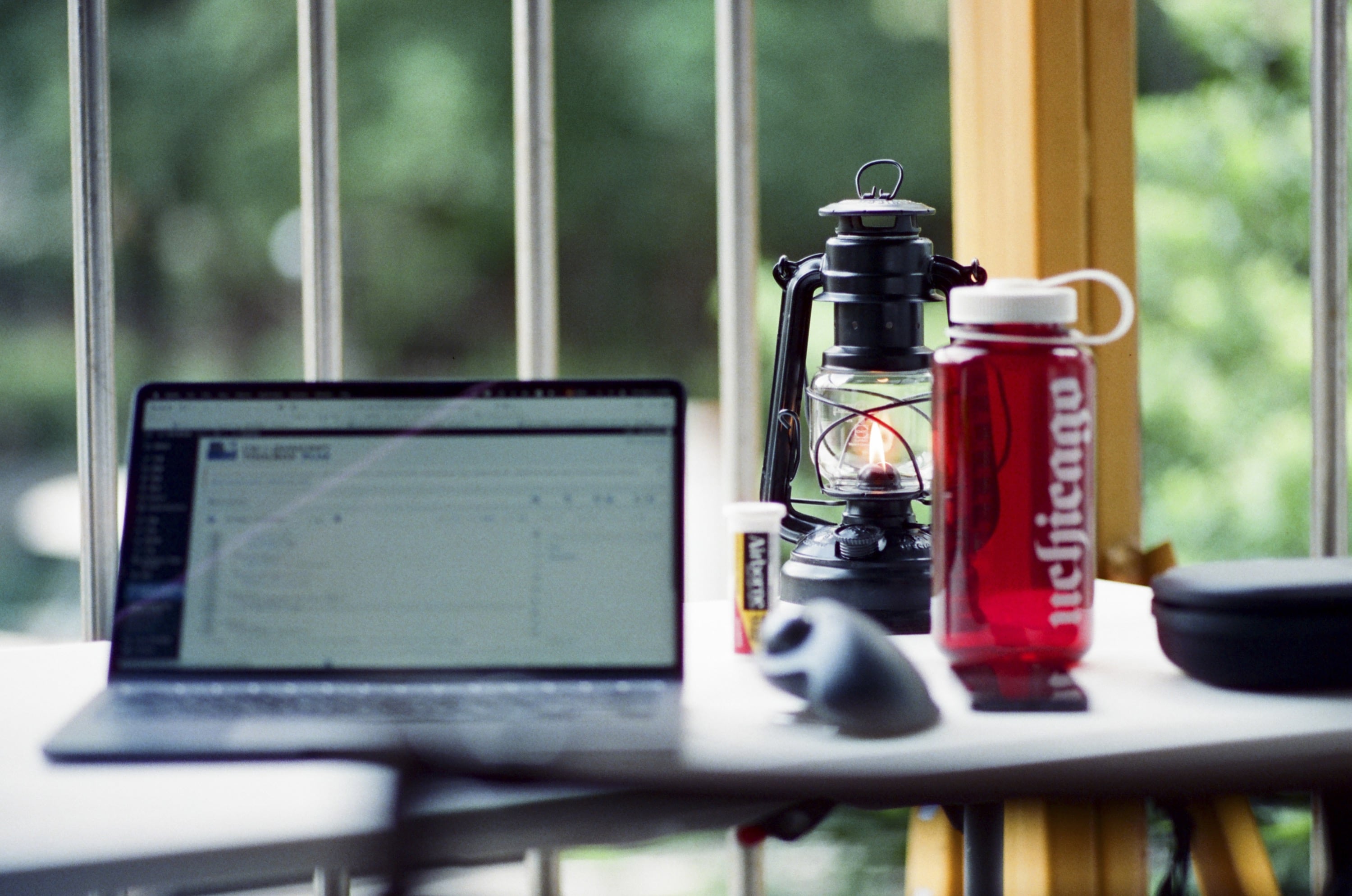 這是平常在後陽台工作的我,桌子就是一張已經沒有再使用的露營桌。桌上擺著一盞 Feuerhand 火手燈,只是純粹的好玩。