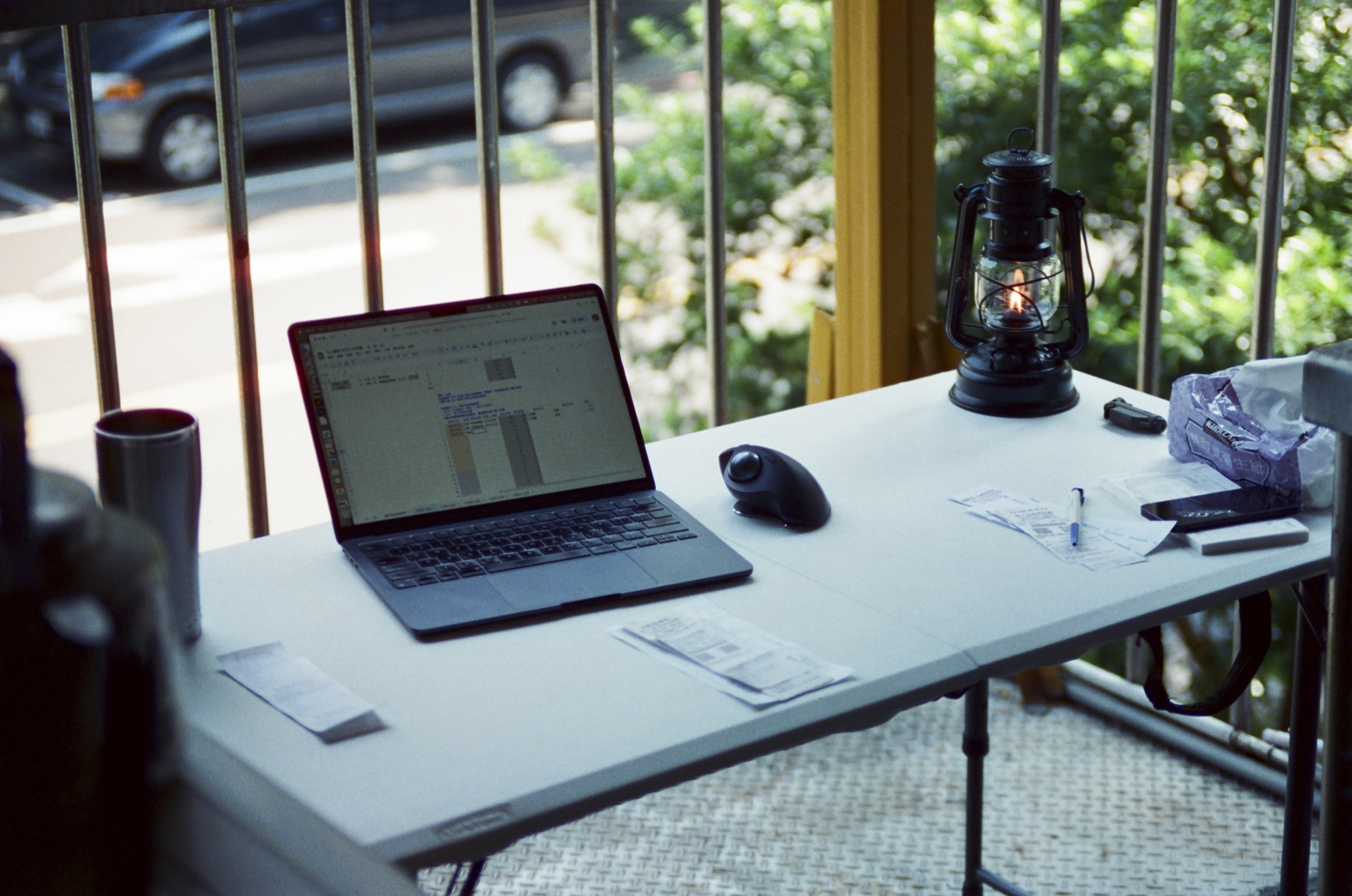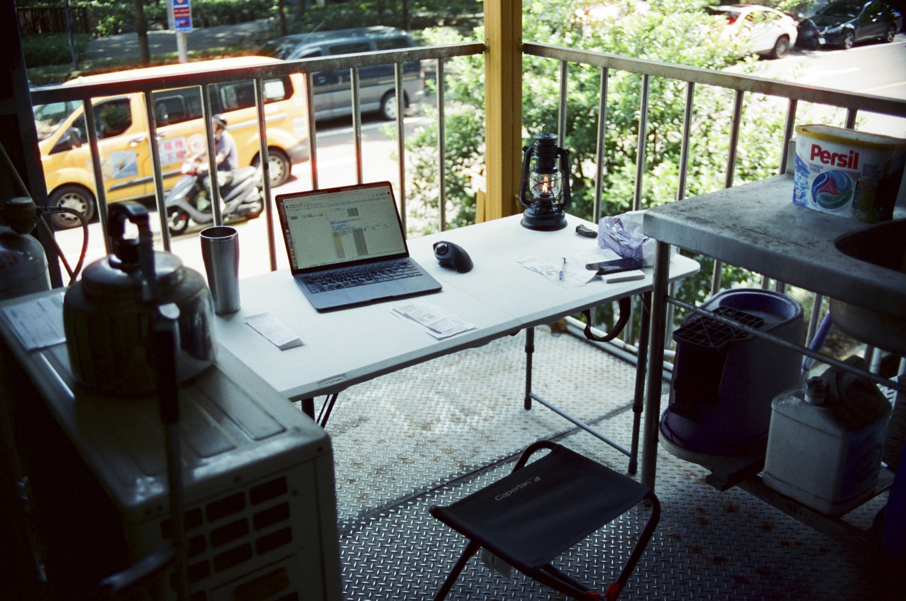 這卷底片的內容幾乎都是我這陣子在家工作的視角,因為我最近把工作地點,從摩斯漢堡,搬回來家裡的後陽台。每天就是坐在大馬路邊,聽著車子和看著行人熙來攘往在工作,有種白噪音,並且與外界持續接觸的感覺,我還滿喜歡,也還滿習慣的。回想起我大學的時候,因為打工買了自己的筆電,因此很常在學校找一個地方用電腦,做課堂上還有社團上的工作。