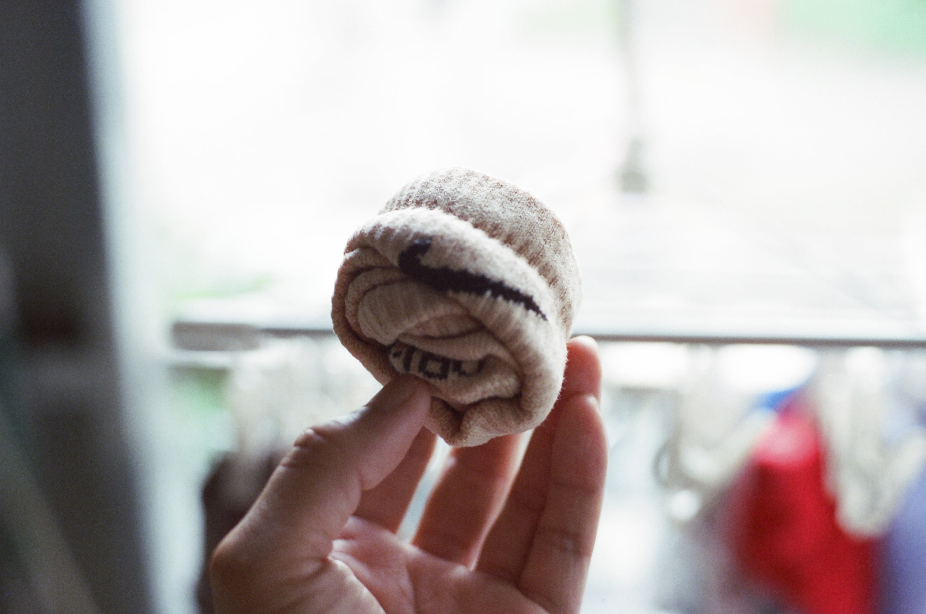 我室友的生活常規就是如此,曬衣服時,常常會見到沒有攤開就被丟進洗衣籃的衣物,不過看在這襪球 Logo 有對準的份上,於是給予一張底片記錄之。