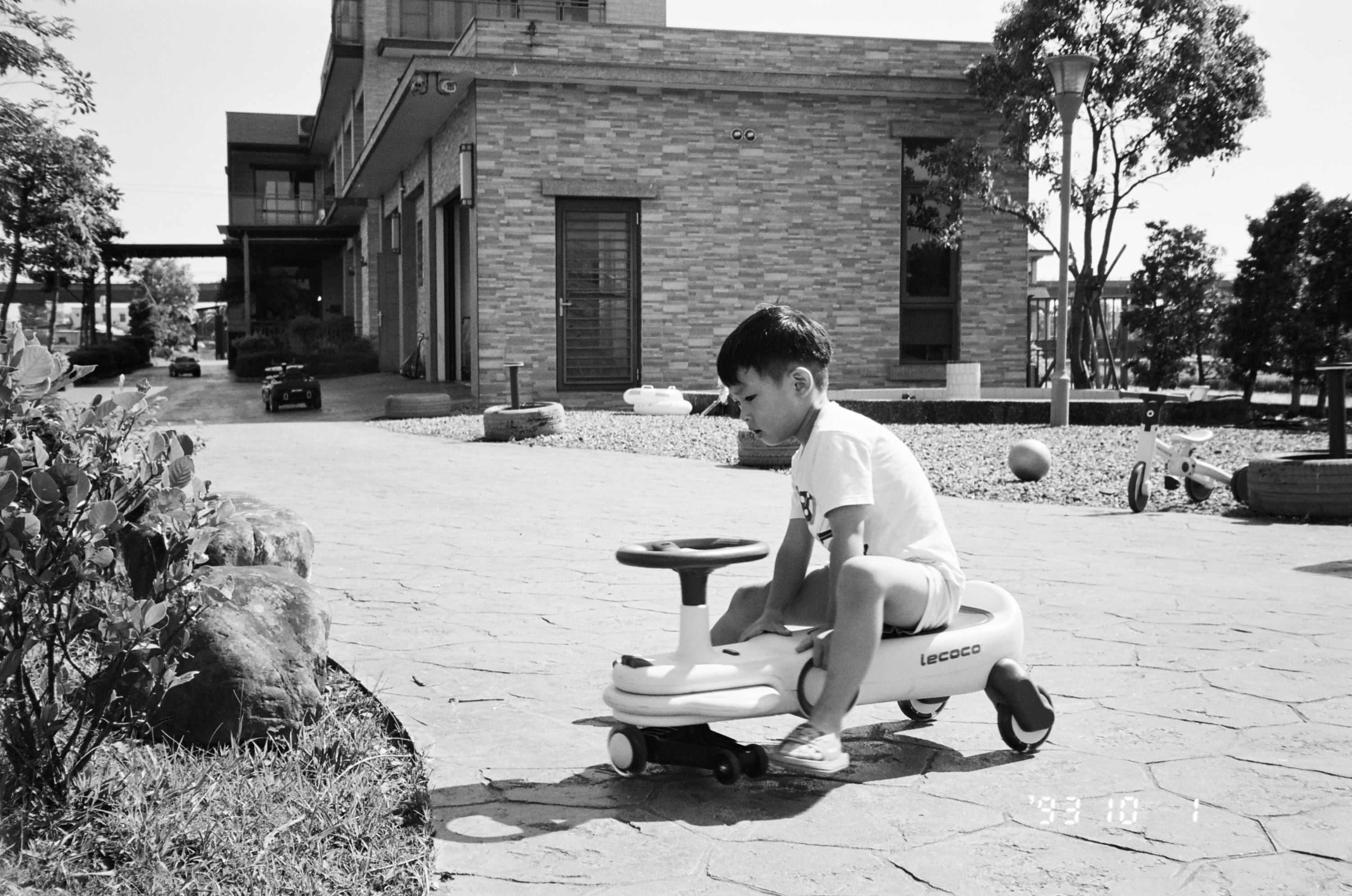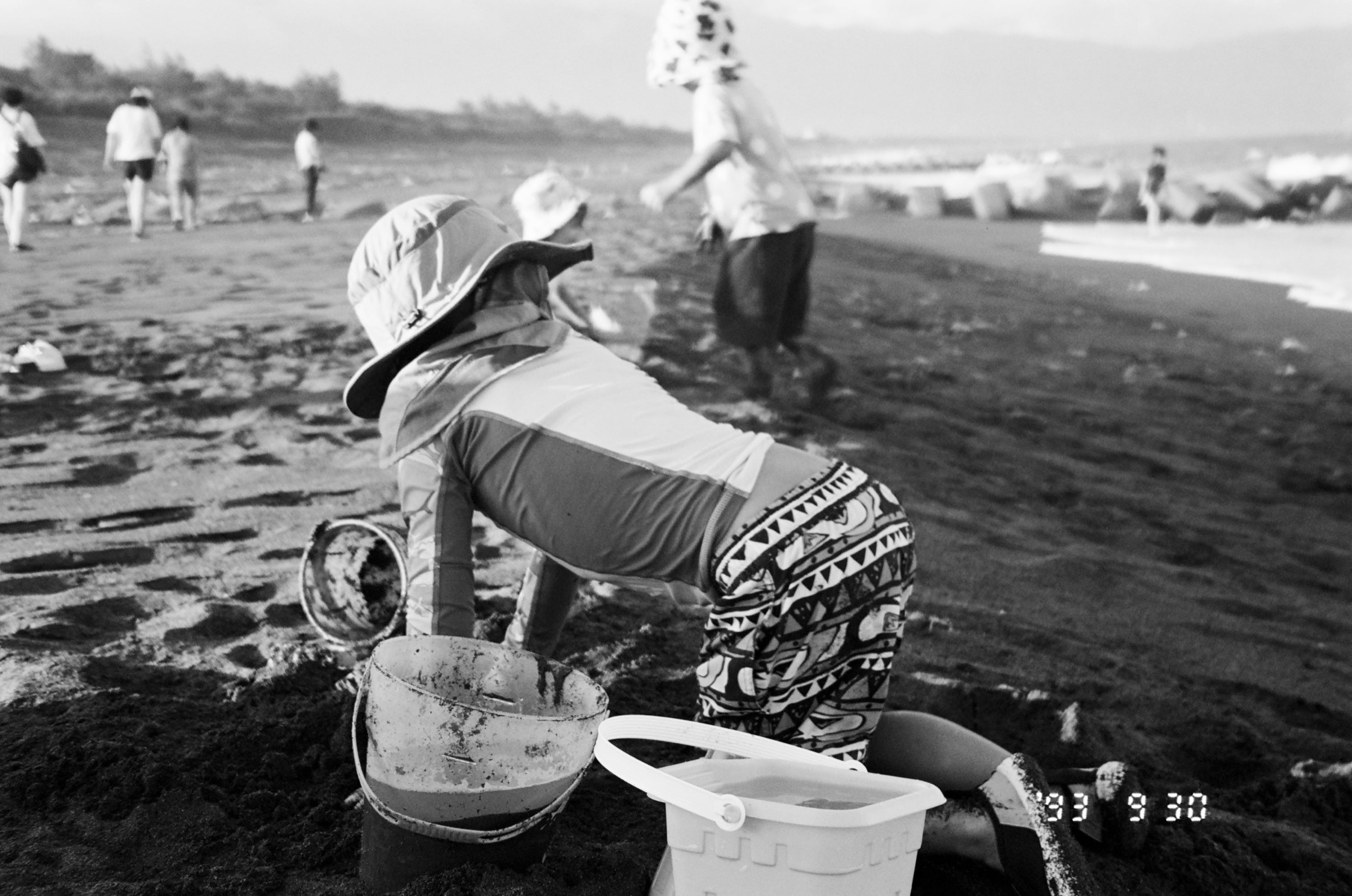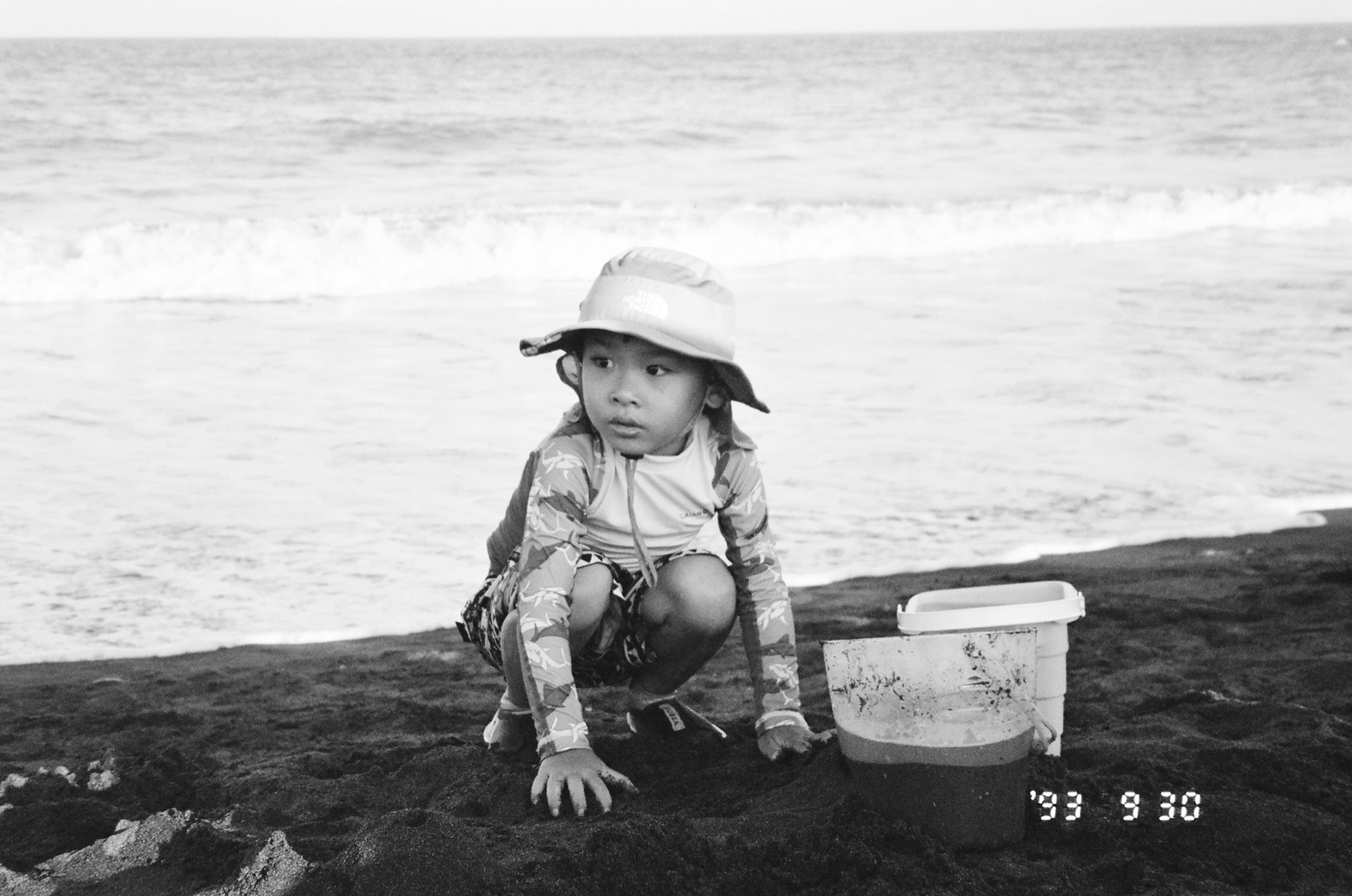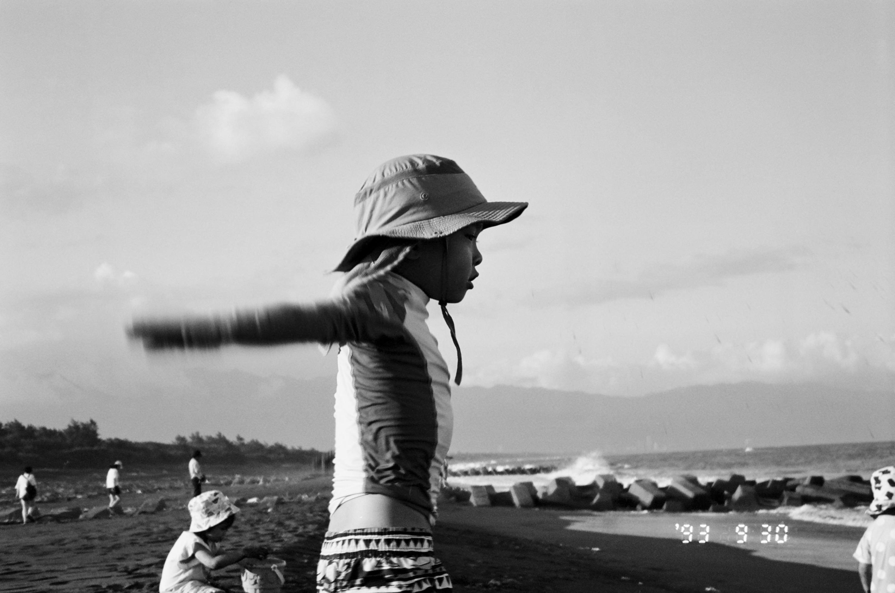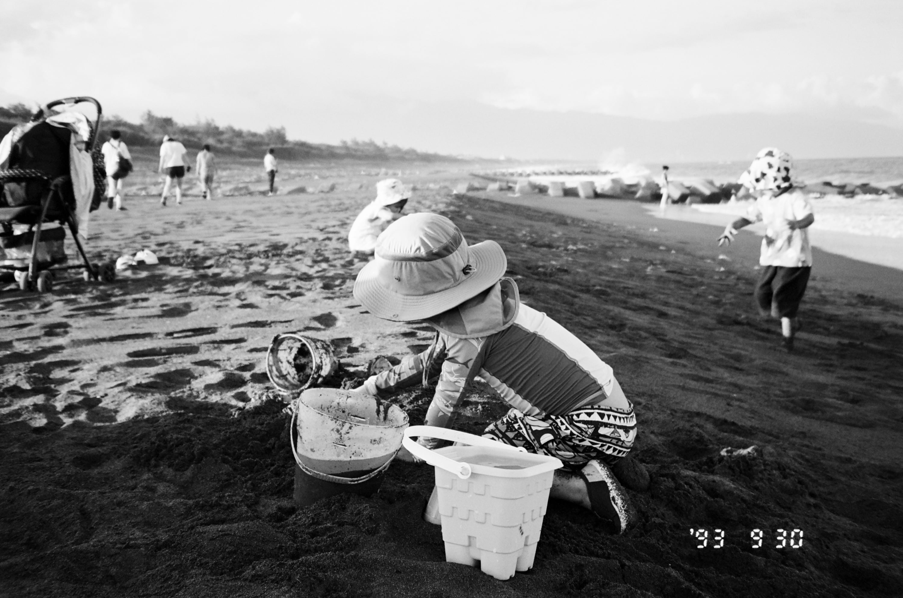 這卷底片主要紀錄了 2023 年 9 月 30 日那天,我們前往宜蘭壯圍和大學同學進行兩天一夜的中秋烤肉活動。這張照片是民宿附近的「永鎮海濱公園」,我們到了壯圍,先帶兒子到這個海灘玩一下,玩完才去民宿和大學同學們會合。