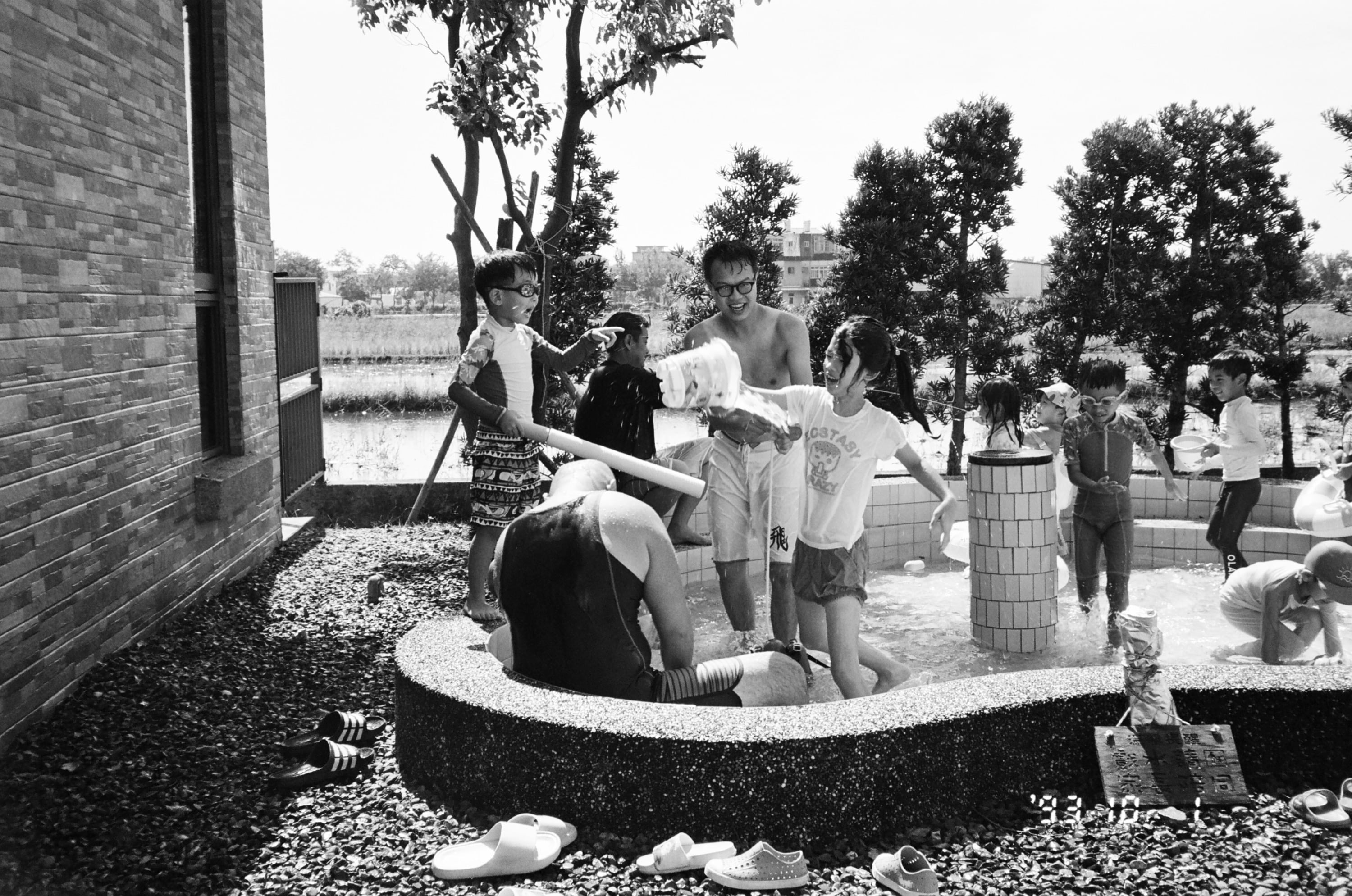 兒子在戲水池戰鬥中,我隔岸觀火。