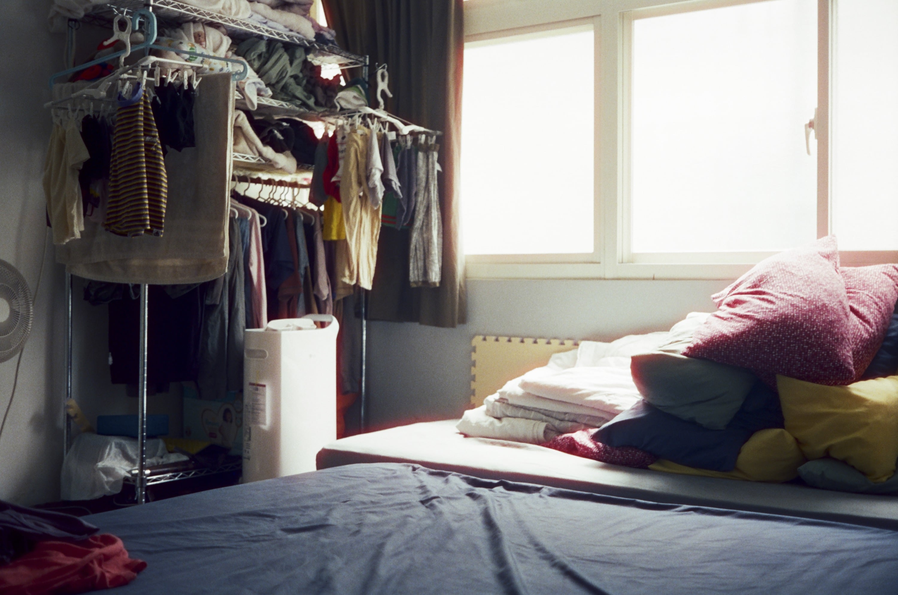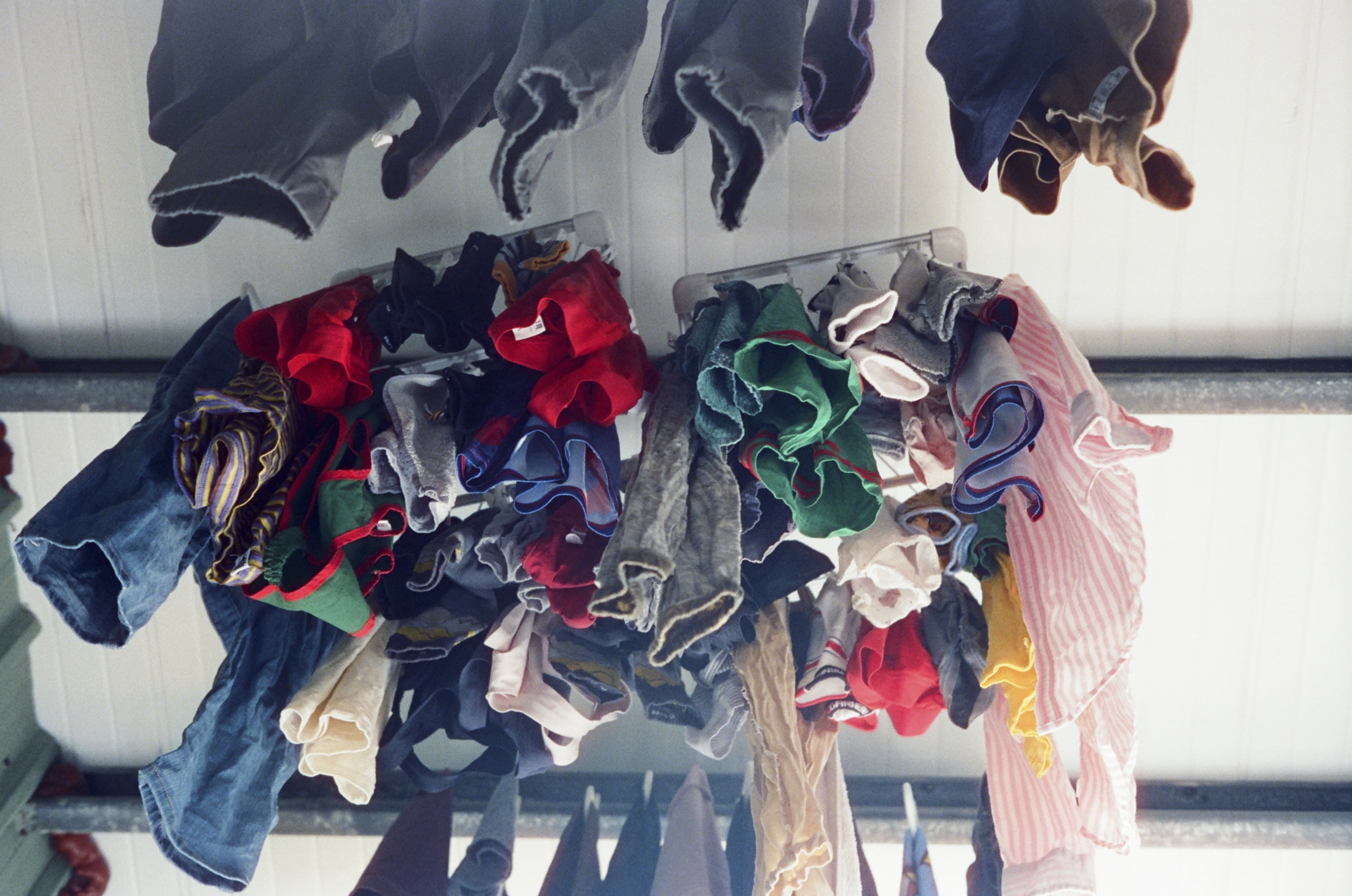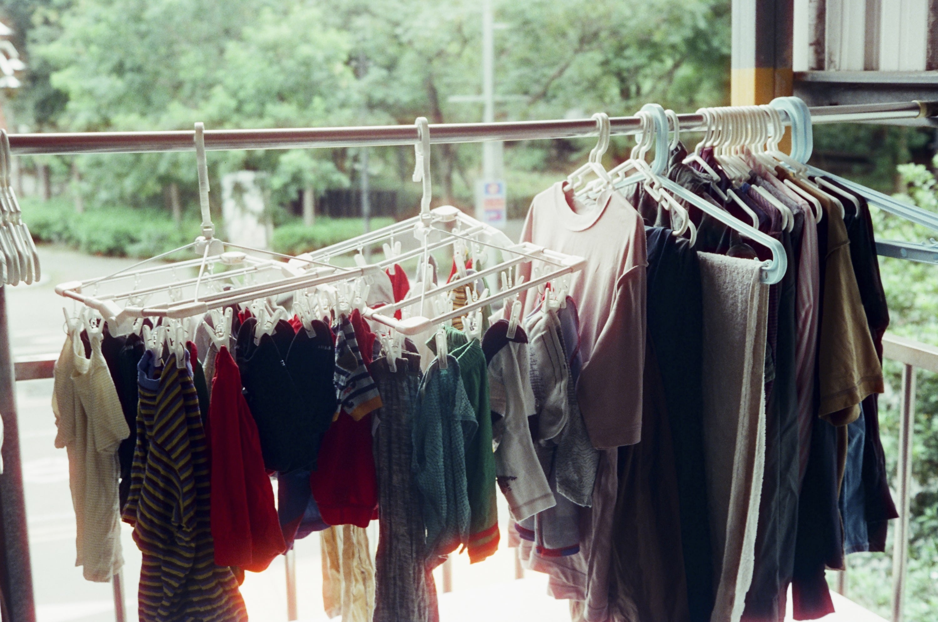 由於我現在都在家裡後陽台工作的關係,因此在曬完衣服之後,我就會把衣服吊在天花板上面,以騰出空間,每次曬完衣服抬頭仰望,都有一種被「大衣壓境」的感覺。