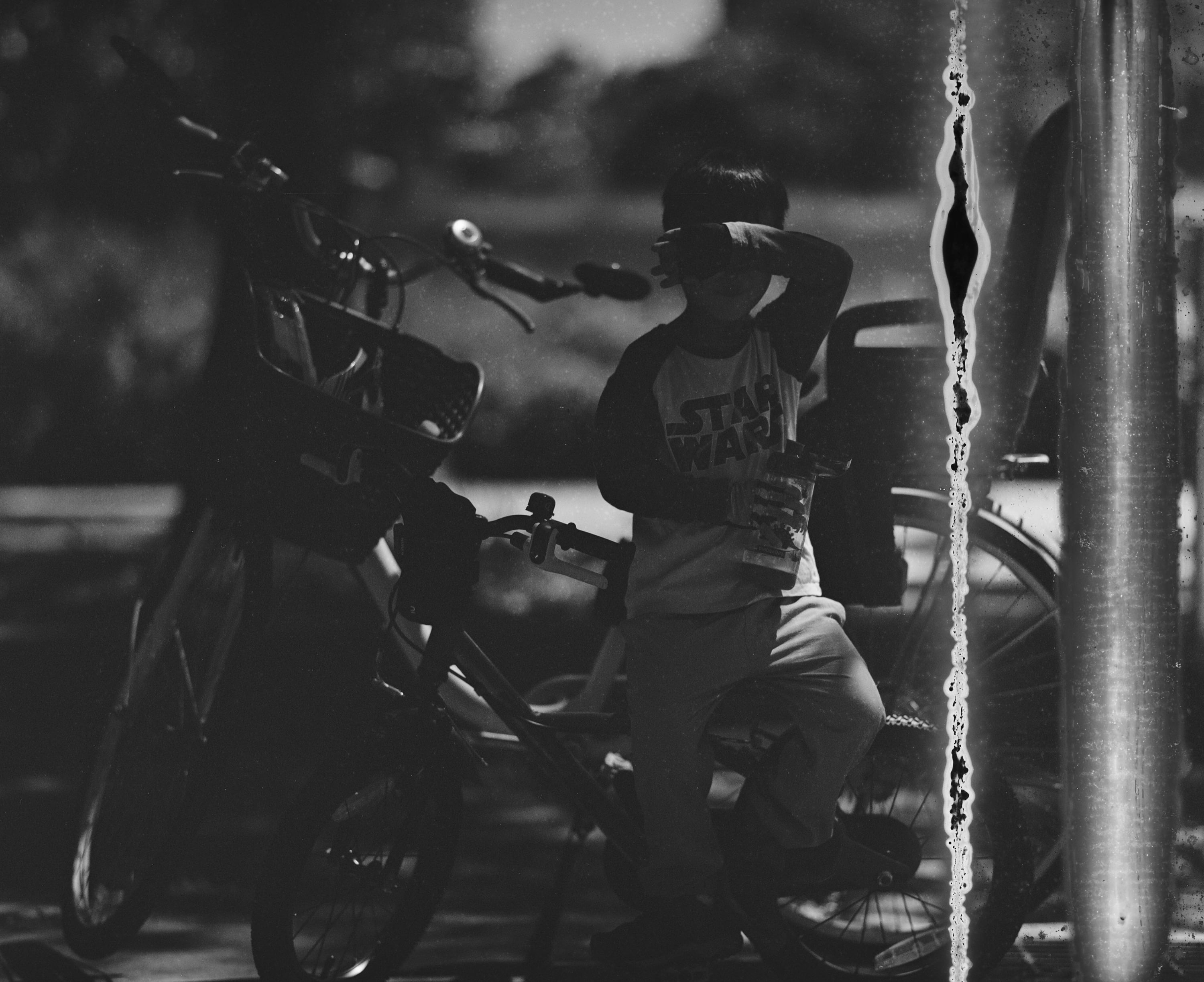 我好喜歡這一張照片,雖然就成像結果來說非常災難,可是我覺得太特別了。不知道為什麼,我覺得 Pentax 6x76 75mm f4.5 Takumar 這顆鏡頭在狹小空間之內總是可以發揮得出乎意料的好,即便它的光圈不夠大,需要更長時間的曝光。或許這就是片幅優勢的展現,即使帳面規格只是 75mm f4.5,但拍出來的畫面結構和層次卻非常驚人,恰到好處的景深,恰到好處的視角範圍,形成具有獨特張力的磅礴畫面。看到這張照片,我第一個反應是「他只是個四歲小孩啊!幹嘛要他拍這種很像悲傷情歌專輯封面的照片呢!」。實際上,這張照片只是某天我開車送兒子上學,我停好車之後,正在等他吃完小餅乾,吃完我們就要準備下車進學校了。