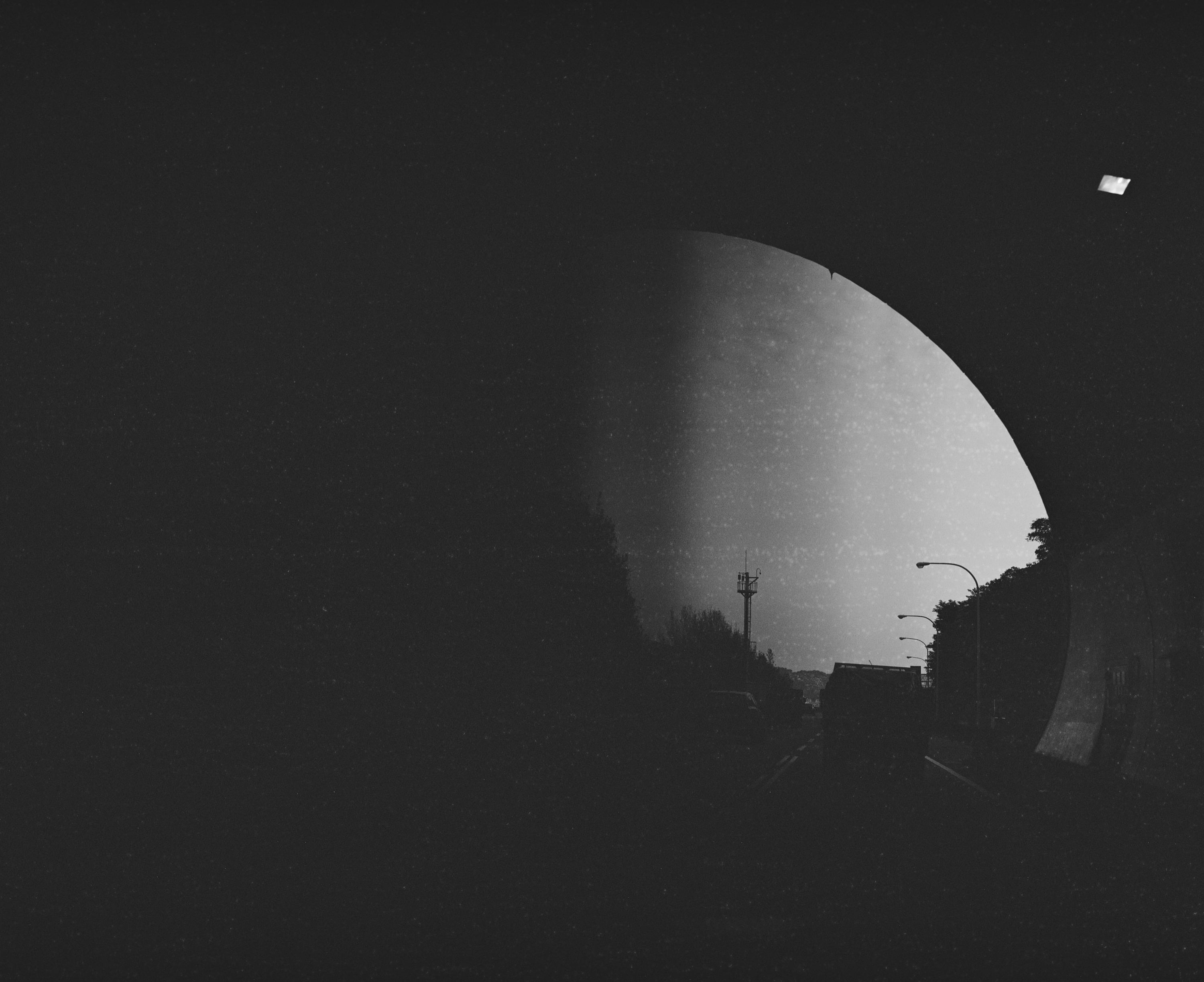 這張照片顯示這台相機的高速快門有問題,圖中黑色的部分是速度跟不上的快門簾。這張照片攝於國道三號上,正要出一個隧道的瞬間。
