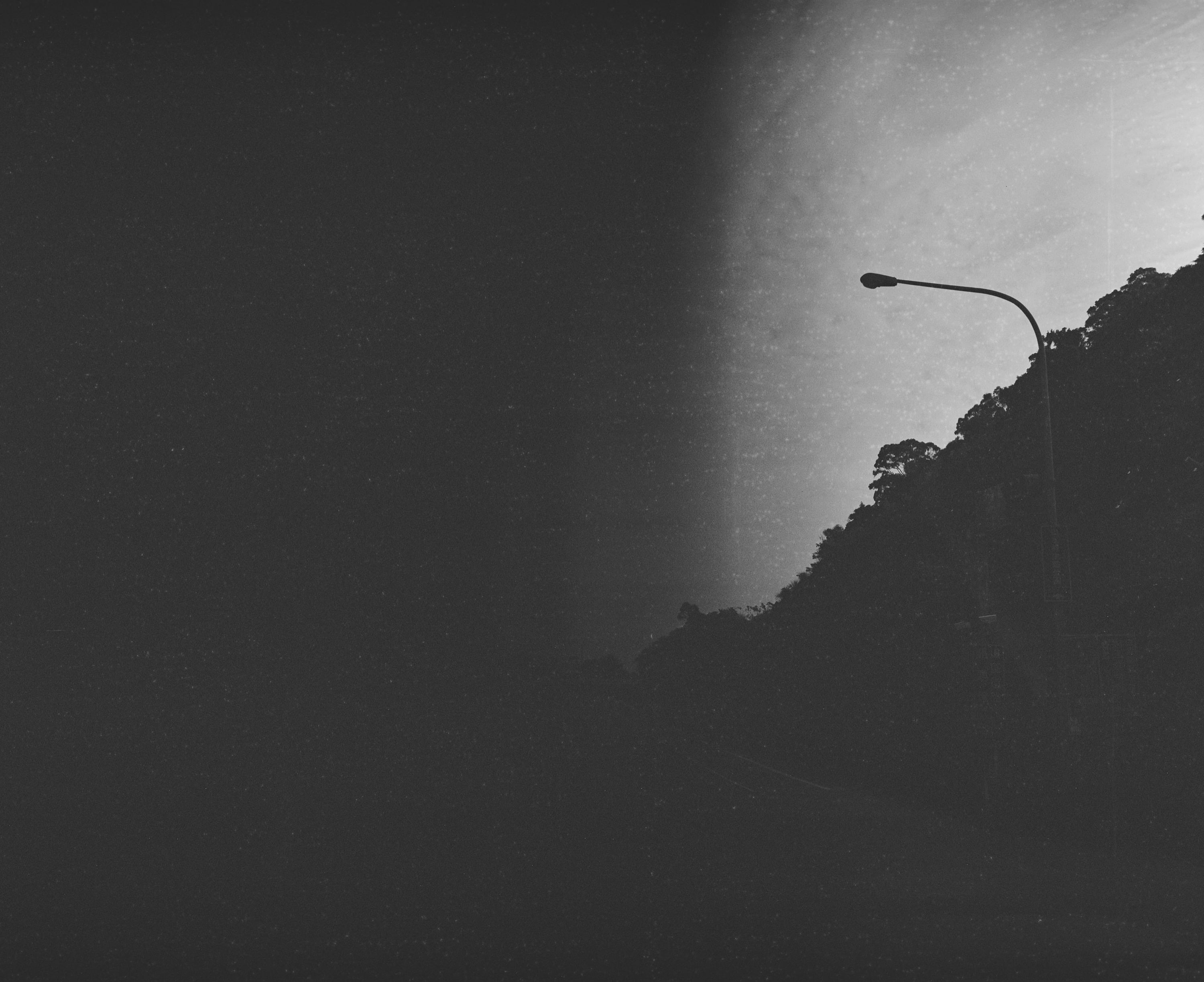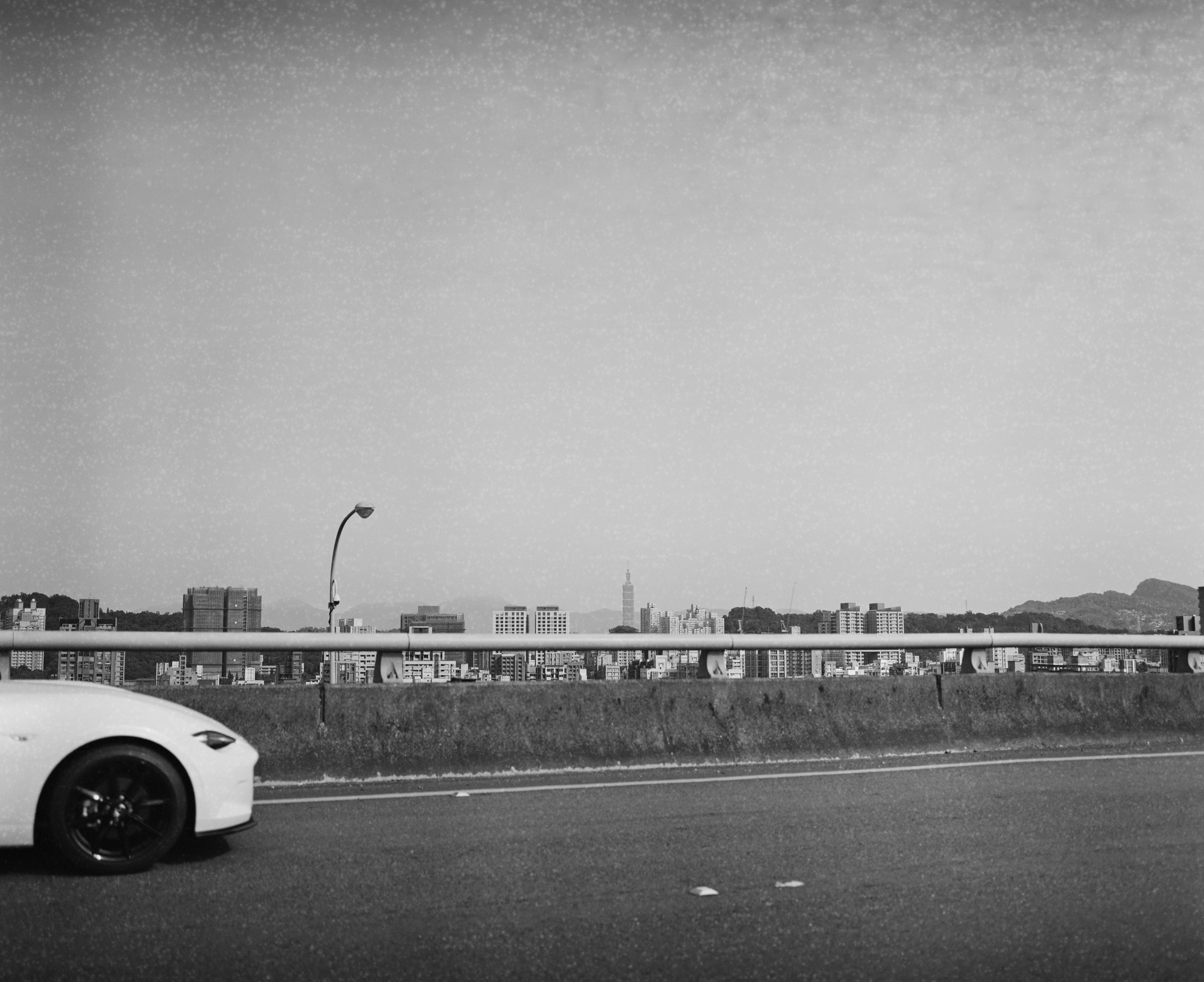 這天,我正開車沿著國道三號前往南港,要找朋友吃飯。那天的天空很美,在此之前我還沒使用過中片幅相機拍過高速公路上的景色,於是就用半盲拍的方式拍下來了張照片,所謂半盲拍,是因為我先將鏡頭對焦調整到無限遠的位置,接著用右手舉起相機,左手握著方向盤,先快速轉頭瞄一眼觀景窗的內容之後,最後按下快門盲拍。這張照片使用手機測光,但看起來似乎曝光不足,我原本想靠自己的感覺測光,當時我原本心裡的參數是 1/1000 和 f4.5,看來我是對的。