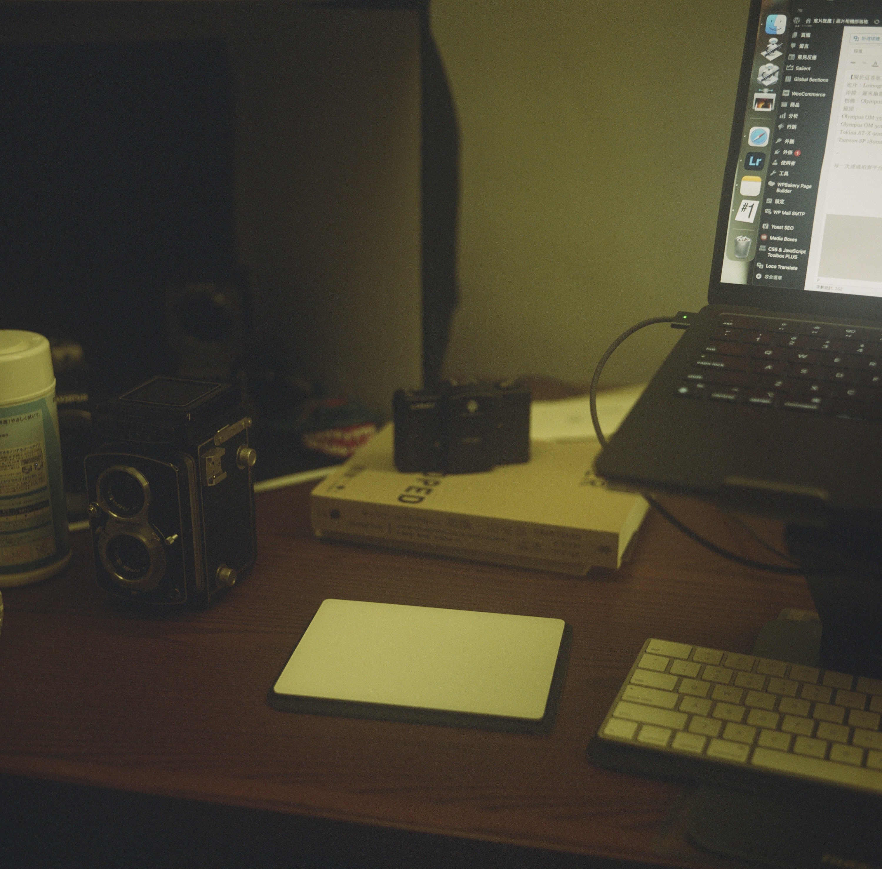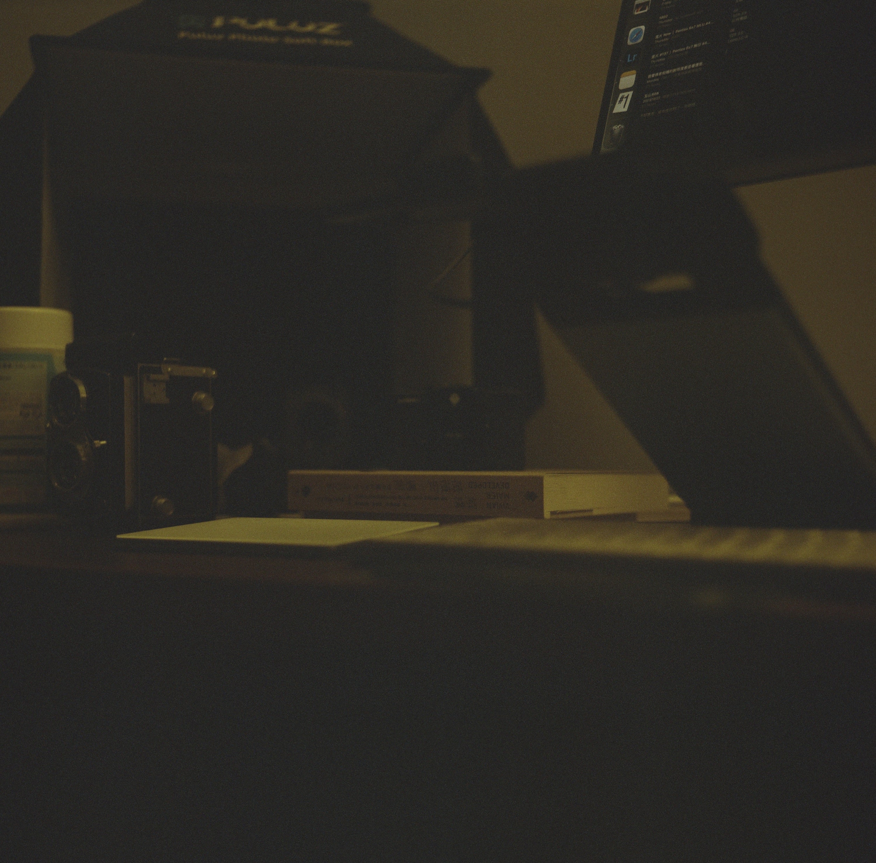 目前這卷底片所使用的 Olympus Flex 3.5 A II,鏡頭採用 75mm f3.5,最近對焦距離 0.82m。因為它買來的時候蒙皮有老化缺損的問題,所以我一直沒有拍,因為很怕它的蒙皮在沒有重黏的情況下會愈掉愈多,再加上它的鏡頭有明顯的霧化,我原本想說先將它送內湖高昇請羅師傅處理後,再拿來用吧!不過因為一直還沒排到隊,在不想等待的情況下,我就直接拿來用了,我將原本已經半脆化、要掉不掉的老舊蒙皮全部撕下,等待有天再去買新的蒙皮貼上。