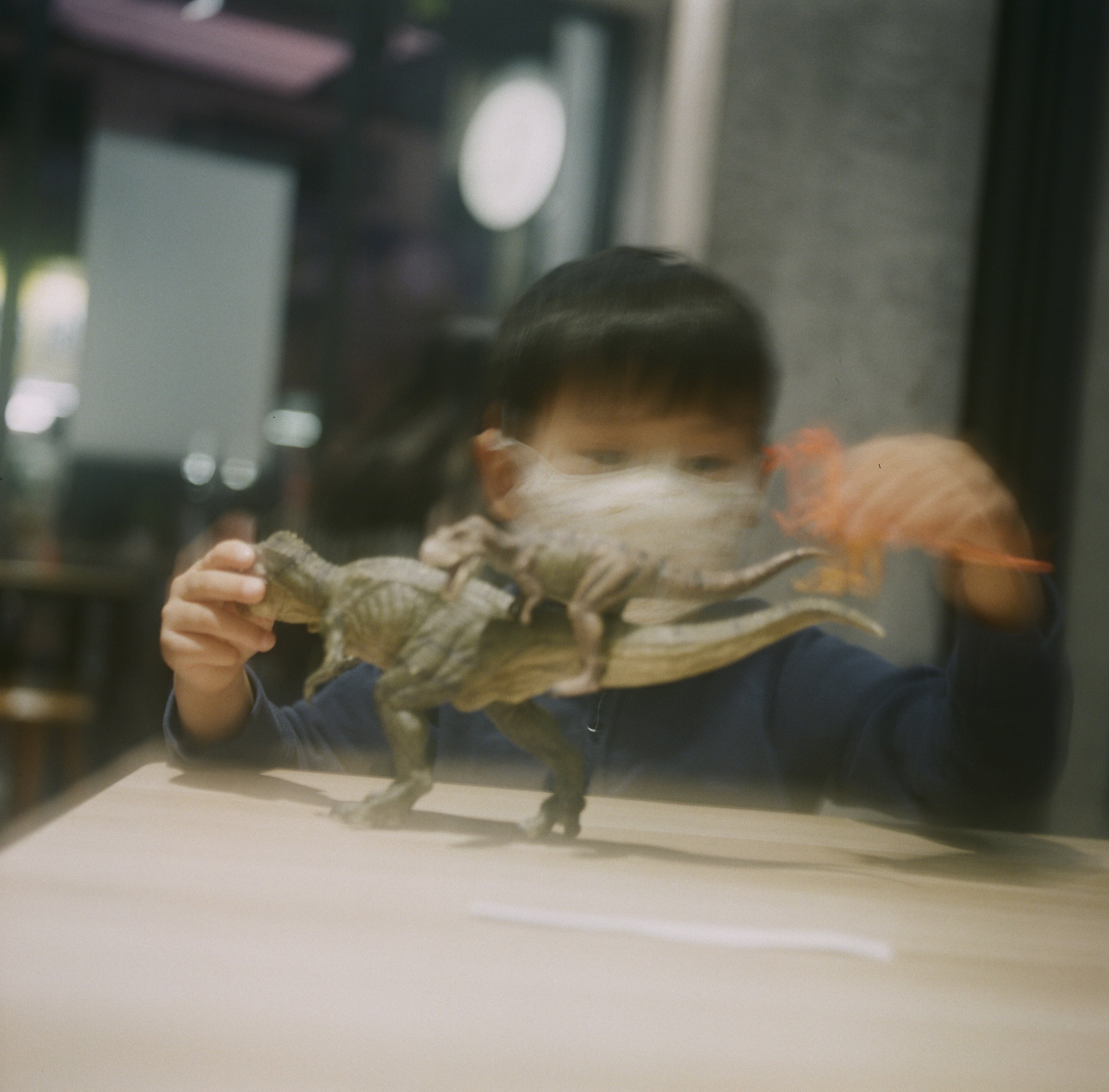 某天,帶兒子出門吃晚餐,兒子這陣子非常喜歡吃海南雞飯,每天都吃可以吃不膩。圖為他在店內玩他帶的玩具。
