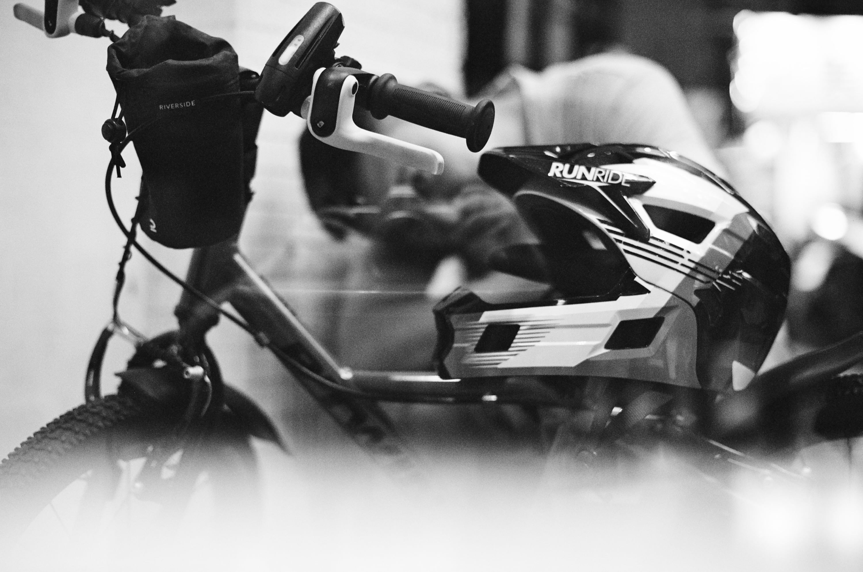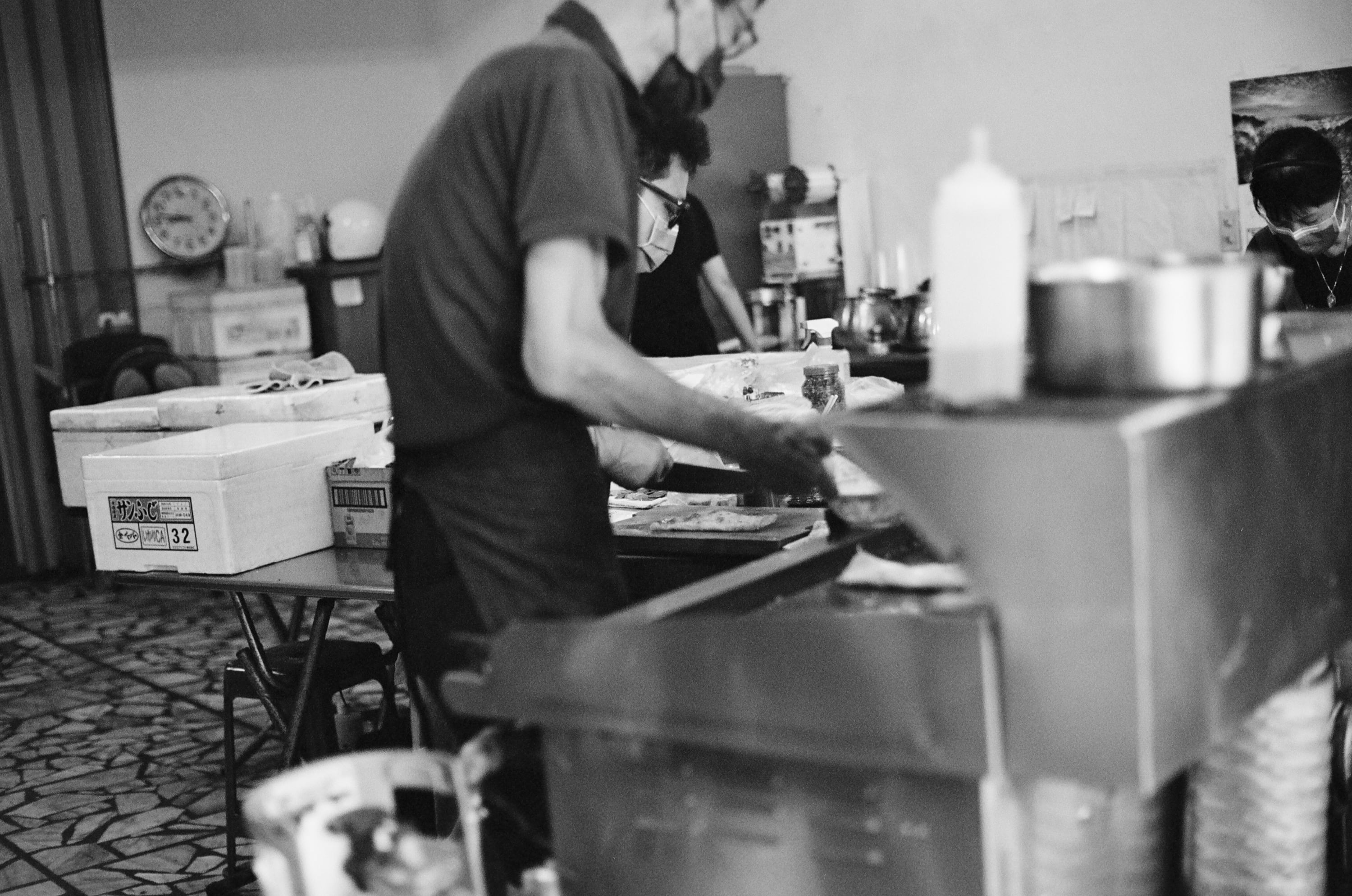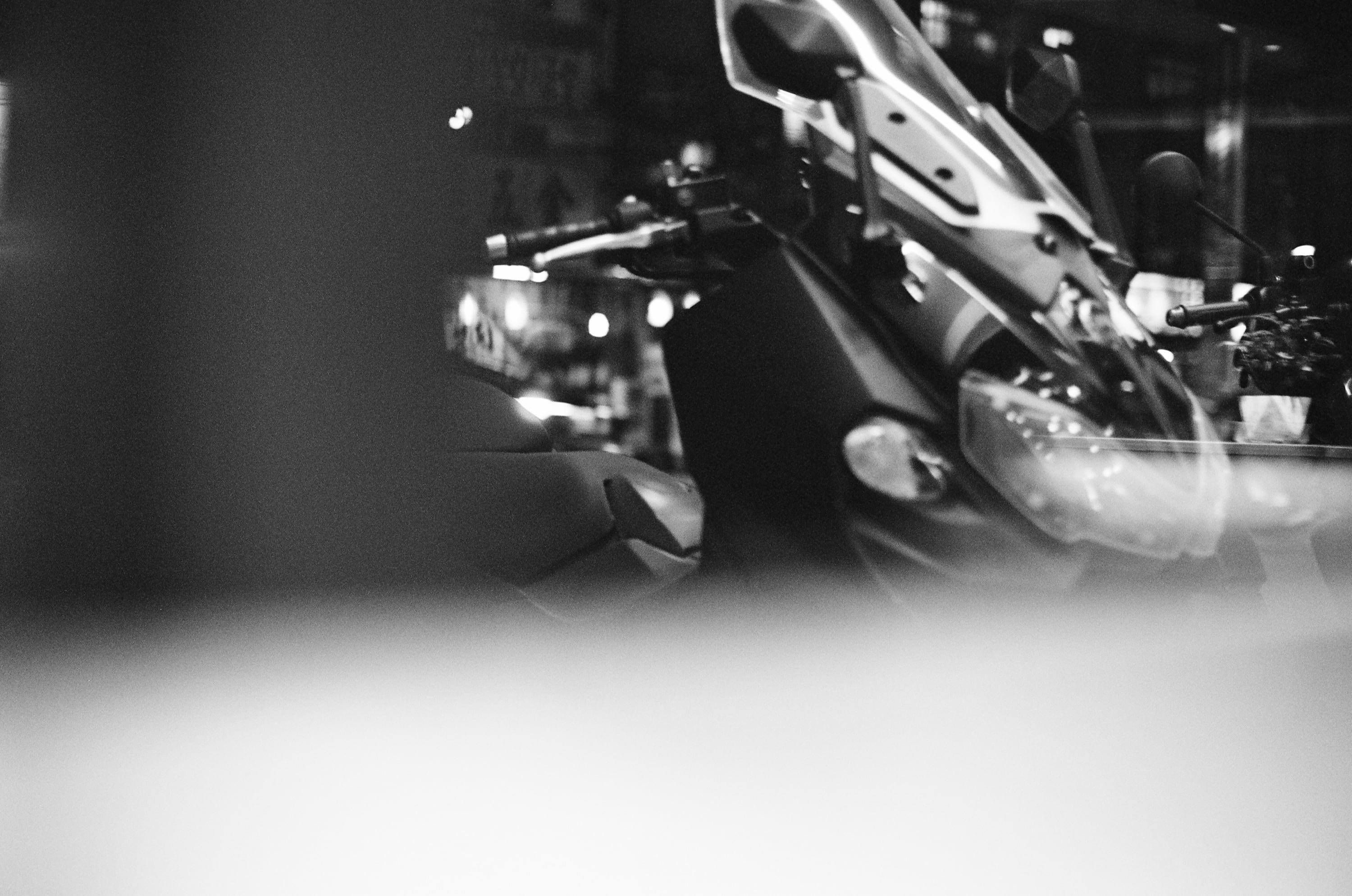 某天平日下課後,帶兒子出門吃晚餐,因為當時我帶著這台相機在身上,兒子說想拍拍看。這張是他拍的,我們坐在餐廳的玻璃窗前,前方剛好停了一台機車,畫面下方霧霧的東西,其實是餐廳的桌子,因為這台 Nikon FM 比較重,因此兒子是直接將相機放在桌上按下快門,所以就拍到桌子了。