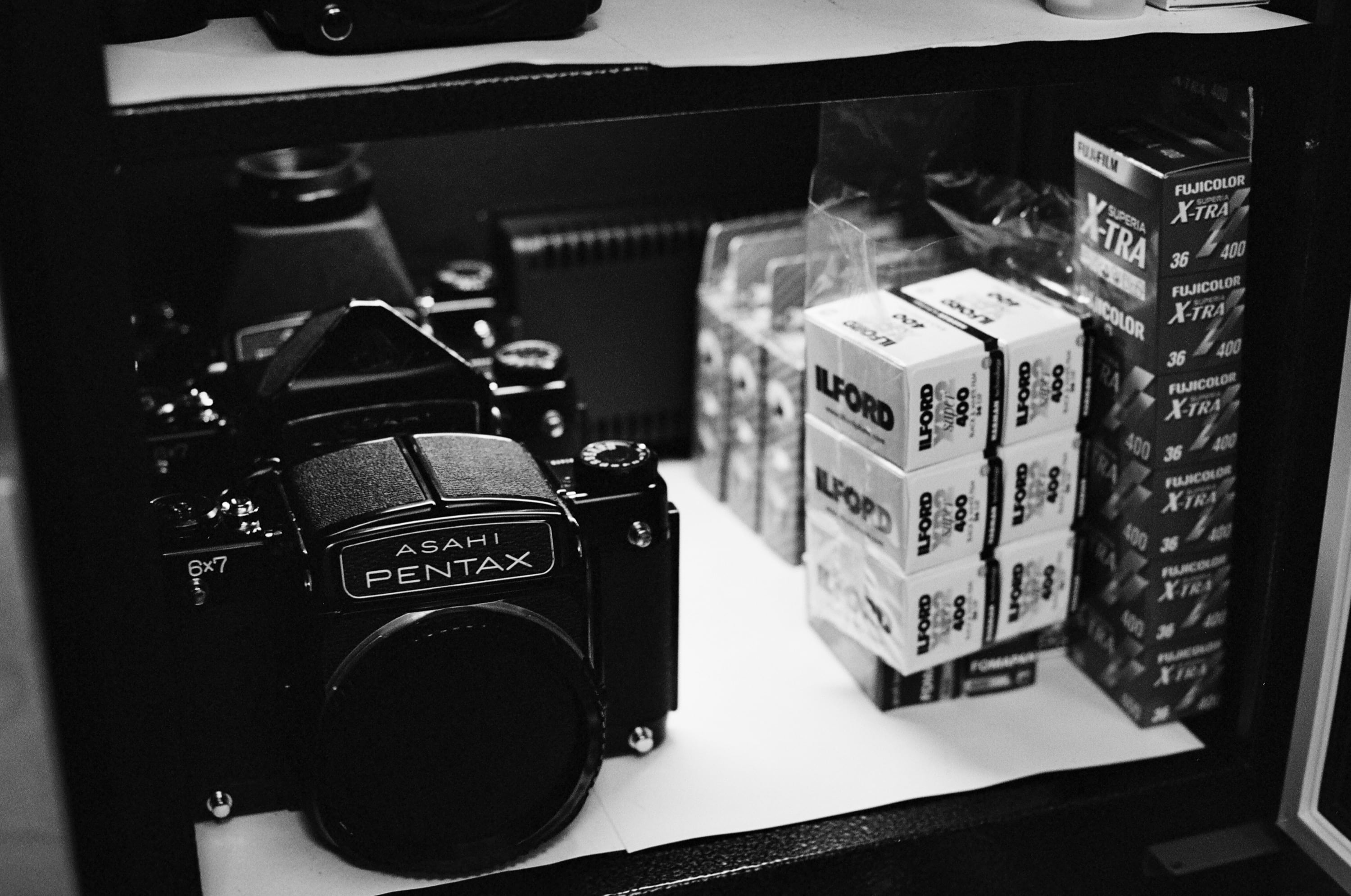 最近把具有測光頭的 Pentax 6x7 給賣了,只留下其他三種版本的觀景器。我非常喜歡早期扁扁的 Pentax Logo,不管是 Asahi Pentax 還是 Pentax,覺得那個時期的機身設計都很美。這張照片順便記錄一下那個時候的防潮箱狀態。