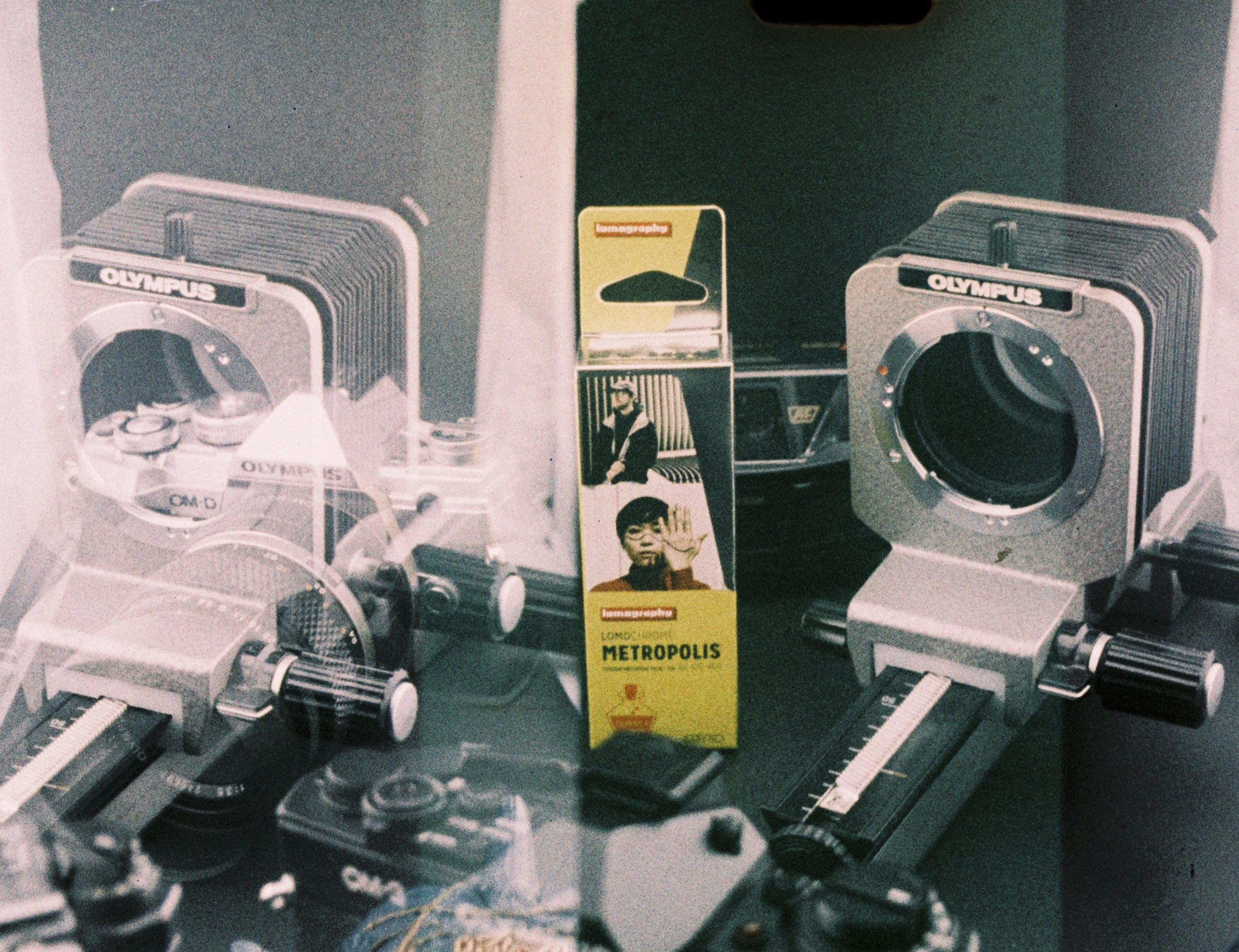 第一次用 110 底片,還不確定有沒有所謂的「片頭」,也不確定有沒有所謂的「燒片頭」,但看起來是沒有,反正這張照片就是這卷底片的第一張影像了,我不確定為什麼拍出來有類似重複曝光的疊影,滿奇特的。因為是片頭,因此我拿這卷使用的底片外盒來拍,是 Lomography LomoChrome Metropolis XR 100-400,名字好長的一個底片。