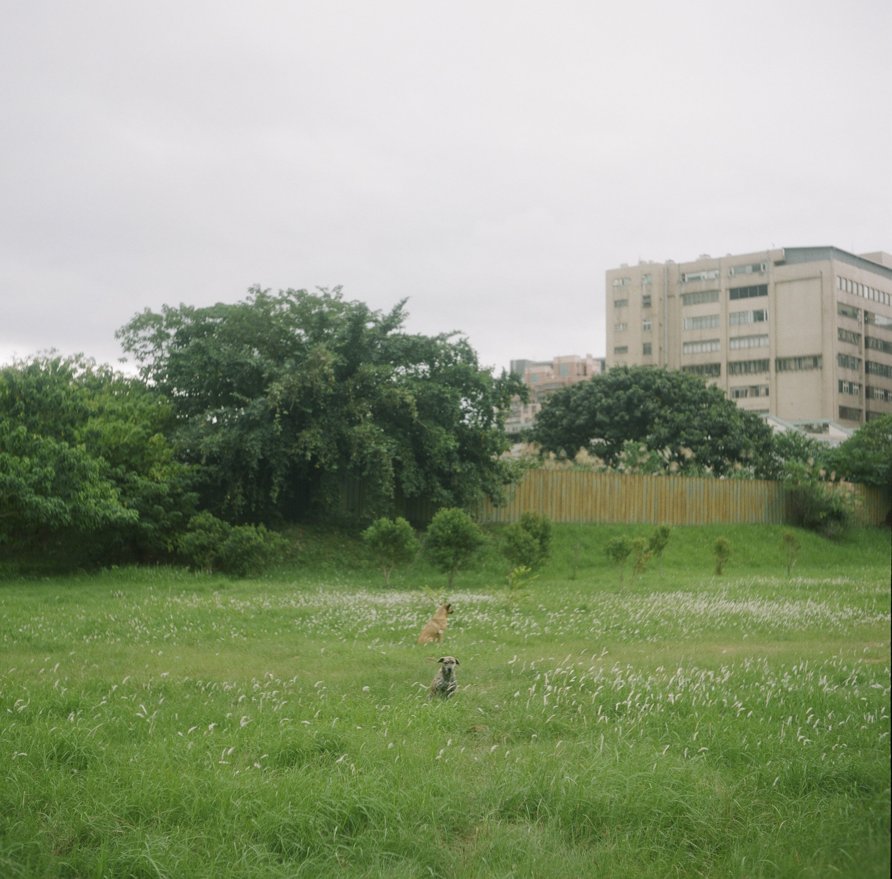 某天路上經過一處還在等待建商開發的空地,長滿了草,因為有用鐵絲網圍起來的關係,一般人無法進入,因此變成了狗兒們獨享的秘密基地。