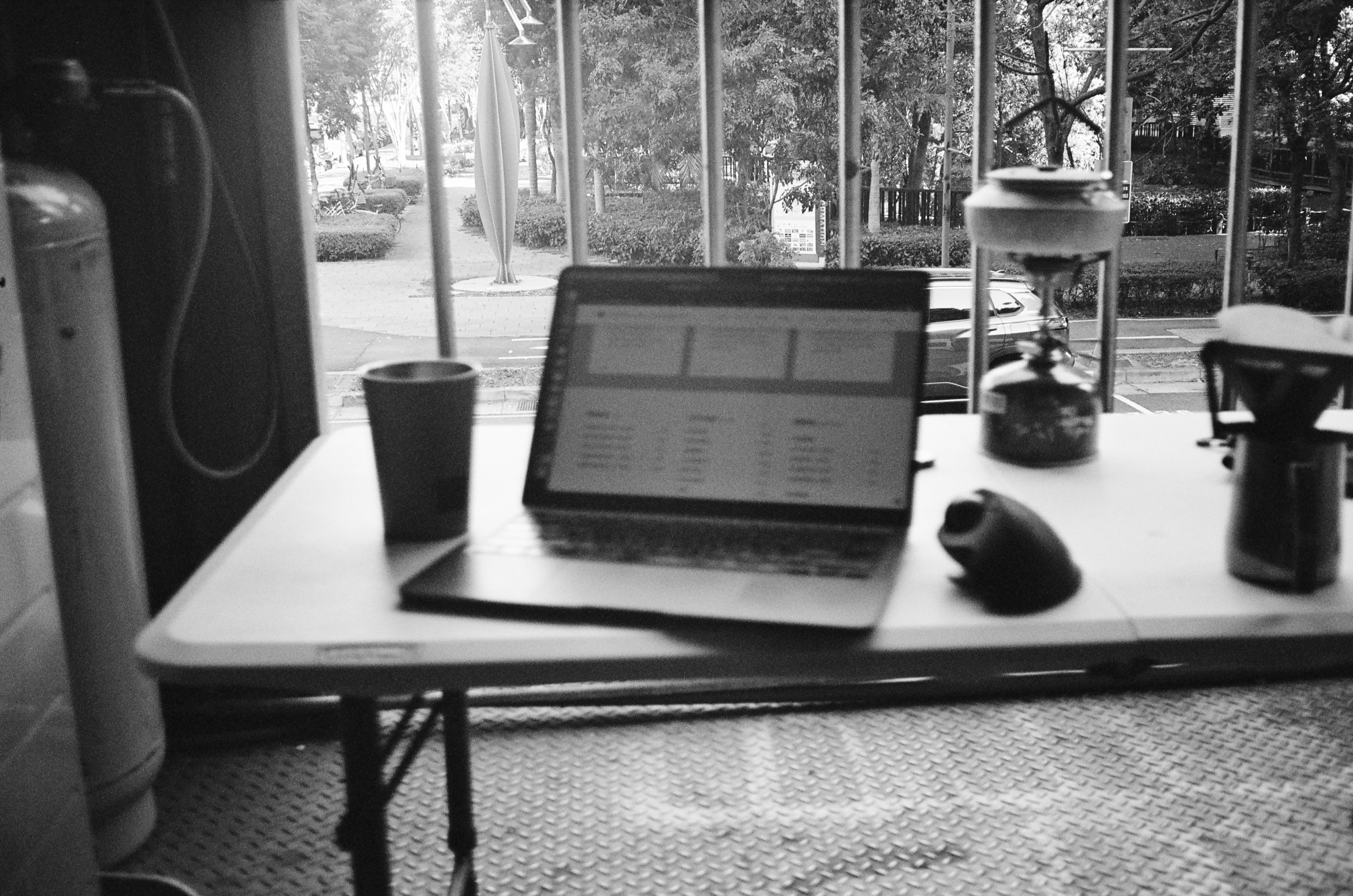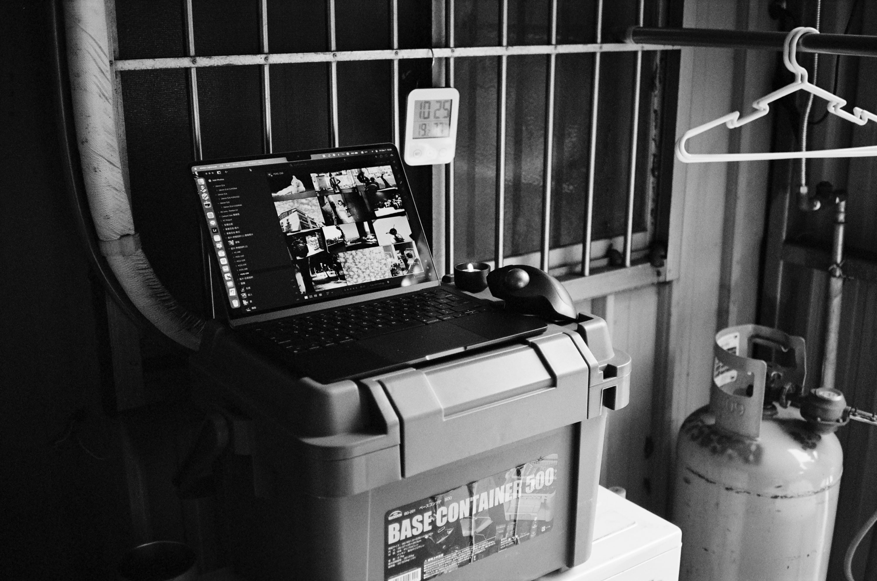 那幾天的工作台。因為在陽台工作久了會腰痠背痛,所以需要切換到站立工作一下,我就拿了一個露營用的裝備箱充當一下桌子了。