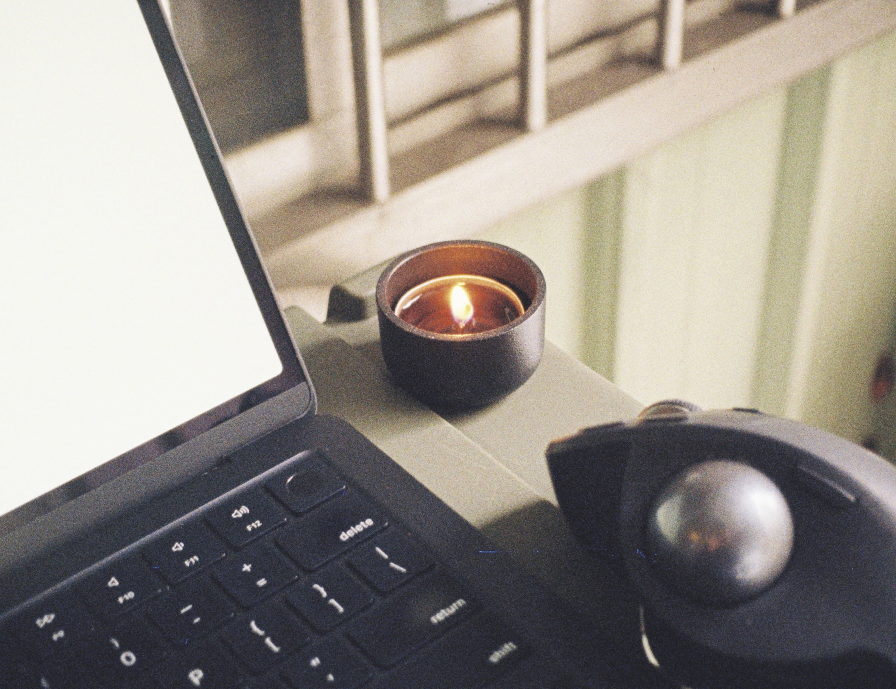 這是最近我的室外工作台,桌面上的一個 Ikea 小燭台,我正在測試用 Pentax Auto 110 24mm f2.8 這顆鏡頭拍攝特寫,看這景深與散景,應該是 f2.8 光圈全開了。